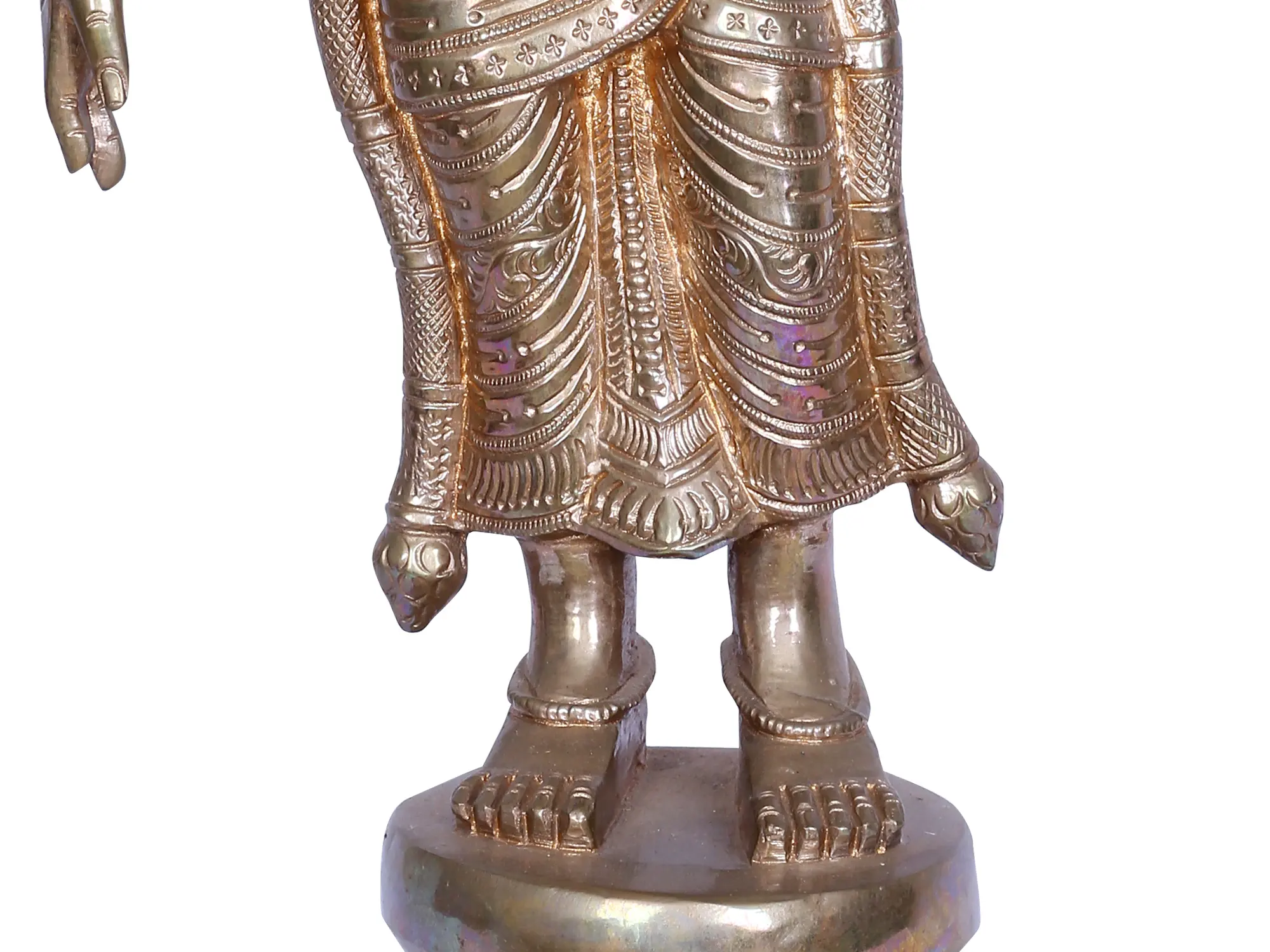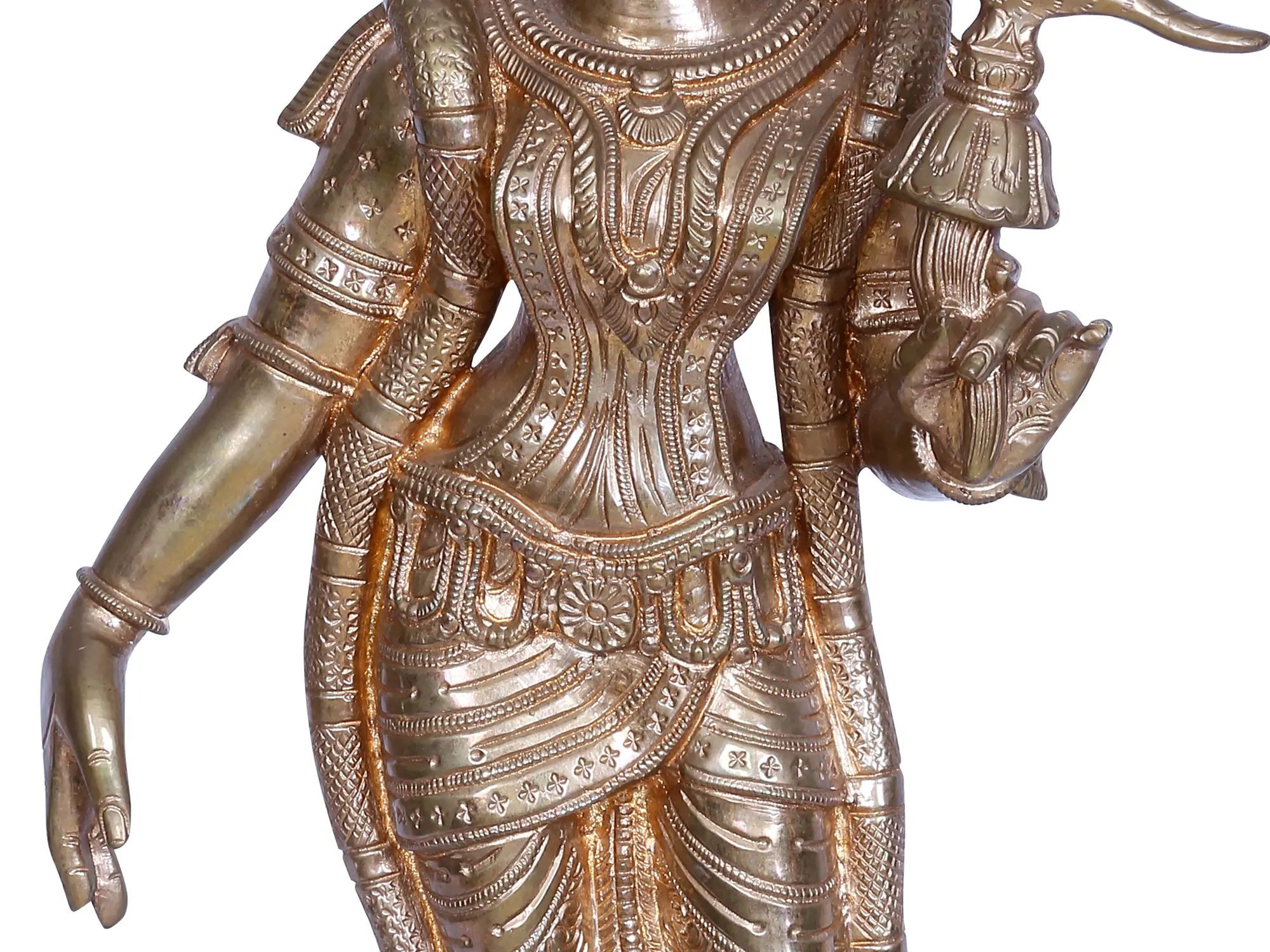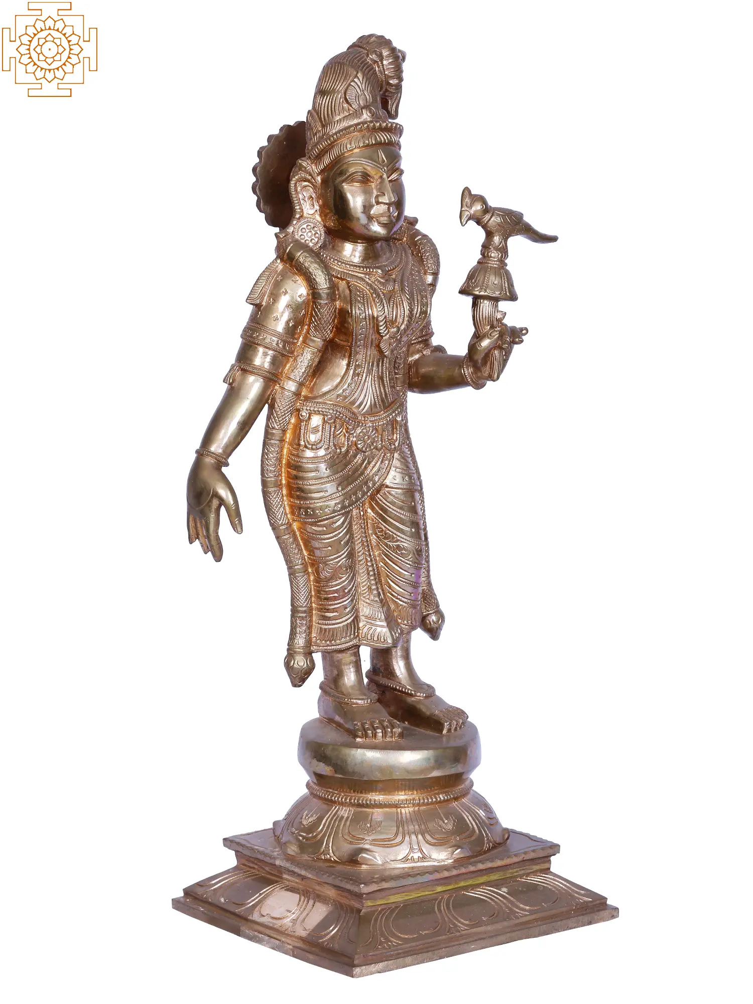 In this bronze rendition, Goddess Andal, “the ethereal Kothai Naachiyaar”, stands as the lone female Alvar in the celestial tapestry of the 12 Alvar saints of South India. Her presence is a divine dance, a symphony of jasmine-adorned tresses cascading in regal allure. Cloaked in resplendent attire, a fragrant garland graces her form, and a lotus cradles a parrot in her delicate hand. Worshipping this divine form weaves a sacred thread, intertwining mortal souls with the ethereal. It signifies an odyssey into the mystical realms, an ascent toward spiritual enlightenment, and a harmonious communion with the transcendent beauty embodied by Andal—a beacon guiding hearts through the celestial choreography of devotion.