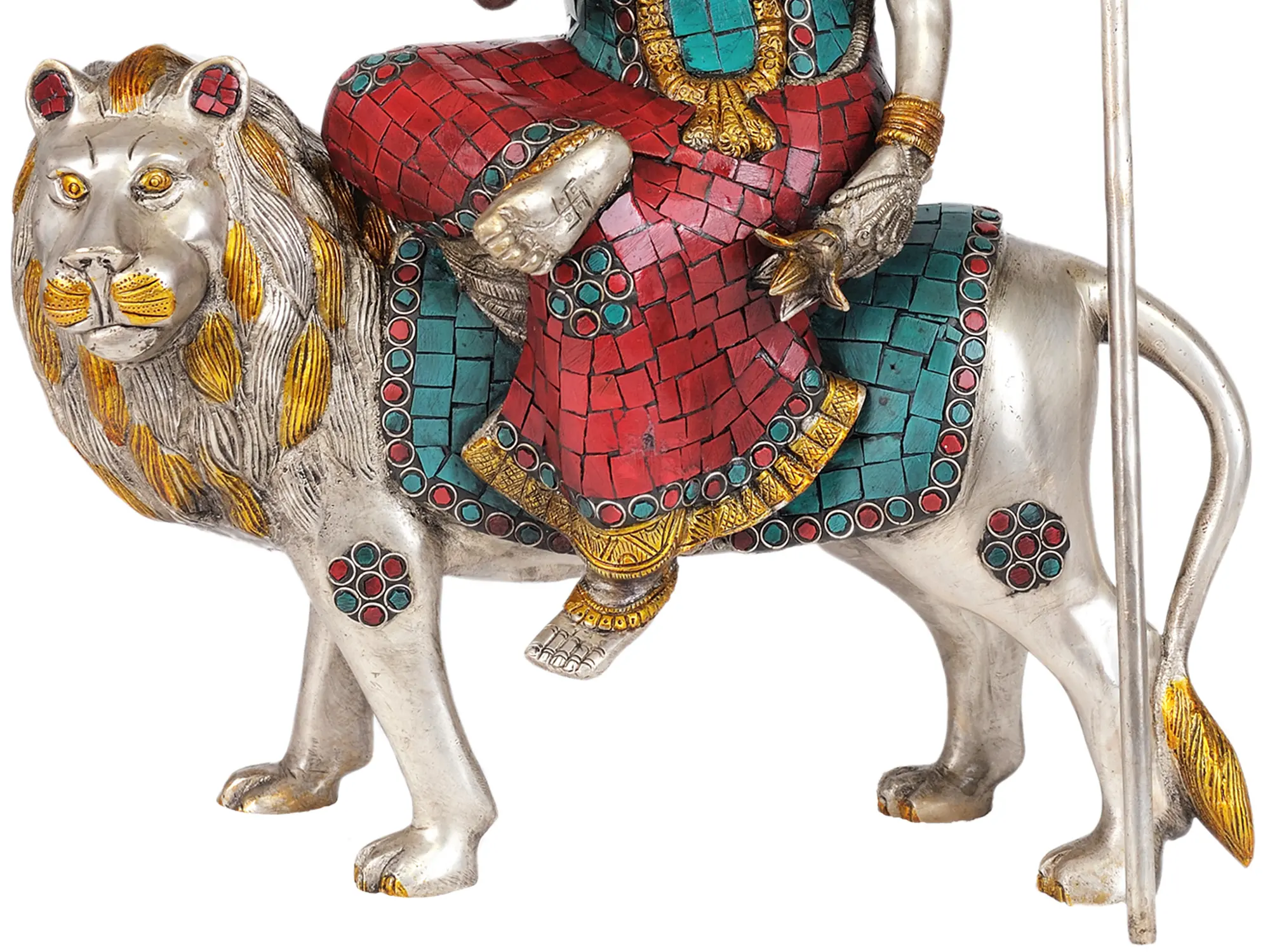 Goddess Durga (Finely Handcrafted Statue with Inlay work) is an awe-inspiring brass sculpture of Goddess Durga that exudes a divine aura, beautifully embellished with coral and turquoise gemstones. Mounted atop a regal lion, she symbolizes courage and fearlessness. The intricate inlay work on her form represents her infinite powers infused with nature's elements. With multiple arms, each holding various weapons, Durga epitomizes the triumphant slayer of evil forces, restoring harmony and justice. As we observe her majestic presence, we are reminded of the unyielding strength within, urging us to face life's challenges head-on with valor and resilience, just as she vanquishes darkness with her radiance.