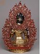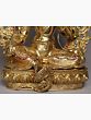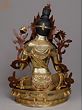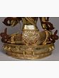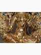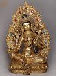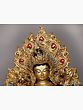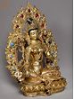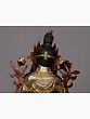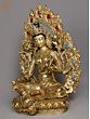 A sense of lavishness is endowed to the representation of goddess Green Tara, seen in this gilded copper Nepalese statue, highlighted in her fuller face, rich ornaments, and luxurious attire. The flow of spring is condensed in copper for the regal aureole of Tara, adorned with coral and turquoise pieces. A diaphanous scarf diagonally placed on her torso outlines the lithesome form of the goddess brilliantly. A balance between the movement of her flowing scarf and the stillness of her facial expressions has given this statue an aesthetic richness.