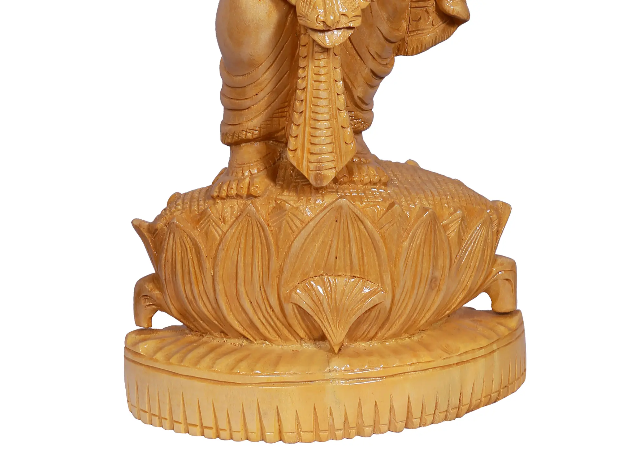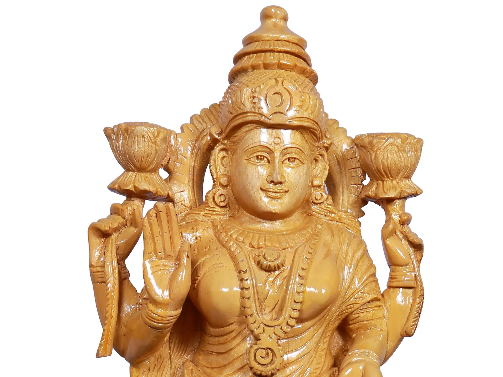 This wooden statue portrays Devi Lakshmi, the benevolent giver of endless wealth, in a captivating way by encapsulating her regal aura in an appealing work of art. Devi Lakshmi, dressed in a gorgeous saree and decked with many jewels, such as a magnificent waist adornment with the Kirtimukha motif, is seen standing on a blossoming lotus. The early stages of creation, when Devi appears in Srishti as a wonderful mother, feeding her offspring with both material and spiritual plenty, are symbolized by the two flowering lotuses in her hands.