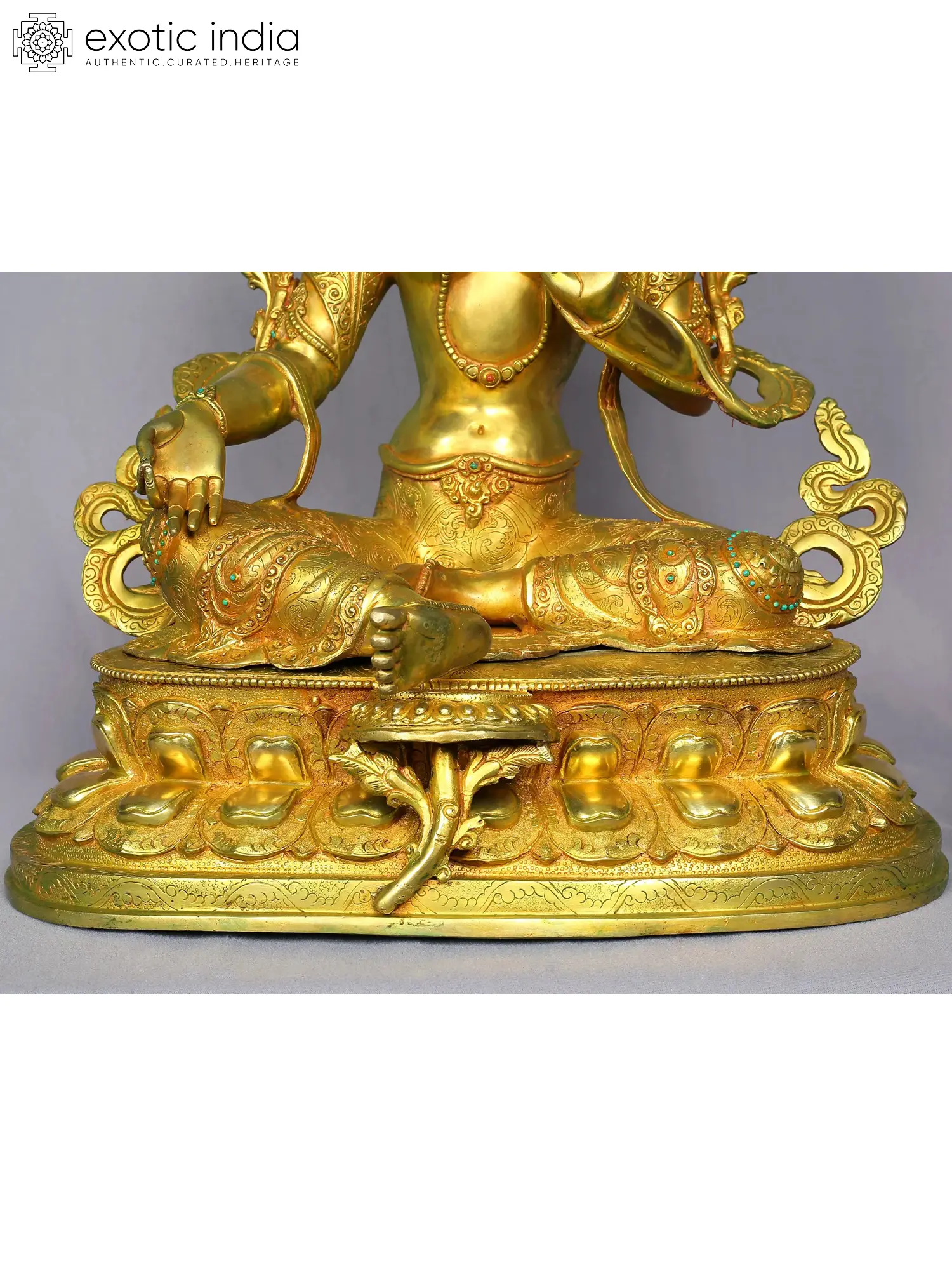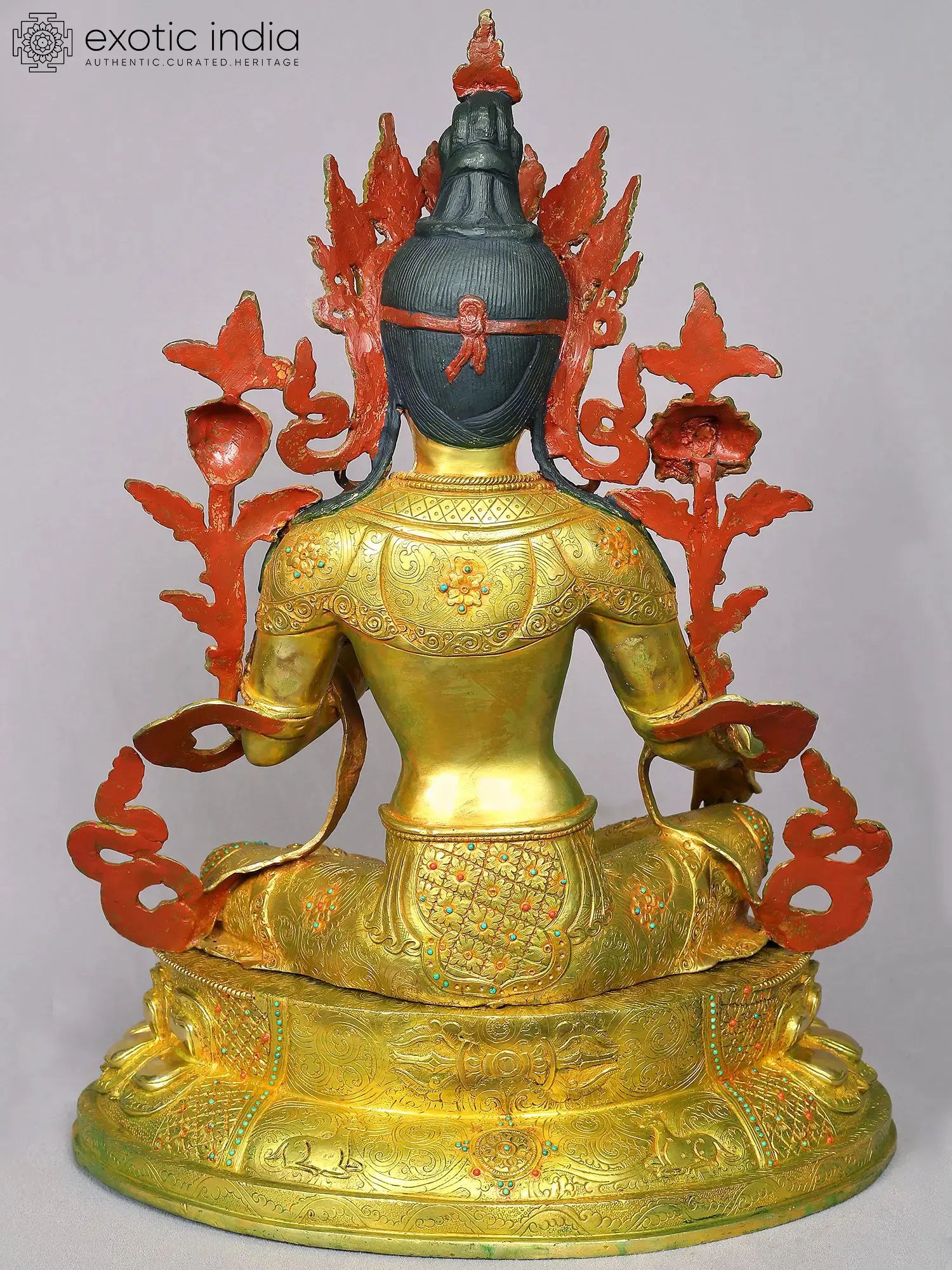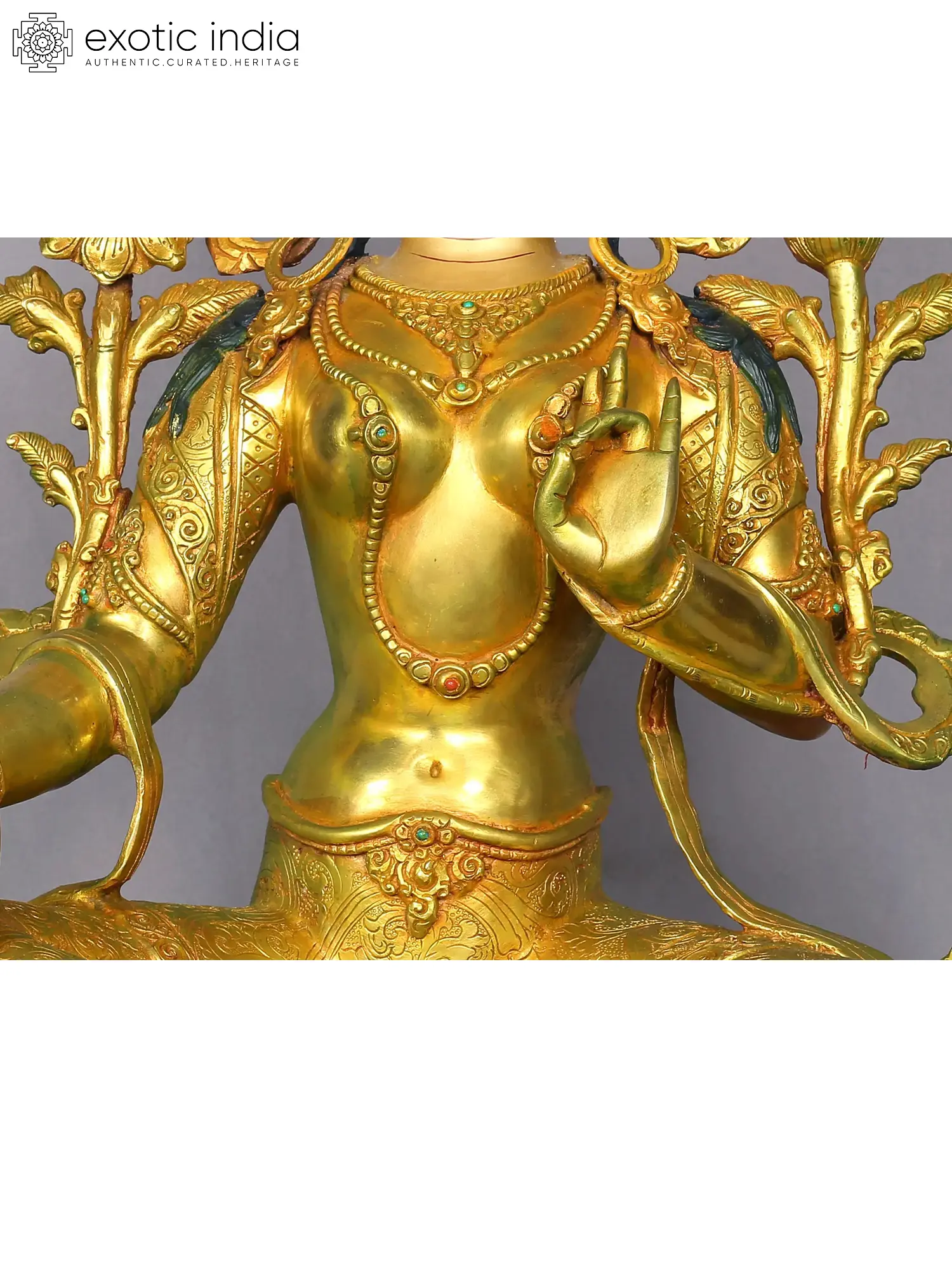 Dressed in a queenly brocaded dhoti with ethnic patterns, ornamented by jewelry chosen from features of traditional Nepalese statues, Green Tara here is a vision of the Buddhist ideal of divine maternal virtues. Mirroring the suppleness of Tara’s physique, the flowers and scarf in the statue curve and flow on her side, instilling the composition with scenic beauty. The inverted lotus throne on which Green Tara is placed has been meticulously designed, with the footrest for the goddess, who is swift and compassionate in her action.