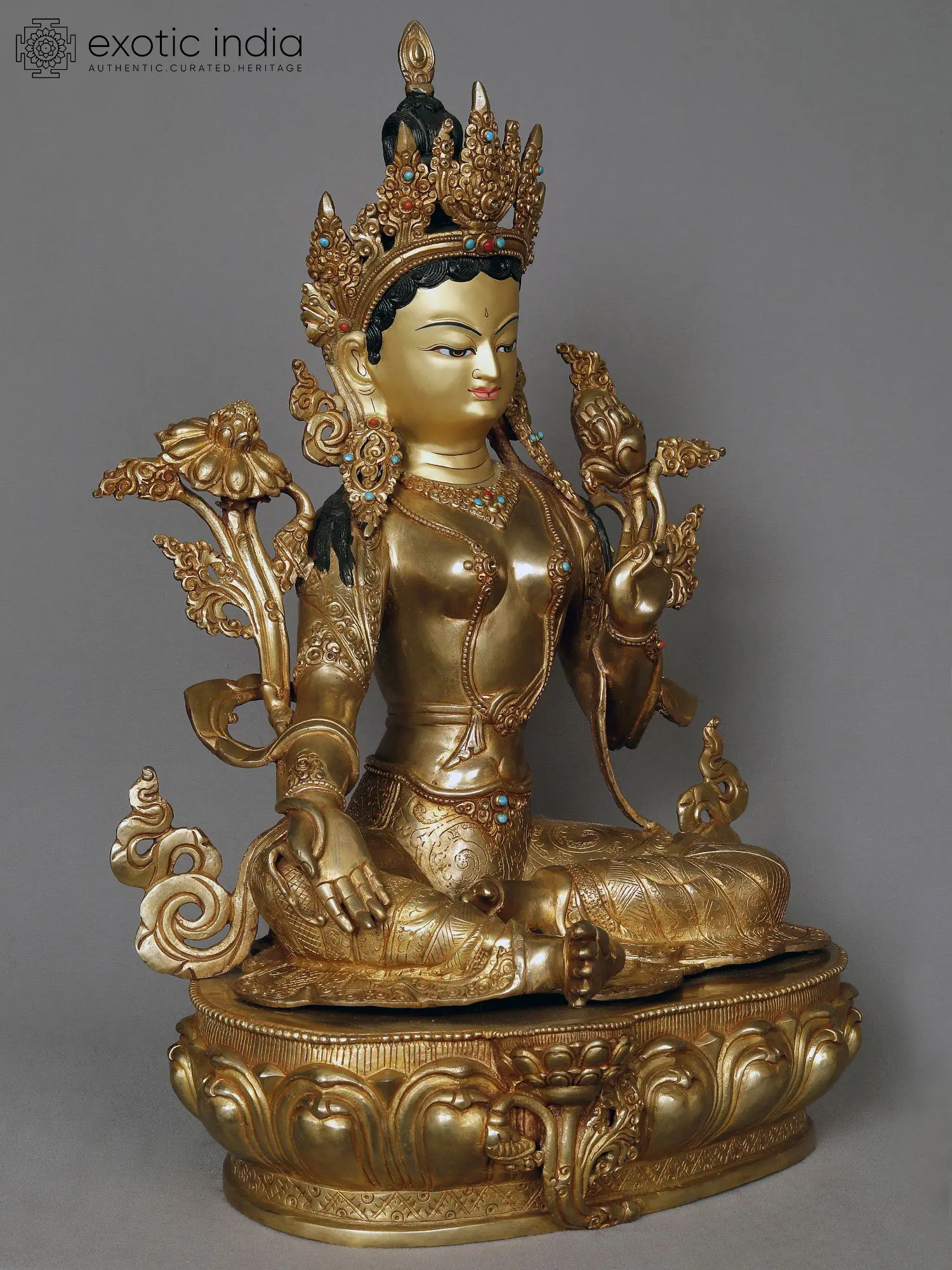 This magnificent sculpture portrays Tara in her popular form, seated in the traditional lotus posture, symbolizing spiritual discipline and the blossoming of enlightenment. Her posture is one of serene repose, yet her gaze is filled with loving-kindness, inviting devotion and contemplation. In her left hand, she holds the stem of a lotus flower, a potent symbol of purity and the ability to remain untainted by the defilements of the world. The right hand is shown in the gesture of *vitarka mudra*, the gesture of teaching or discussion, signifying her role as a guide and dispenser of wisdom. Adorning her regal form are intricate ornaments, including a multi-tiered crown, necklaces, bracelets, and anklets, all rendered with remarkable detail. Small, precious turquoise and coral stones are embedded within the golden filigree, adding a touch of vibrant color and further enhancing the statue's divine allure.