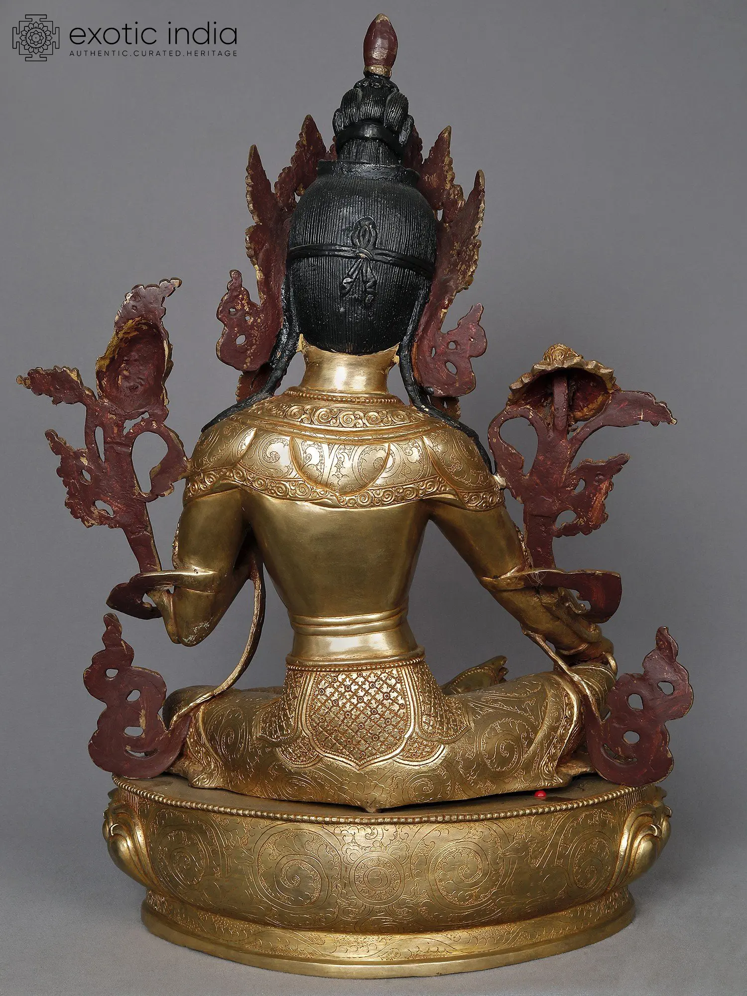Now comes the most important part of Nepalese art which is gold gilding. This is done by the traditional fire gilding method. A mixture of mercury and 18K gold is applied on the surface of the statue and heat is applied using a flame torch. The result is that mercury evaporates along with impurities, leaving a pure 24K gold finish.