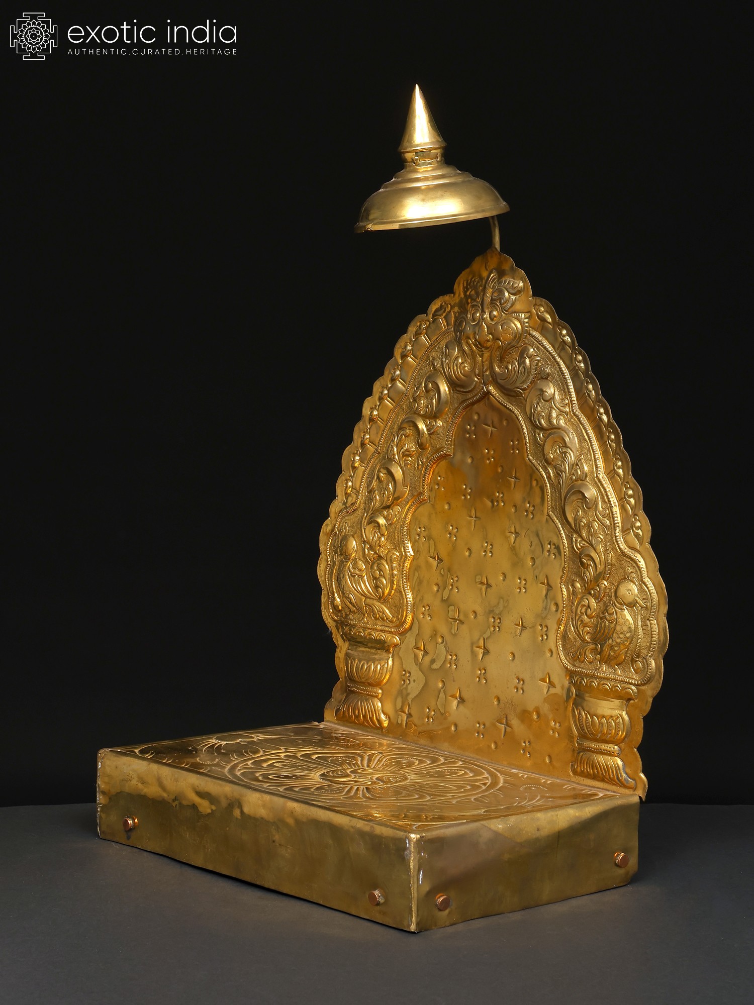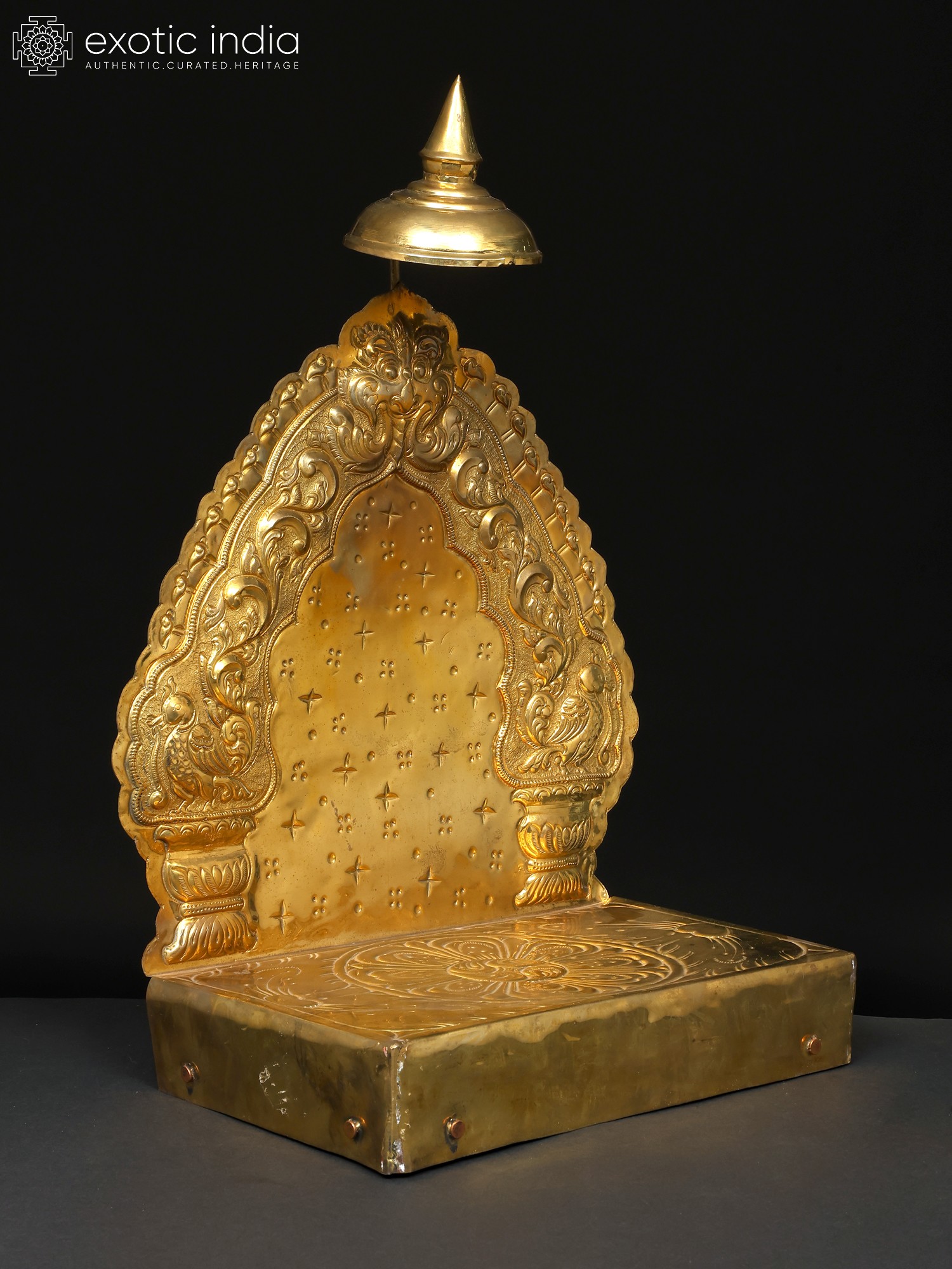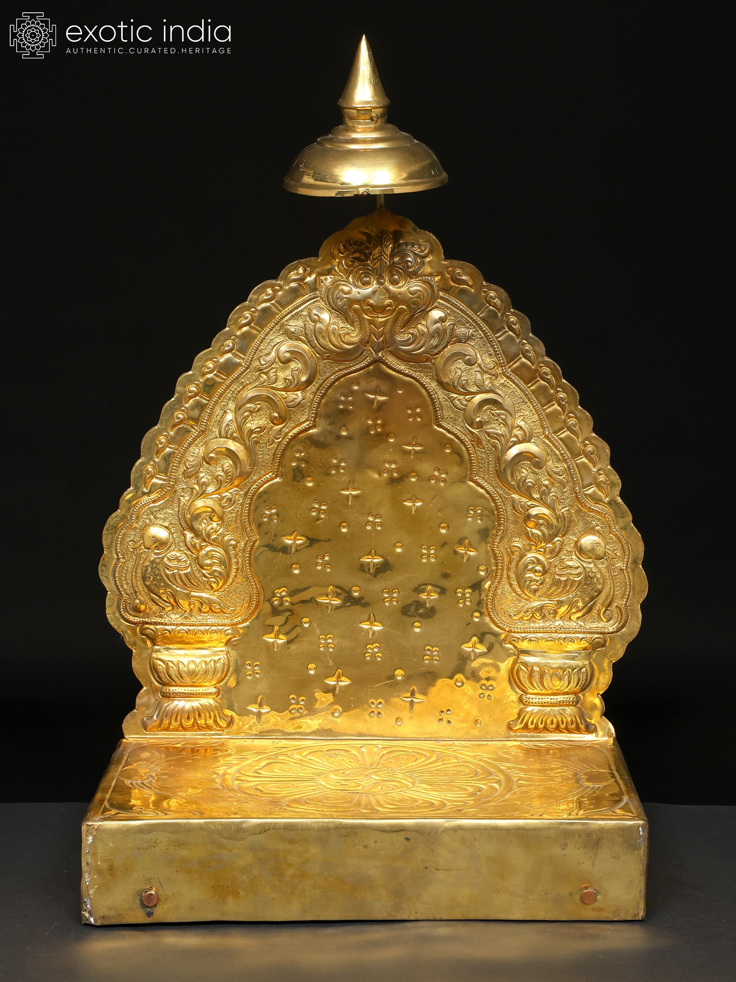This magnificent brass Singhasana, or throne, is a testament to the rich artistic heritage and profound spiritual devotion found in Hindu traditions. Crafted with meticulous attention to detail, it serves as a sacred seat for deities, gurus, or revered images within a puja room or temple setting. The warm, radiant glow of the brass evokes the auspiciousness and purity associated with divine worship, making it a focal point for prayer and meditation. Its substantial presence and intricate design speak to the importance of creating a worthy and dignified space for the divine.
