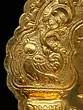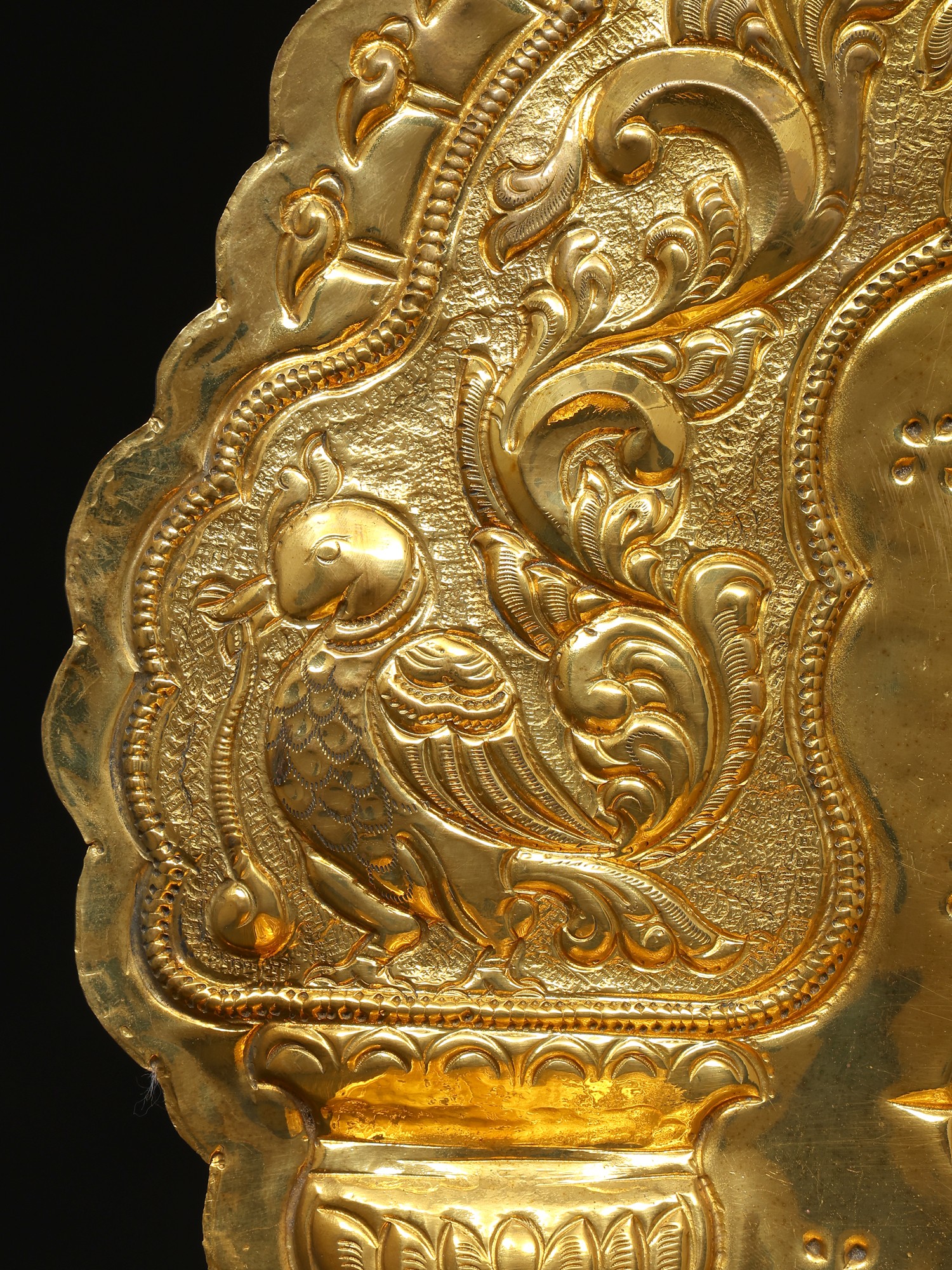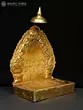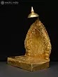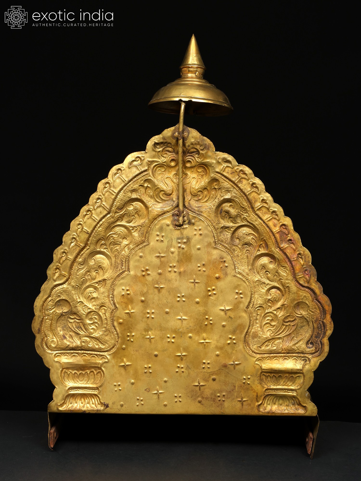 The craftsmanship evident in this brass Singhasana is truly remarkable. Each curve and detail is expertly rendered, showcasing the skill of the artisan. The upward-sweeping arch, reminiscent of temple architecture, is richly embellished with flowing floral patterns and mythical creatures, perhaps nodding to the celestial beings that accompany deities in their divine abodes. The two flanking pillars, sculpted to resemble blossoming lotuses, further enhance the sense of opulence and spiritual significance. The base of the throne is equally impressive, featuring a finely embossed floral design that adds to its grandeur. This piece is designed not merely to hold an idol, but to elevate the entire sacred space, imbuing it with an aura of sanctity and reverence. It is a beautiful embodiment of faith, designed to inspire awe and facilitate a deeper connection with the divine.