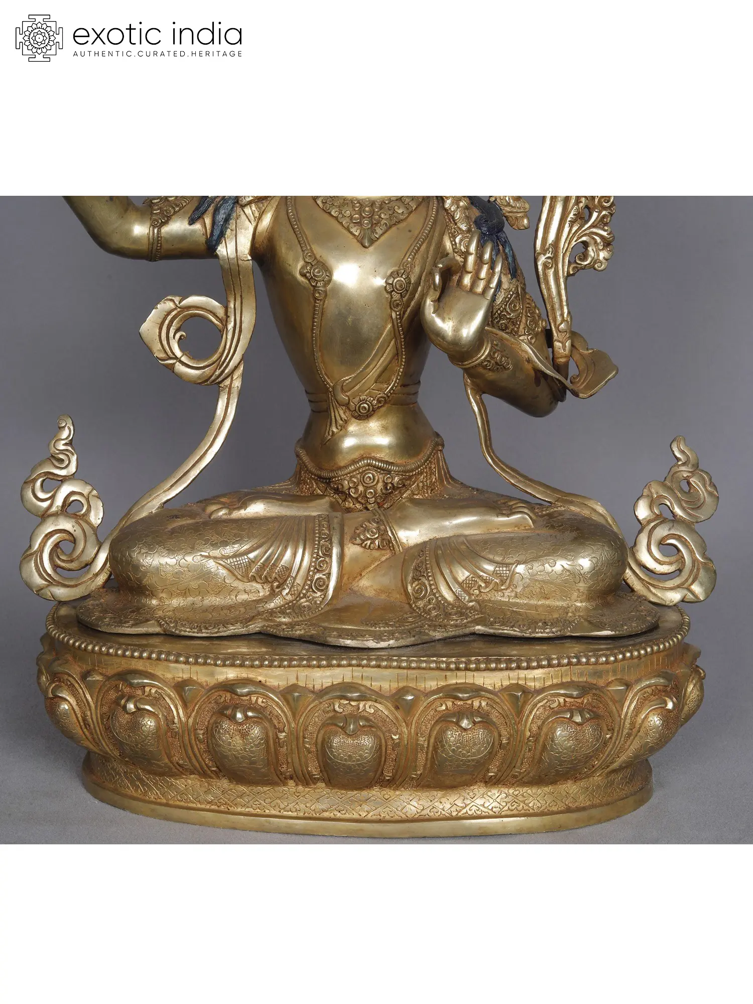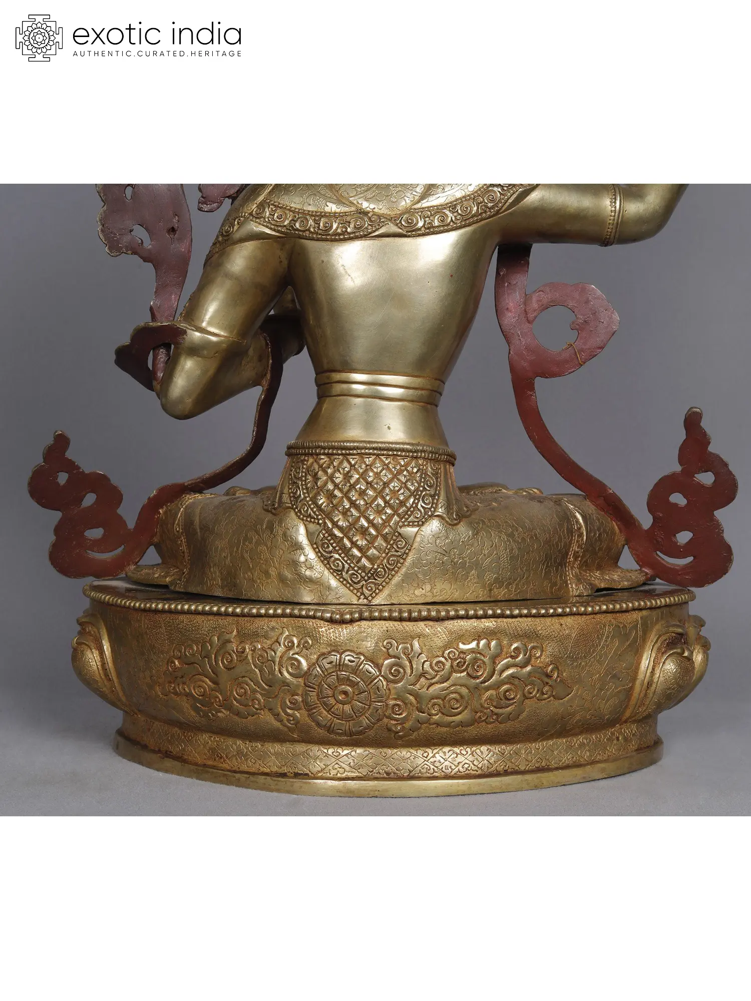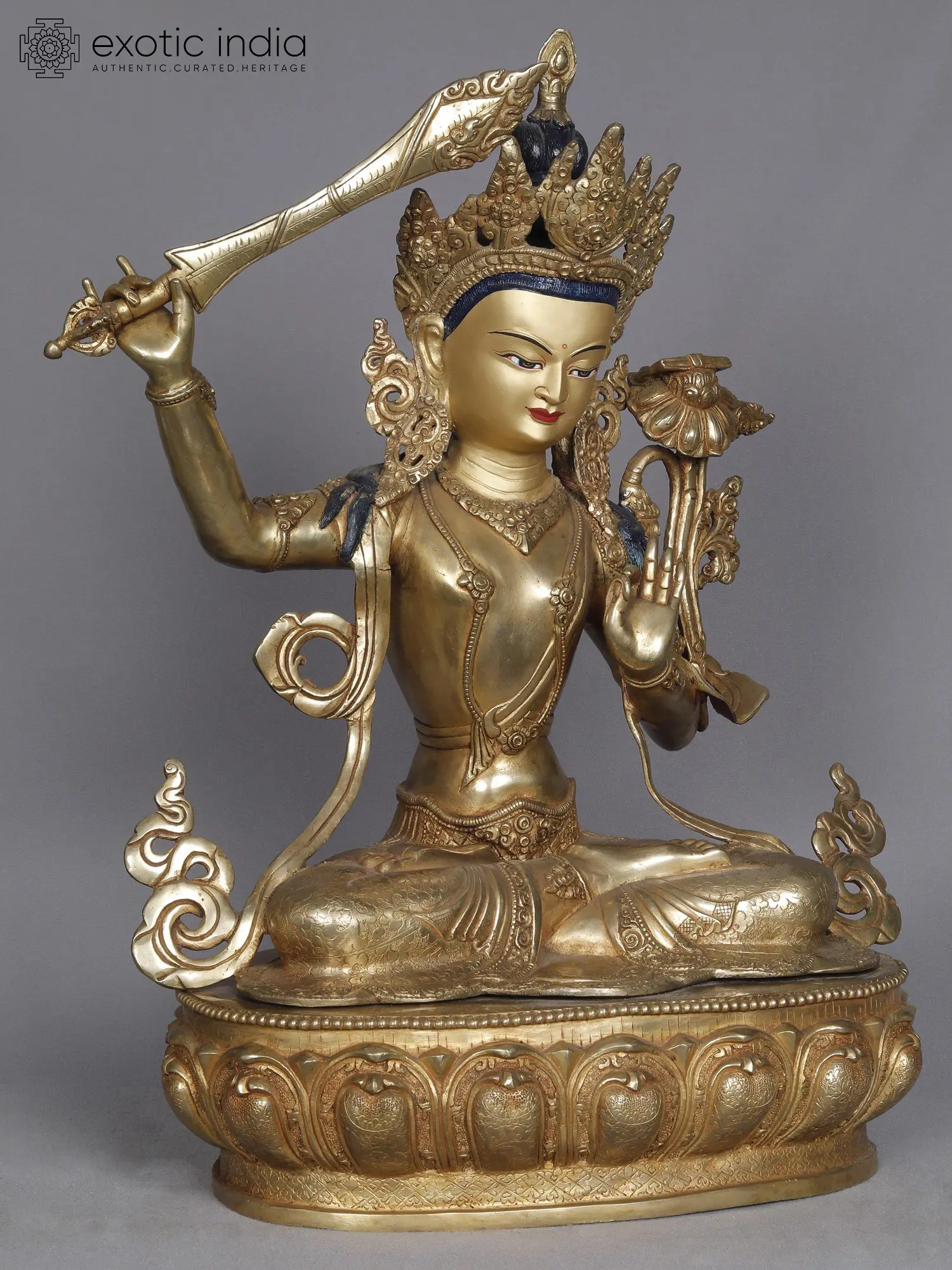 This magnificent statue portrays Manjushri, the Bodhisattva of Wisdom, in a captivating posture that speaks of profound knowledge and spiritual clarity. Crafted from copper with a rich golden finish, this exquisite piece hails from the artisanal heartland of Nepal, a land steeped in Buddhist tradition and artistic excellence. Manjushri, often depicted as a youthful prince, embodies the illuminating wisdom that cuts through ignorance and delusion, much like the sharp, celestial sword he brandishes in his right hand. This symbolic weapon is not meant for physical combat, but rather to sever the chains of misconception and illusion that bind sentient beings to suffering. ––––––––––––––––––––