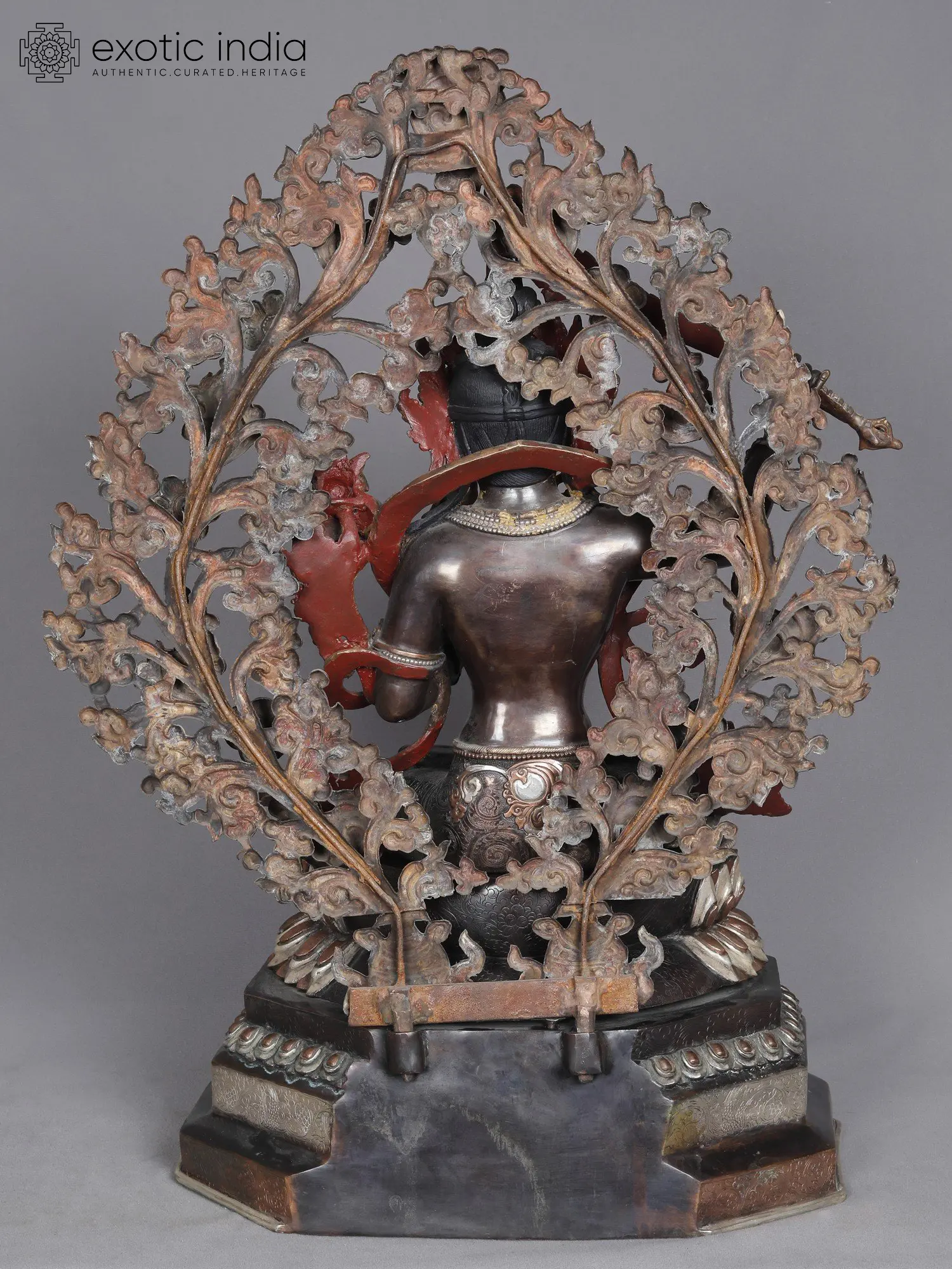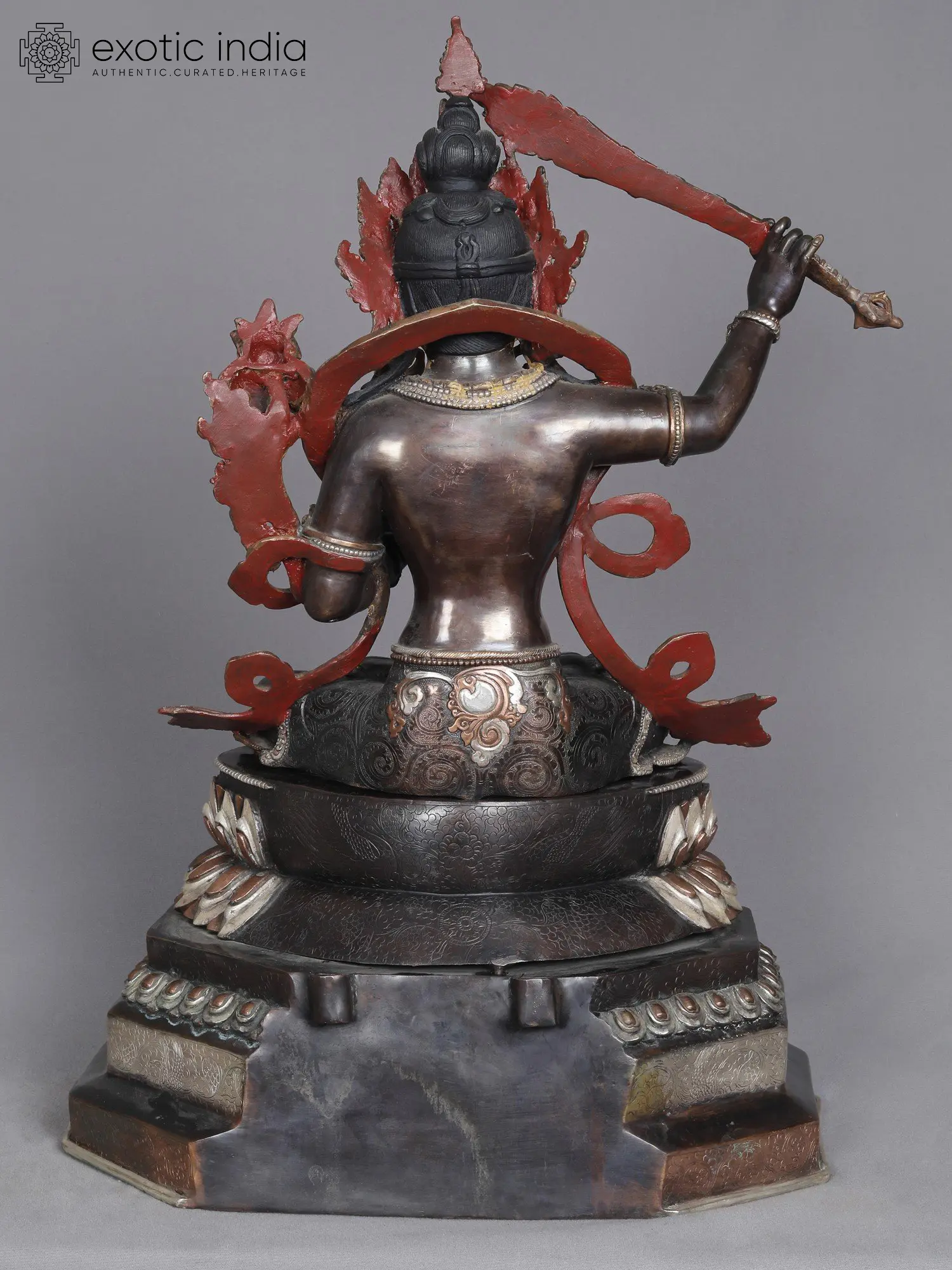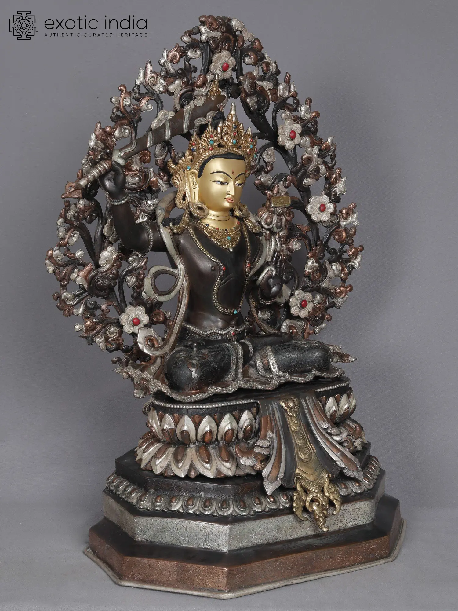 Bodhisattva Manjushri with his flaming sword and hand raised in the mudra of imparting wisdom enlivens the composition of his Nepalese statue with his divine form. On an octagonal platform, the lotus throne of Manjushri is placed, giving the statue a sense of grandeur. A web of floral vines surrounds the Bodhisattva, highlighting his life-affirming nature for the devotee. The benevolent visage of Manjushri is painted with a golden slip and is beautified by the Nepalese crown studded with precious stones. Enchanting the mind with his beauty, Manjushri drives away the fears and darkness of life.