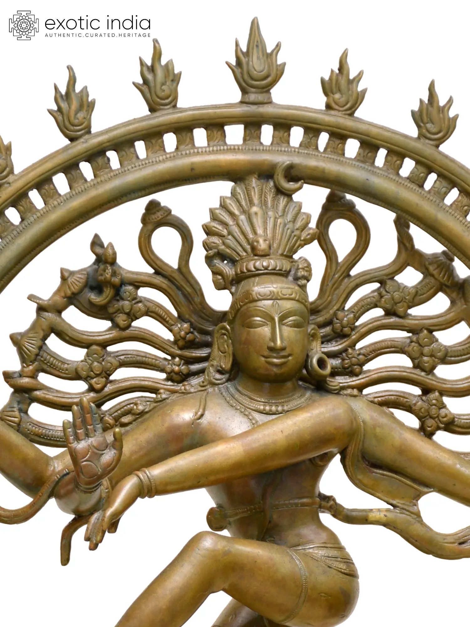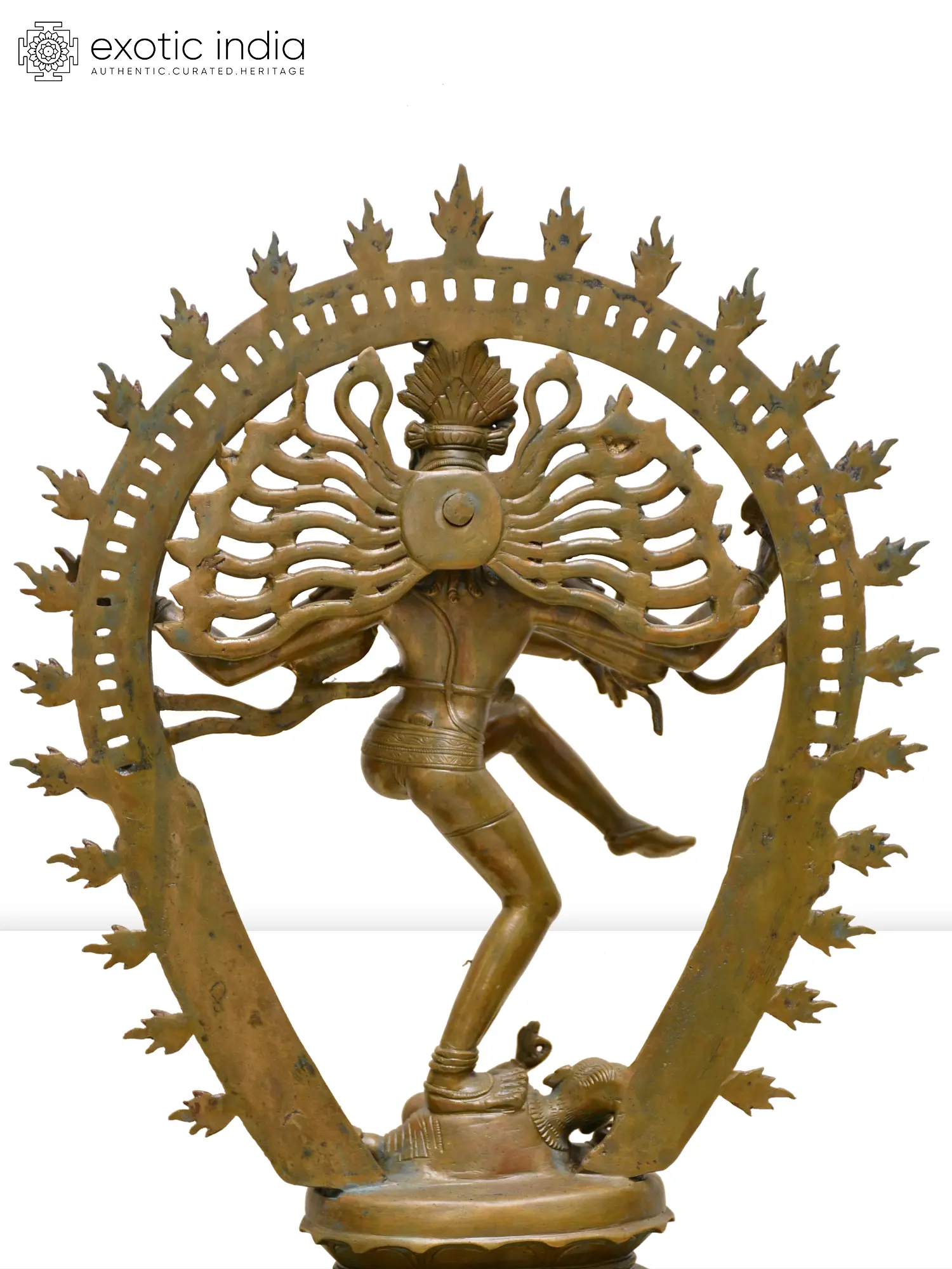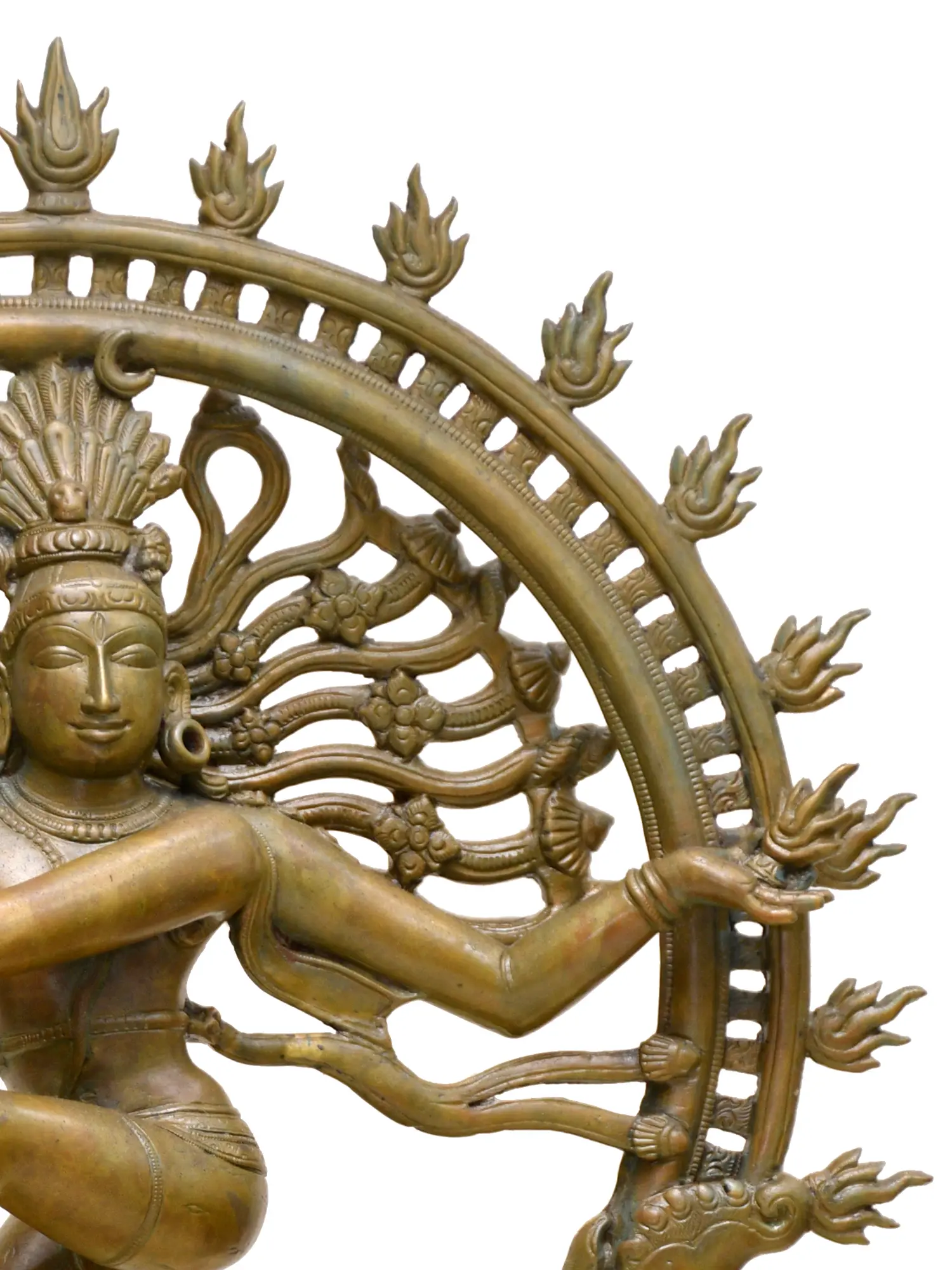 Emerging from the two-tiered pedestal that is Nataraja’s stage, a Makara-aureole surrounds the Lord of Dance, beautifed with fiery tassels that represent purifying energy that emanates from Shiva’s movement, annihilating and creating worlds.