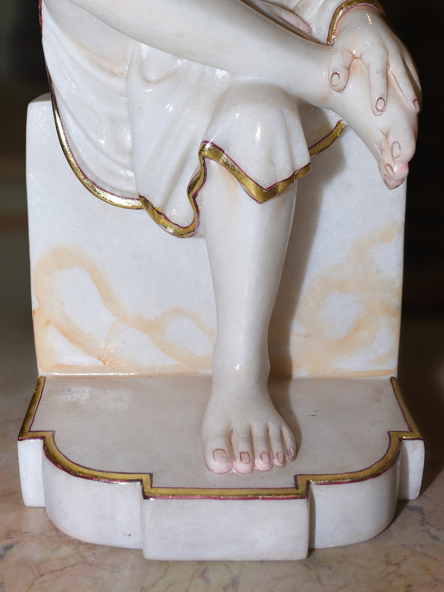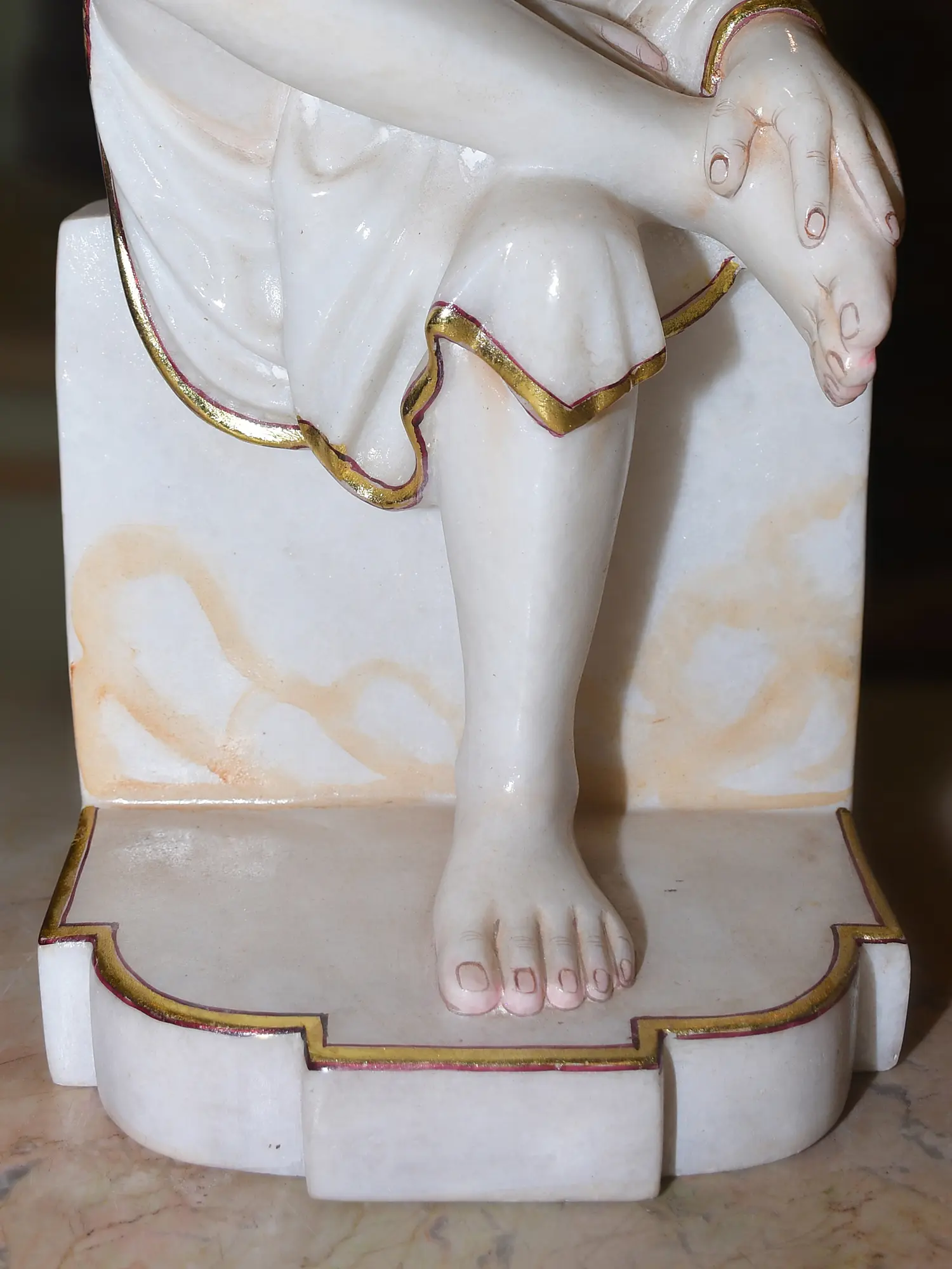 More than just a decorative item, this Orissa marble statue of Sai Baba serves as a powerful symbol of peace, solace, and spiritual guidance. Placing it in your home or meditation space can create an ambiance of tranquility and inspire a deeper connection to your inner self. It is believed that the mere presence of Sai Baba's image can invoke blessings, alleviate suffering, and foster a sense of hope and well-being. Whether you are a devout follower or simply appreciate the profound beauty and spiritual resonance of this iconic figure, this exquisite handmade Indian artwork is sure to become a cherished addition to your collection.