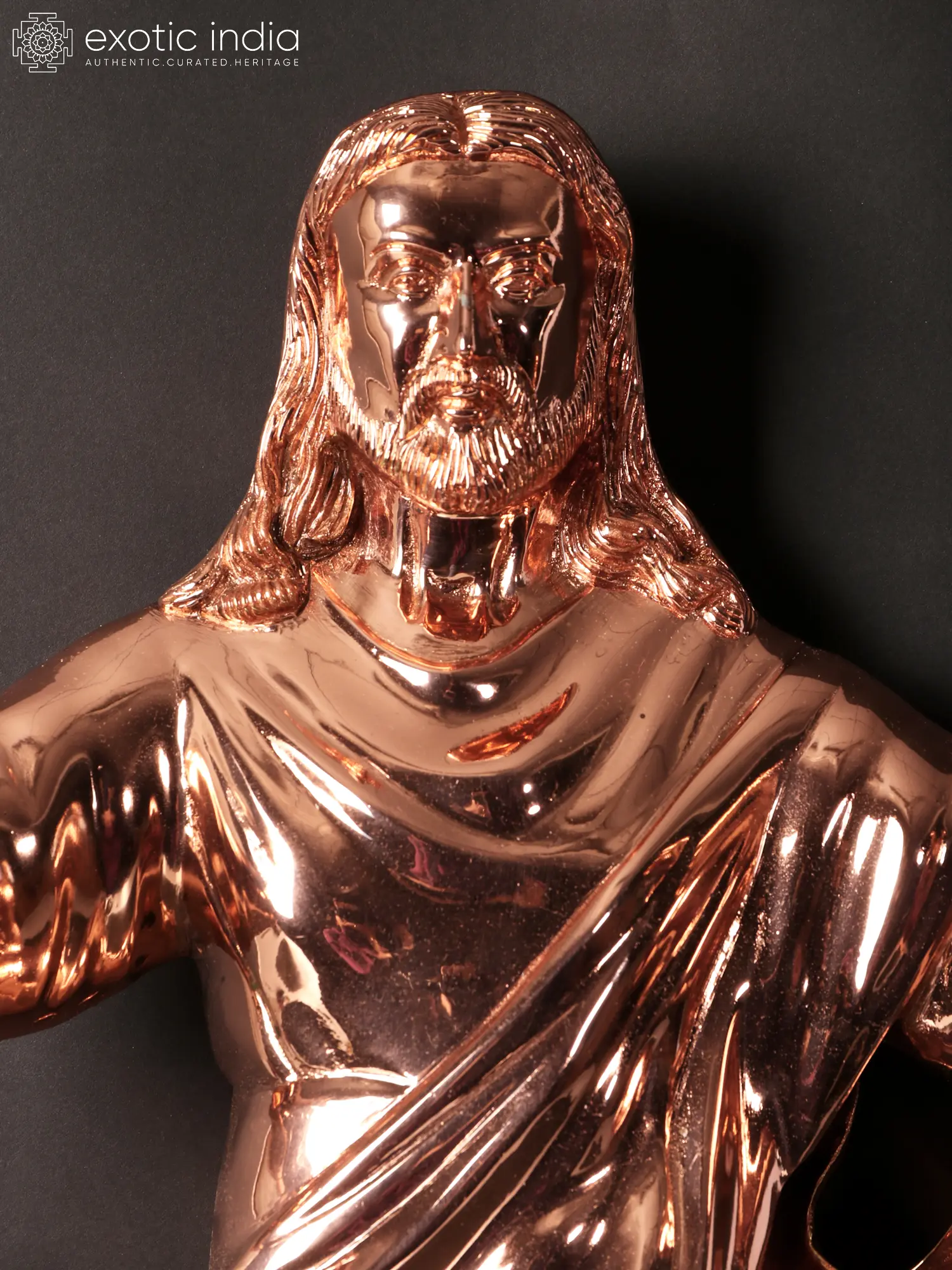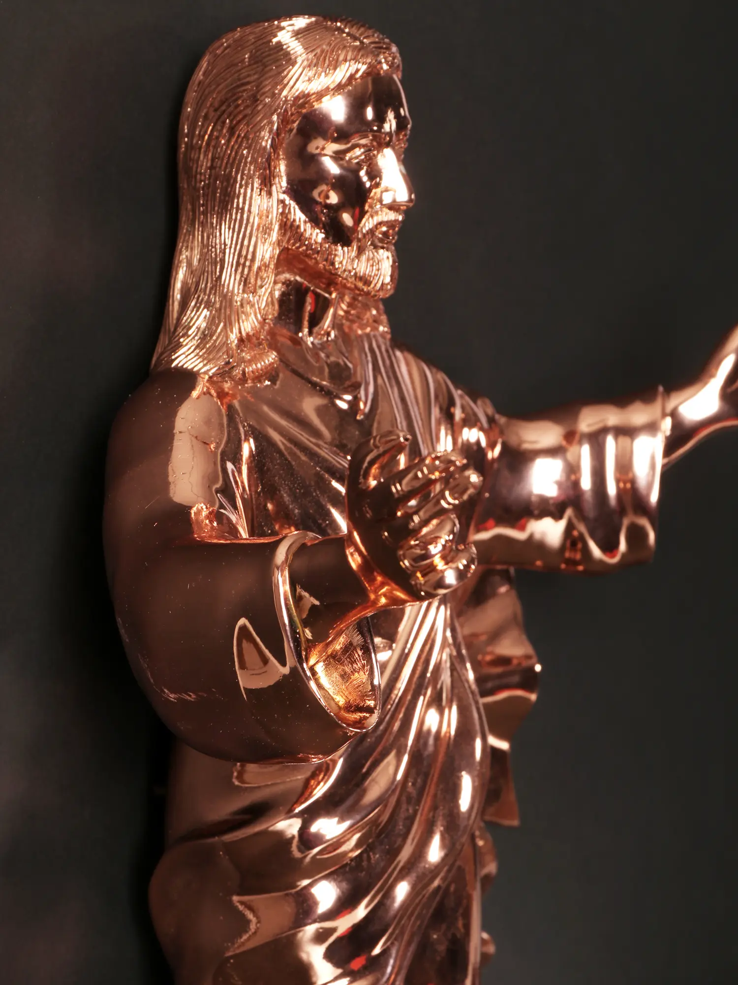 This Superfine Jesus Christ Statue, crafted in Brass and adorned with 24 Karat Rose Gold Plating, beautifully captures the biblical narrative where Jesus walked on water. The statue depicts a poignant moment, with Jesus’ walking towards the observer, one arm outstretched in a gesture of divine presence. The flowing robe, seemingly caught by the wind, adds a dynamic element, symbolizing the spiritual forces at play in the miraculous event.