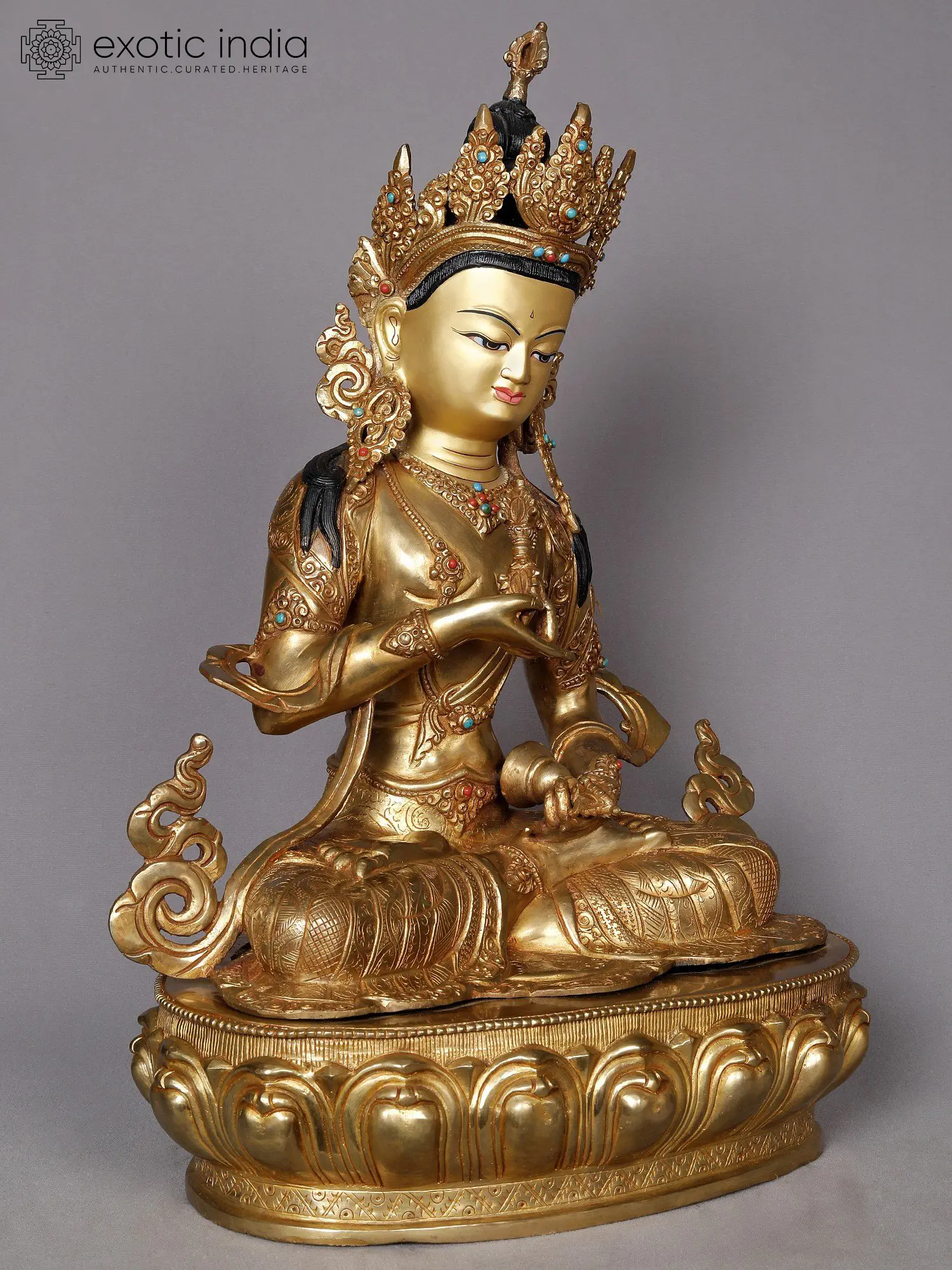 Crafted from lustrous copper and finished with a rich gold patina, this sculpture is a testament to the intricate artistry of Nepalese artisans. The seated posture, known as vajrasana or lotus position, signifies the serene contemplation and profound meditation practiced by enlightened beings. Vajrasattva is adorned with a resplendent crown and exquisite jewelry, symbolizing his supreme spiritual authority and the celestial adornments of Buddhahood. The detailed rendering of his robes, accented with delicate patterns, speaks to the meticulous attention to detail and the spiritual significance imbued in every element of the sculpture. He holds the vajra scepter in his right hand, representing indestructible wisdom, and the bell in his left, symbolizing the wisdom that understands emptiness. These potent symbols are crucial in understanding the profound teachings of Vajrayana Buddhism.
