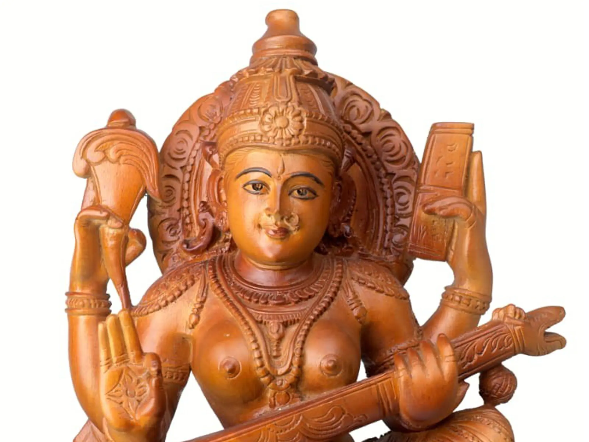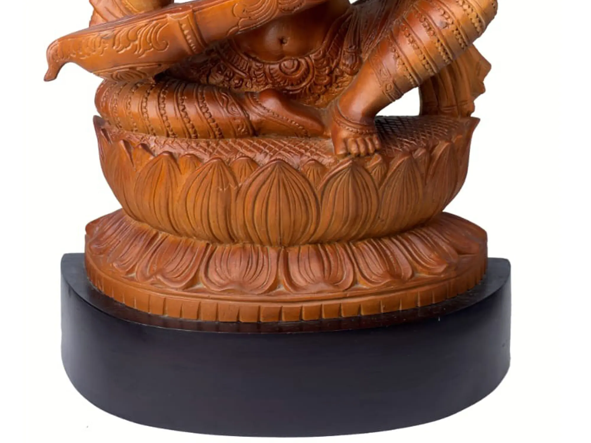 Crafted from high-quality wood, this statue is a testament to traditional artistry. The choice of wood, known for its durability and ability to hold intricate carvings, ensures that this piece will be cherished for generations. The natural grain and smooth finish highlight the natural beauty of the material, while the detailed sculpting brings the divine form to life. The overall aesthetic is one of grace, serenity, and profound spiritual significance, making it an ideal gift for those who appreciate fine art and deep cultural heritage. Place this magnificent representation of Goddess Saraswati in your home or meditation space to invoke her blessings for wisdom, creativity, and a life filled with learning and artistic expression.