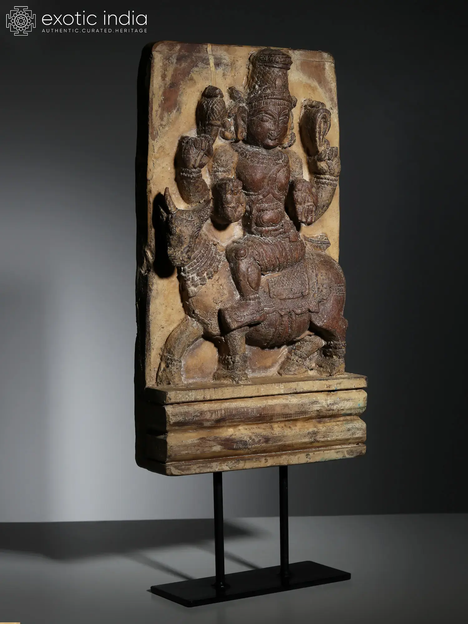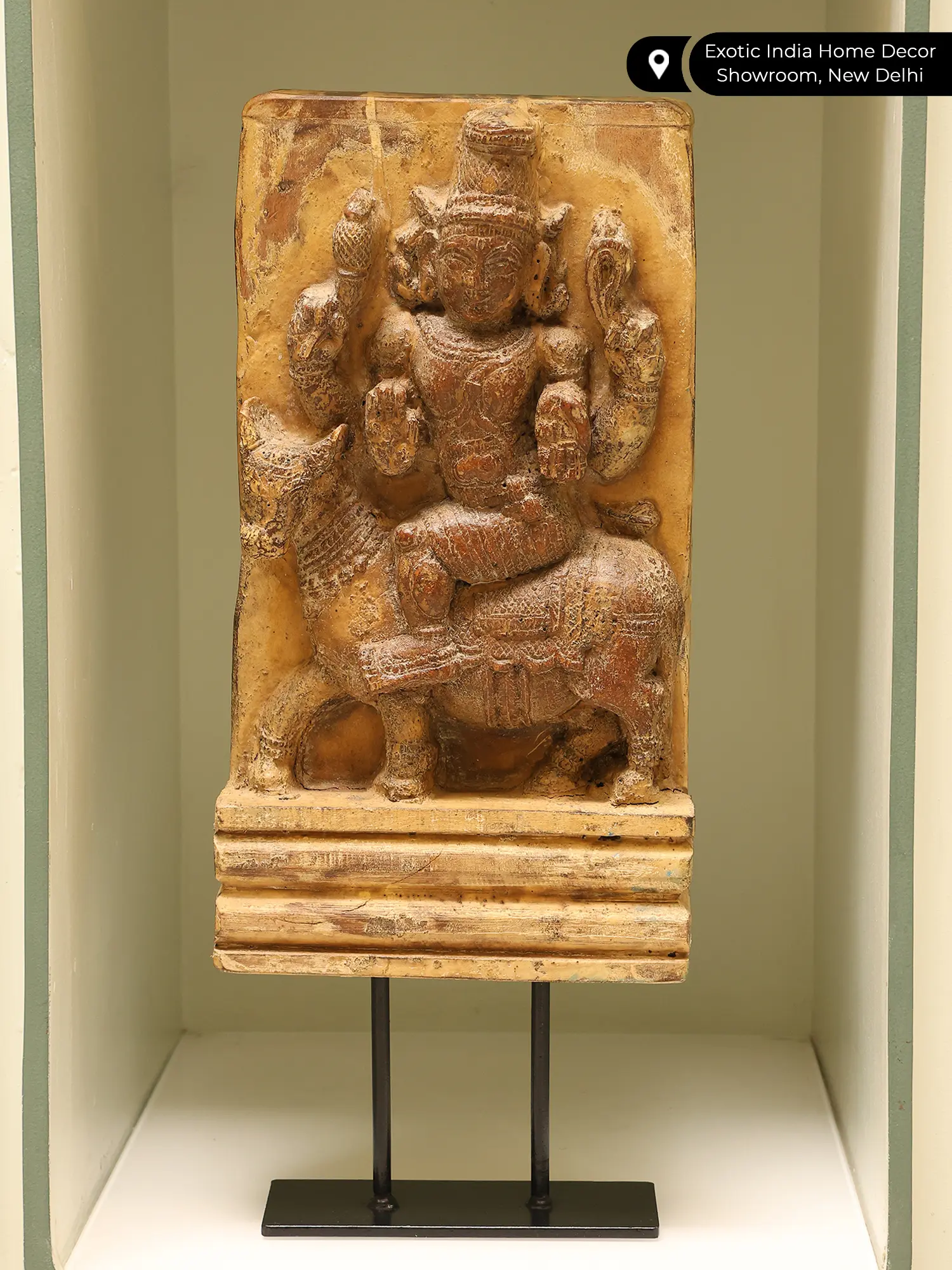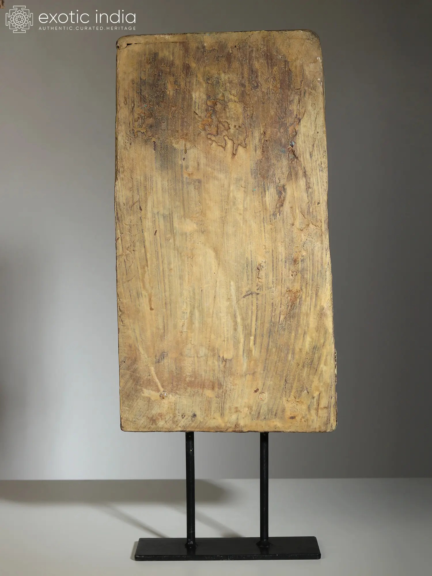 This Wooden Panel of Yama Image on Iron Stand is a captivating piece that reflects artistic finesse and cultural symbolism. The portrayal of Yama, the Hindu god of the dead, riding his buffalo vehicle while holding a mace and lasso, signifies his role in guiding departed souls. The Chaturbhuj form with mudras of Abhaya and Varada adds a spiritual dimension.