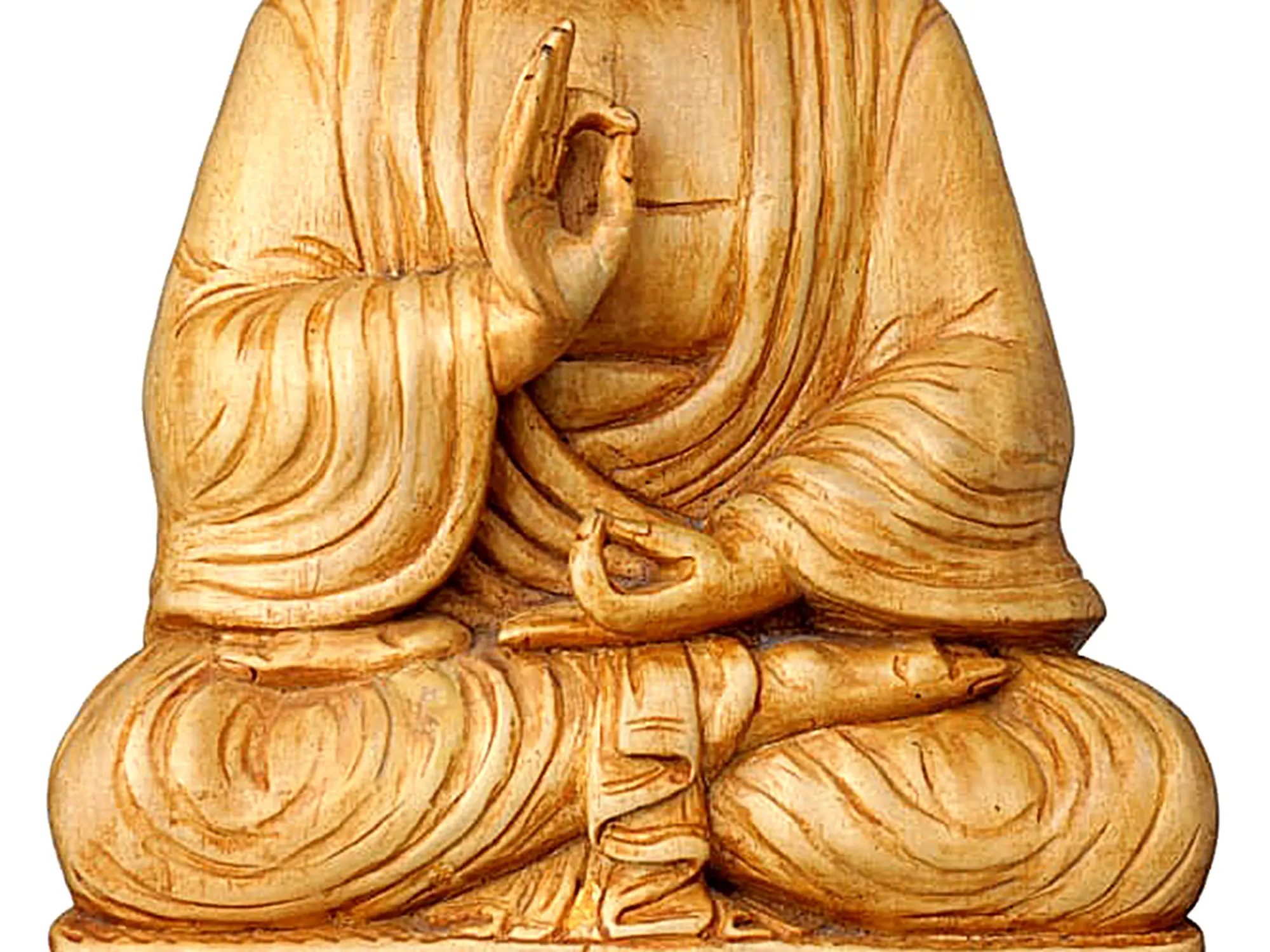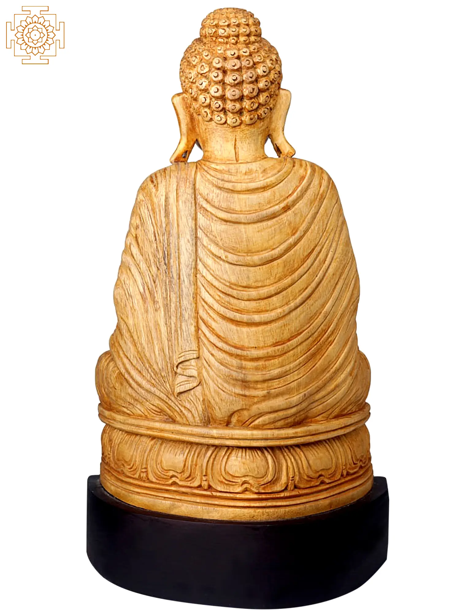 Originating from the rich artistic traditions of South India, this statue is a testament to the skilled craftsmanship that has been passed down through generations. The warm, natural hue of the wood lends an organic and grounded feel to the piece, evoking the simplicity and naturalness that are central to Buddhist philosophy. The finely carved robes flow gracefully, revealing the contours of the form beneath, and the serene expression on the Buddha's face is one of profound compassion and inner stillness. The base upon which the Buddha sits is equally artful, adorned with intricate patterns that add to the statue's aesthetic appeal and symbolic depth. This grounding element not only provides stability but also suggests the solid foundation of the Buddha's teachings upon which practitioners can build their spiritual lives. The presence of the Yuanjiao, a sacred mandala symbol often seen in Buddhist iconography, subtly embedded in the image, further enhances its spiritual resonance, inviting contemplation on the interconnectedness of all things and the path to cosmic harmony.