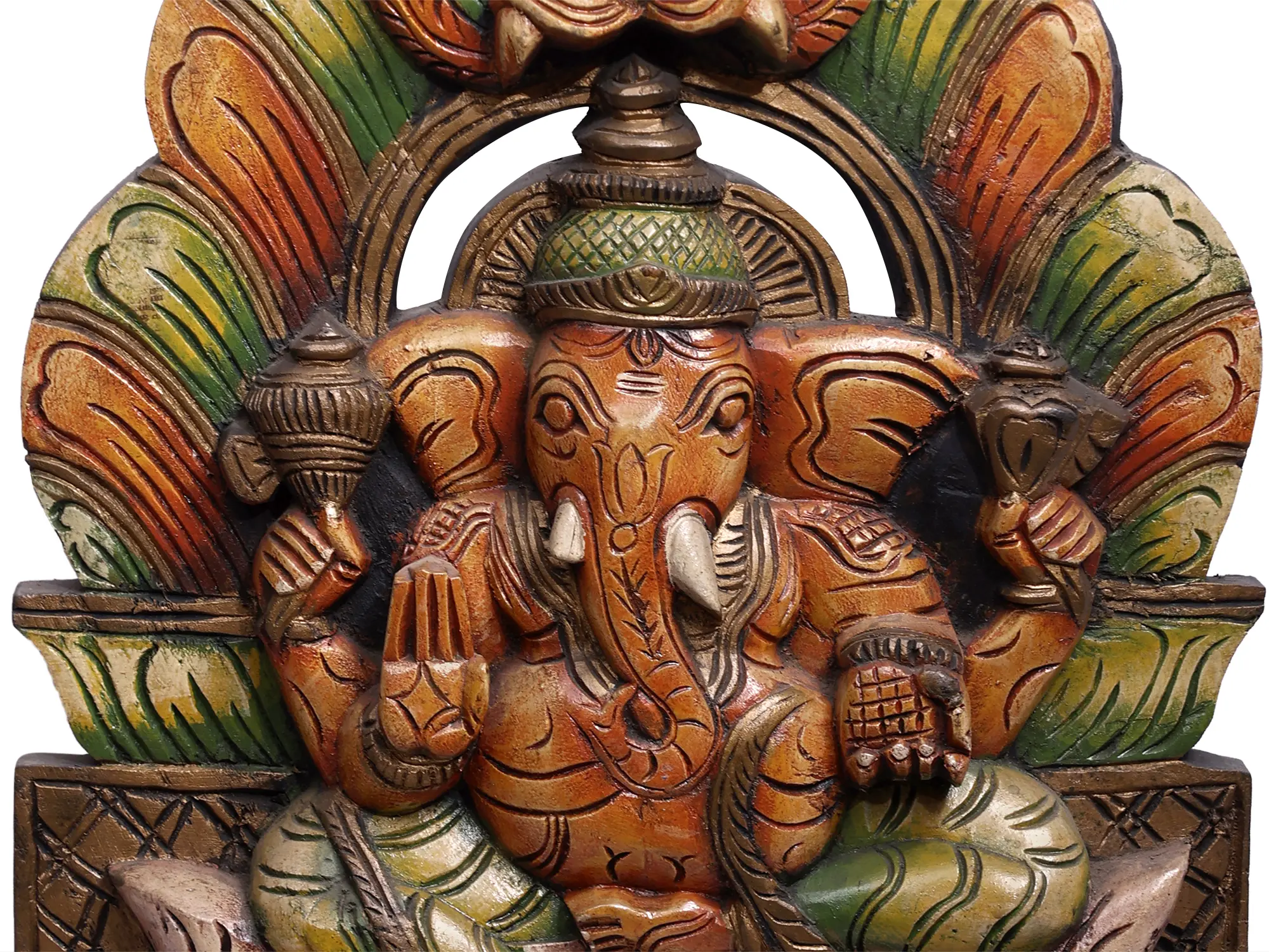 Invite the auspicious presence of Lord Ganesha into your dwelling with this exquisitely crafted wooden wall hanging. Standing at 19 inches tall, this piece captures the essence of wisdom, prosperity, and good fortune, making it a powerful focal point for any space. Lord Ganesha, the beloved elephant-headed deity, is depicted here in a serene seated posture, exuding an aura of tranquility and divine grace. His gentle gaze and benevolent expression are meticulously carved, reflecting the skill and devotion of the artisan. The intricate details of this artwork are truly captivating. Lord Ganesha is adorned with traditional ornamentation, and his four arms are posed to bless, bestow gifts, and hold symbolic objects, each carrying profound meaning. He is seated upon a lotus, a symbol of purity and spiritual awakening, resting on an ornate pedestal that speaks of divine royalty. The rich, hand-painted finish in warm earth tones, vibrant greens, and fiery oranges accentuates the natural beauty of the wood and adds a dynamic visual appeal. The craftsmanship is evident in every curve and contour, bringing the divine form to life.