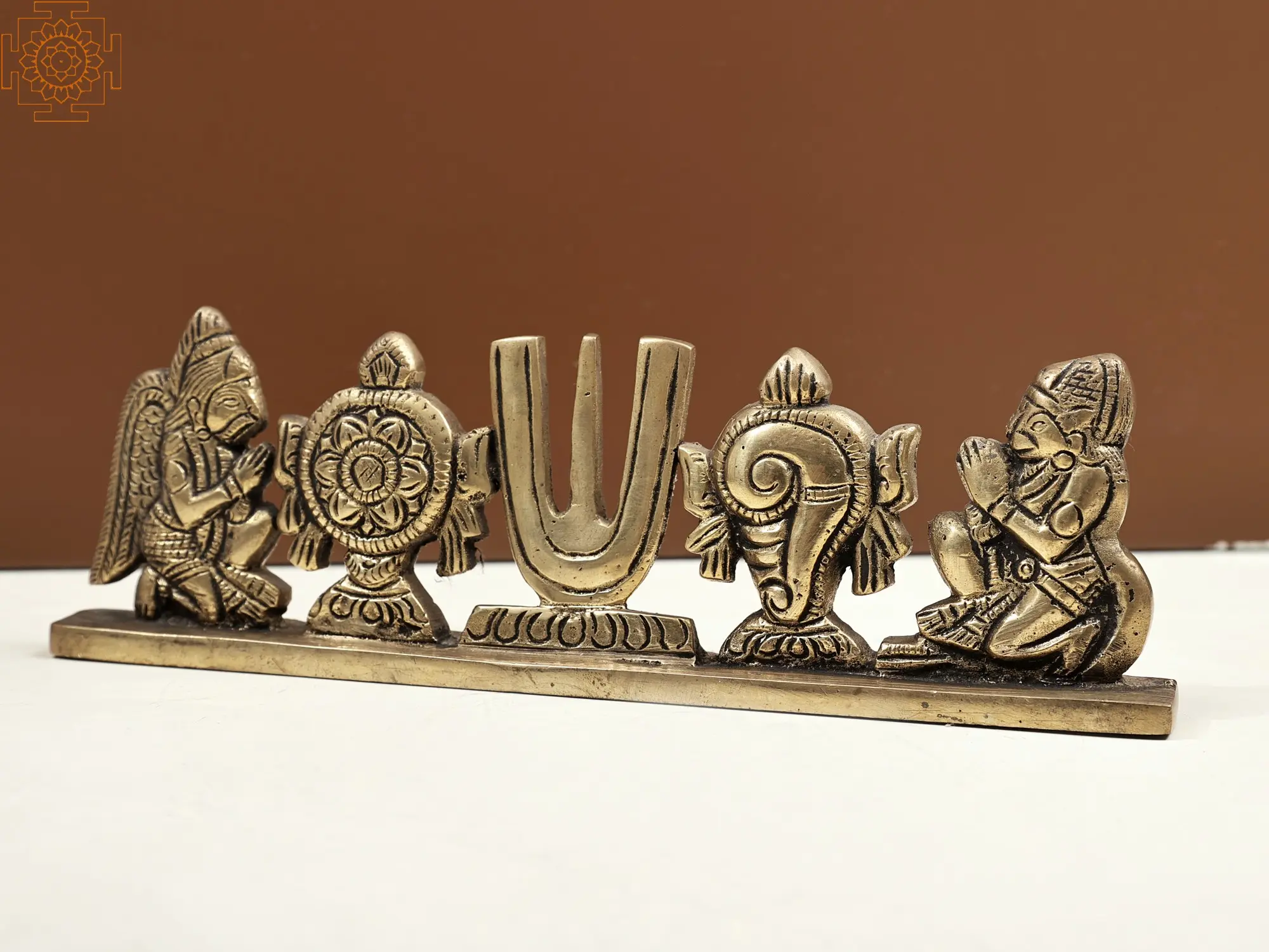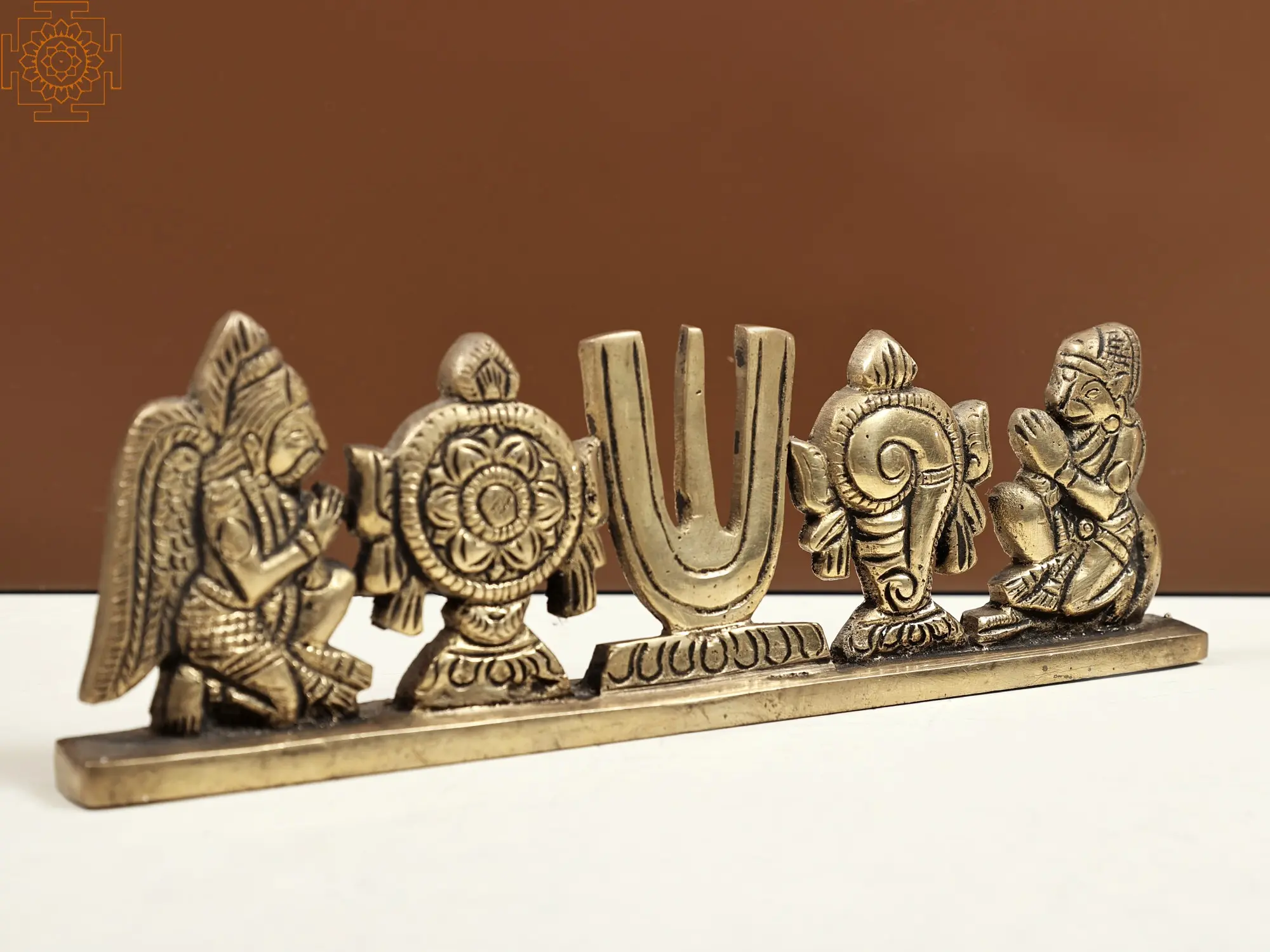 Handcrafted with devotion, the brass Vaishnava symbol captures the essence of Vaishnavism. The "Sri" symbol signifies the goddess Lakshmi and devotion to Lord Vishnu. The Garuda, Vishnu's vahana, represents protection, courage, and swiftness. Hanuman's presence embodies devotion and unwavering service to Lord Rama. Together, Garuda and Hanuman stand as guardians of righteousness. This artwork serves as a reminder of their protective presence, guiding devotees on their spiritual journey and shielding them from life's adversities.
