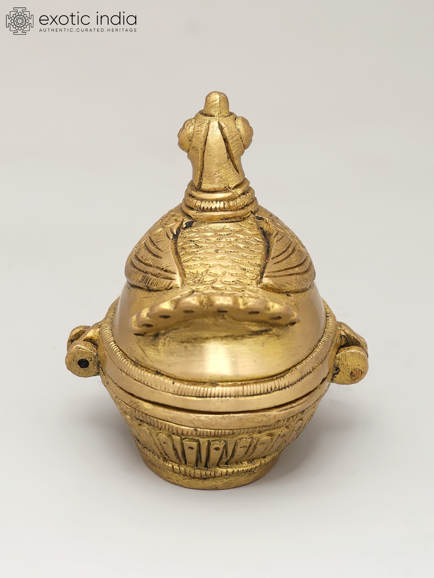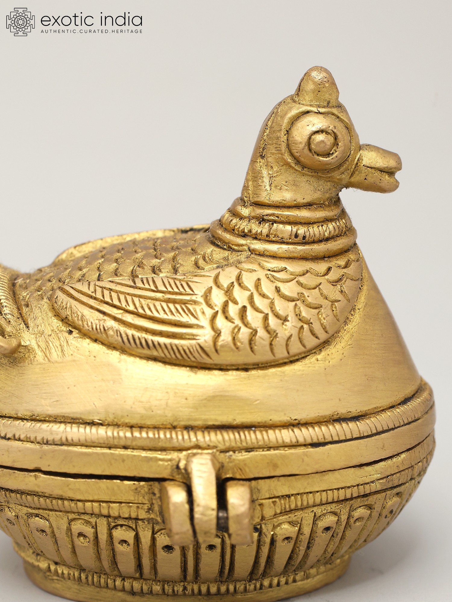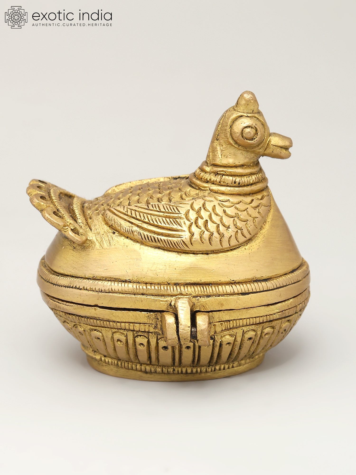 "Within the delicate curves of a brass duck, art meets functionality in a whimsical dance”. Beyond its charming exterior lies a reservoir of kumkum, a symbol of tradition and auspicious beginnings. Ducks, often associated with grace, remind us of the beauty in simplicity. As you hold this kumkum box, the weight of time-honored customs rests in your hands. Its golden hue reflects the radiance of heritage, passed down through generations. This creation bridges the gap between the artistic and the practical, uniting cultures and generations with each graceful lift of the lid.