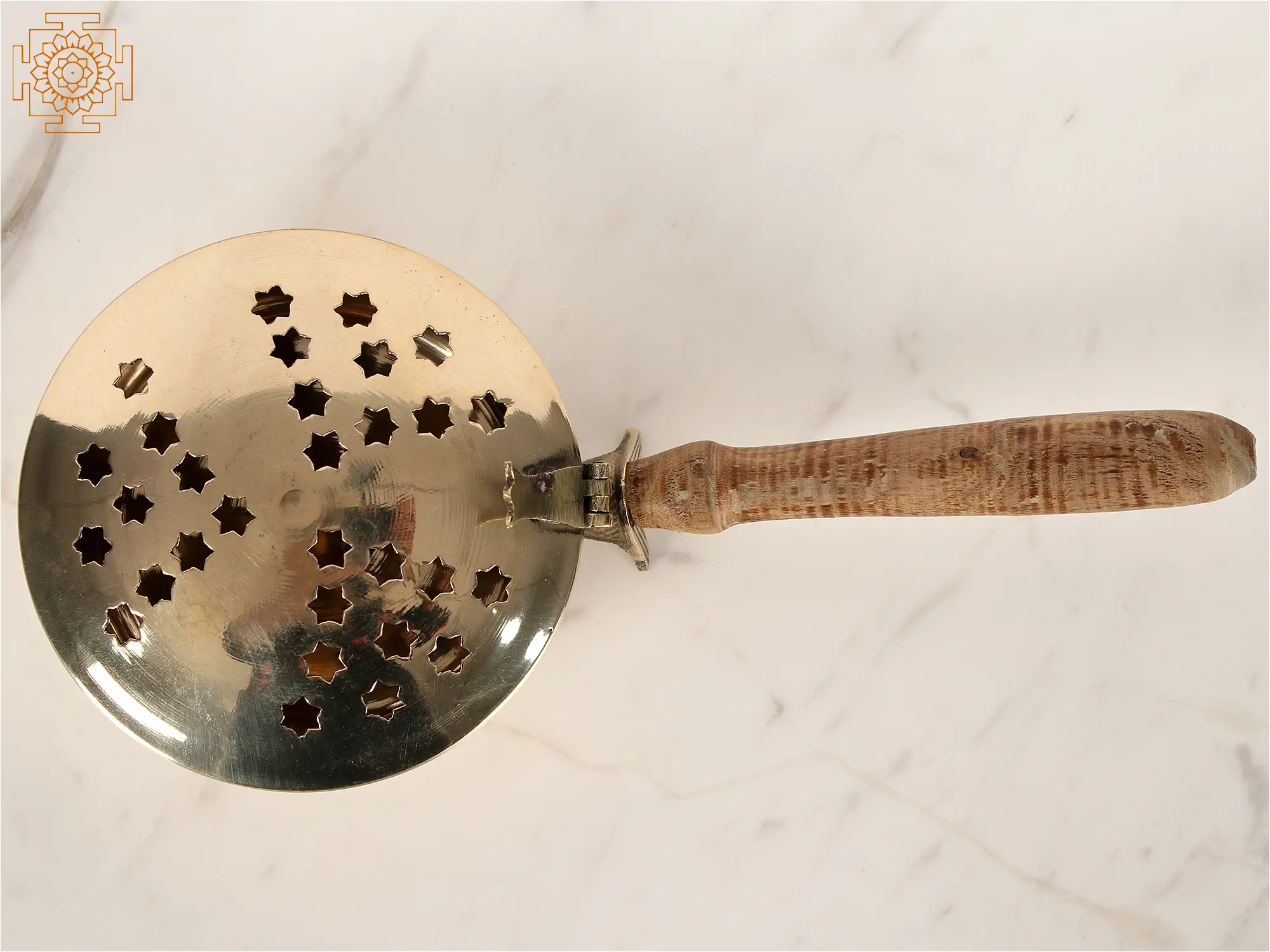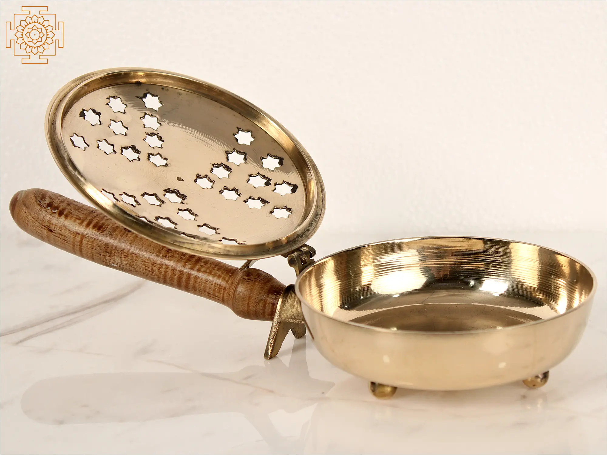 In India, burning incense is a significant part of purifying practices. Loban is the incense, and Lobandan is the container in which it is burnt to produce smoke. This brass incense burner has exquisite hexagons shaped like stars carved out of the lid of Lobandan to allow smoke to pass through. Loban is regarded as the greatest air purifier. It also adds positivity to the air. This incense burner is designed to handle a large amount of coal and allows for a smooth cleaning procedure. The lid can be locked through a small lock and the wooden handle allows a firm grip. This ritual object is ideal for everyday worship practices.