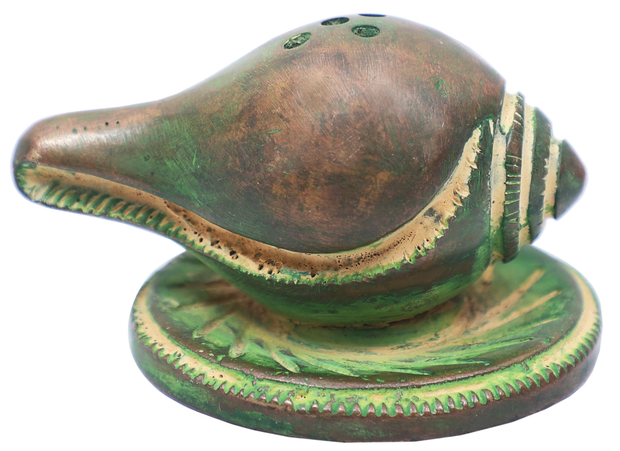 Offering Agarbatti to the deities is an essential component of Hindu ceremonies. An Agarbatti is a fragrant, natural item of plant resins, oils, and herbs. It releases a pleasant smell when burnt. It is believed that burning incense helps get rid of bacteria that cause a foul smell in the air. This conch-shaped Agarbatti stand, handmade in brass, is a ritual object that implements the sacred image of a conch to increase the sacredness of the ritual of offering incense to the deities. The stand is designed in the shape of a conch that is placed on a plate resembling a chakra. In simple words, this Agarbatti stand is blessed with the icons associated with Lord Vishnu, thus making it a sacred object itself.