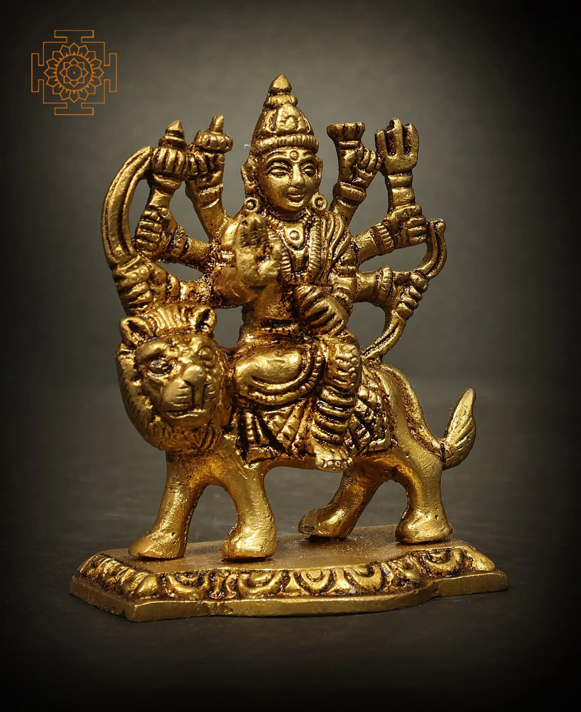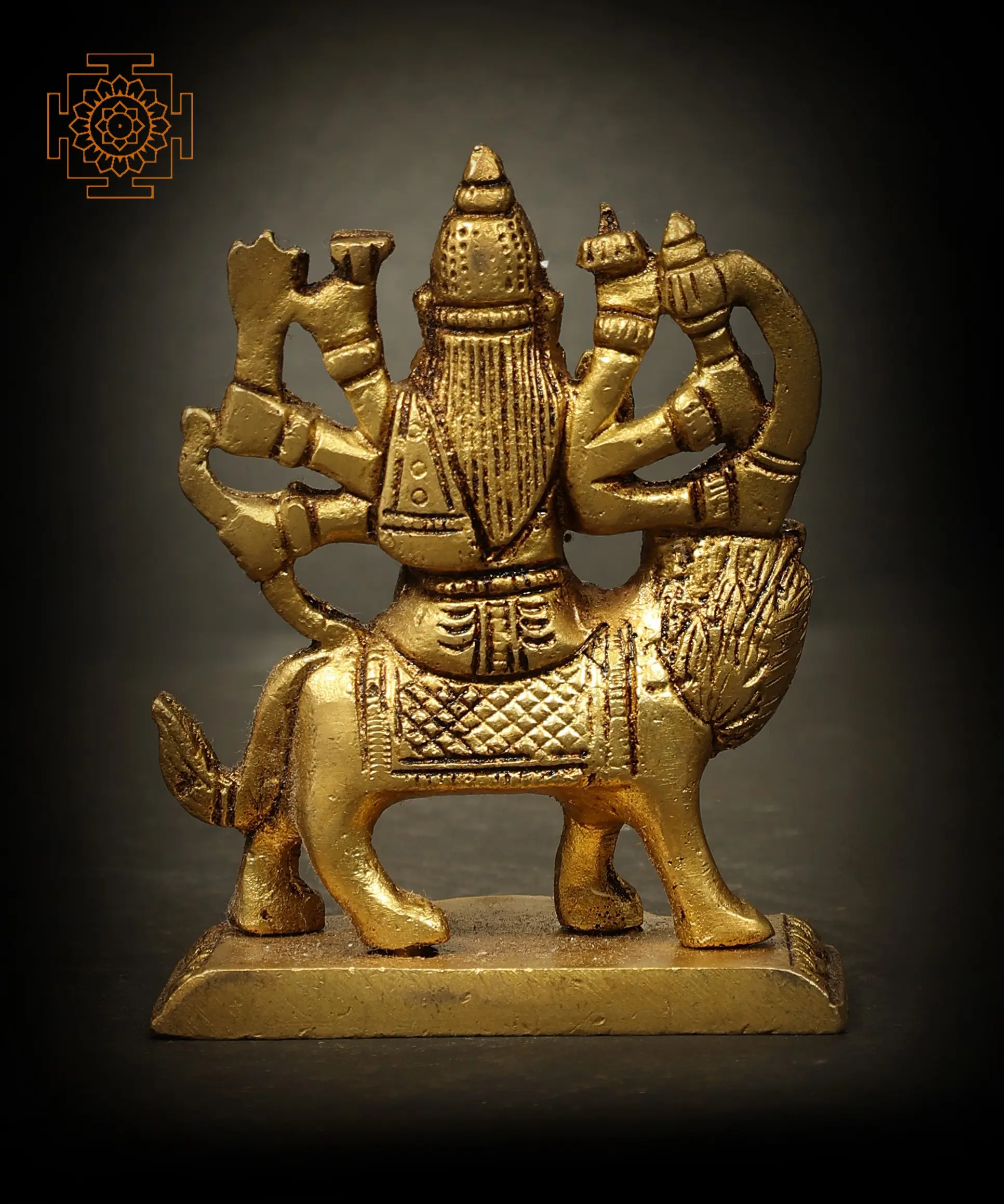 This small brass statue of Maa Durga depicts her in her Ashtabhuja-dharani form, armed with eight powerful weapons, surrounded by a heavenly atmosphere, and dressed as the universe's sovereign with ornaments and a Mukuta adorning her. The goddess exudes an energized aura in Lalitasana and seems prepared to descend to the mortal sphere to defend her offspring. This statue, which is rounded in design, is the ideal representation of Devi Maa to place in your Puja ghar.