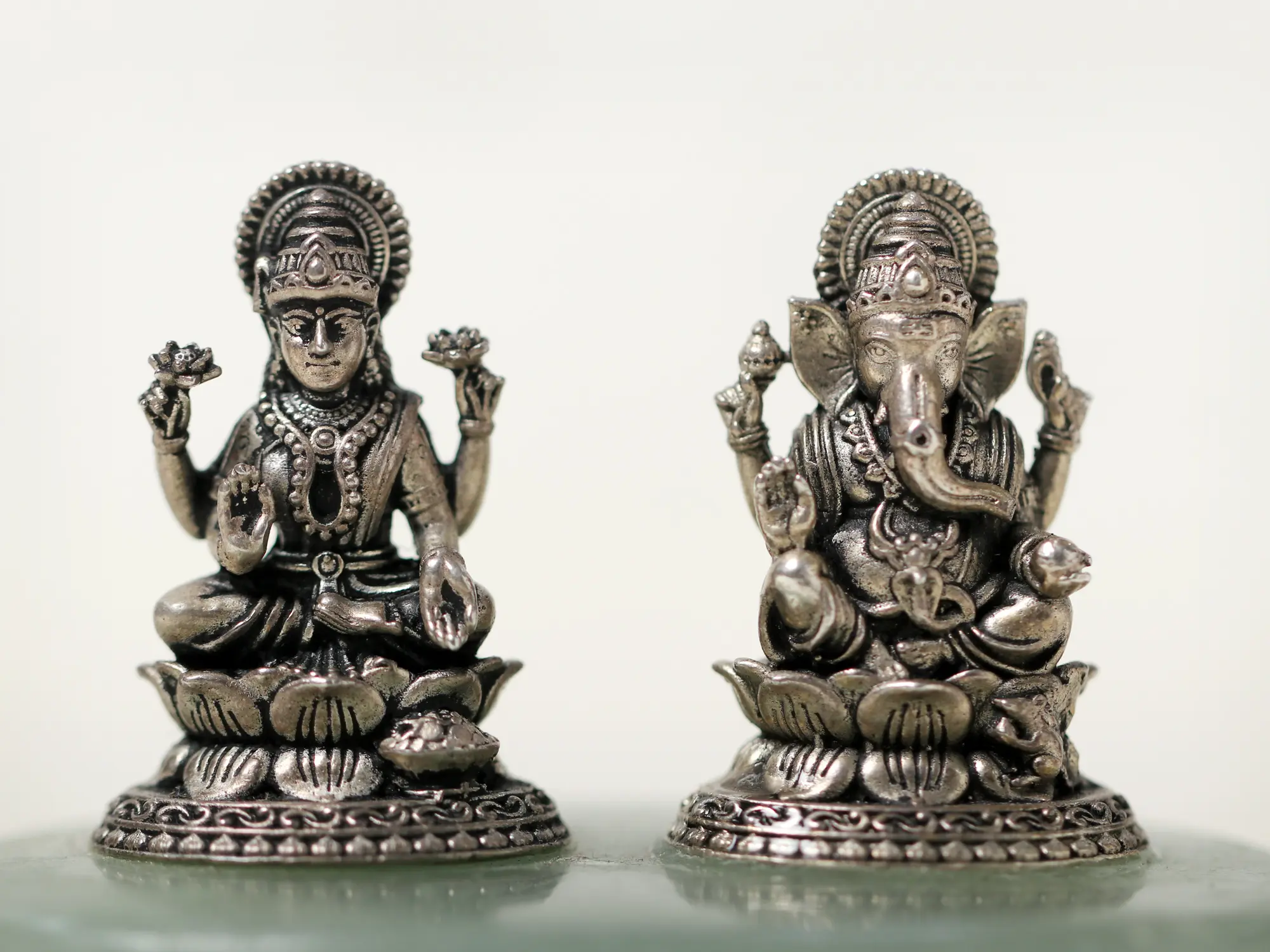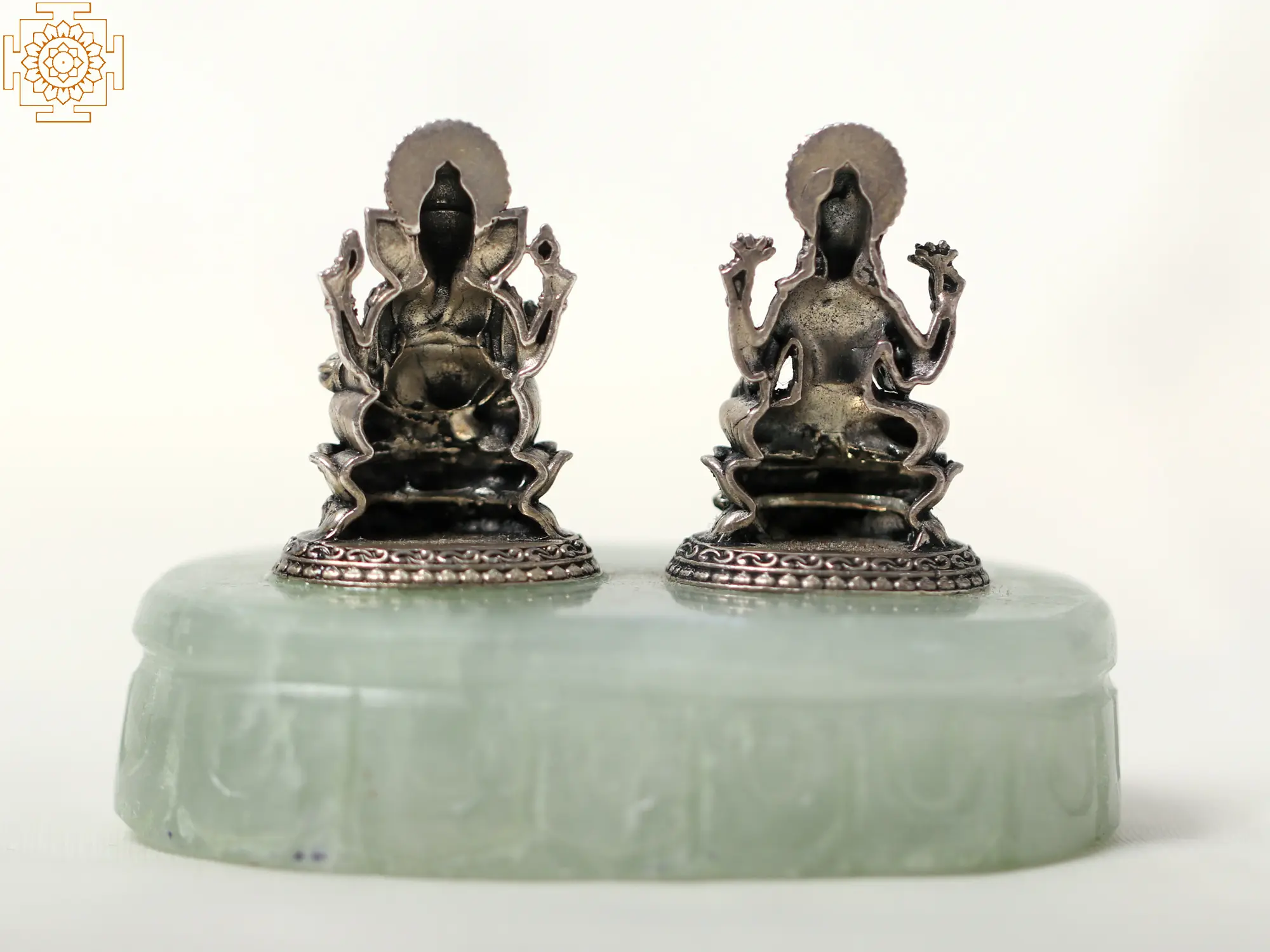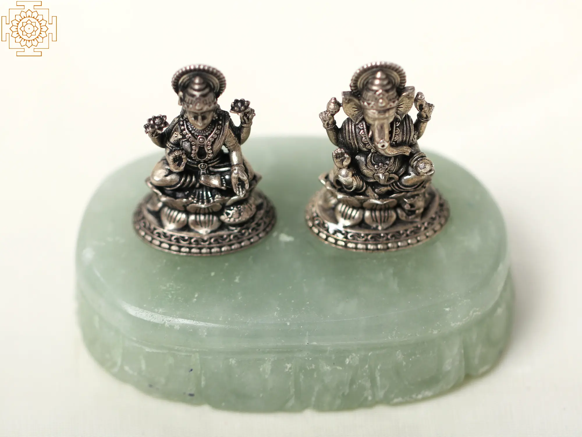 In this Small Silver sculpture pair, Lakshmi and Ganesha gracefully stand on a Light Green Aventurine Gemstone Base. This enchanting artwork symbolizes the harmonious dance of abundance and intellect. The elegant union of these revered deities ignites a spark within you to seek balance in all aspects of life. Just as Lakshmi blesses us with prosperity, and Ganesha bestows wisdom, find harmony within yourself to attract abundance and knowledge. This exquisite sculpture is a source of motivation to embrace the blessings of Lakshmi and the wisdom of Ganesha.