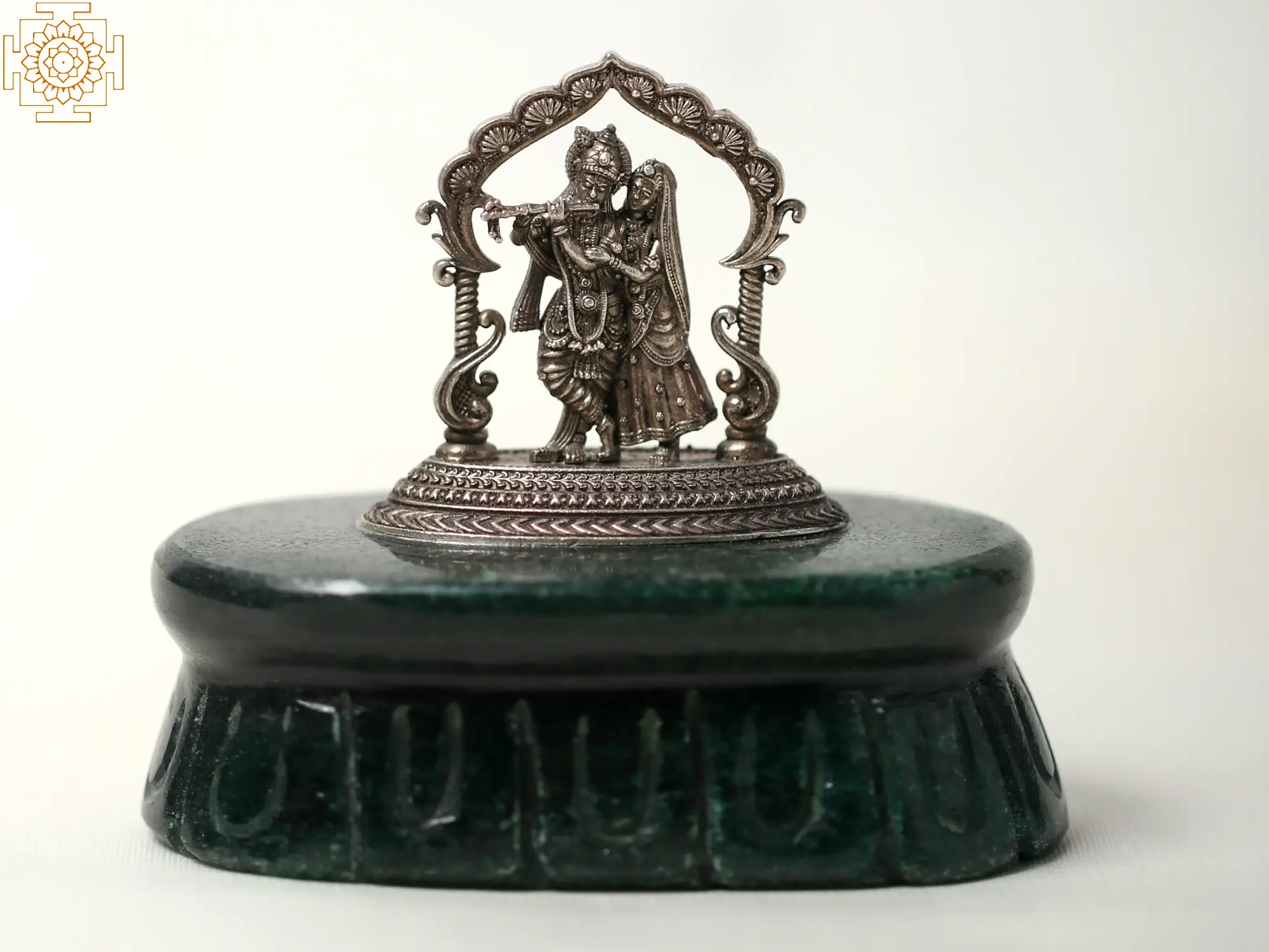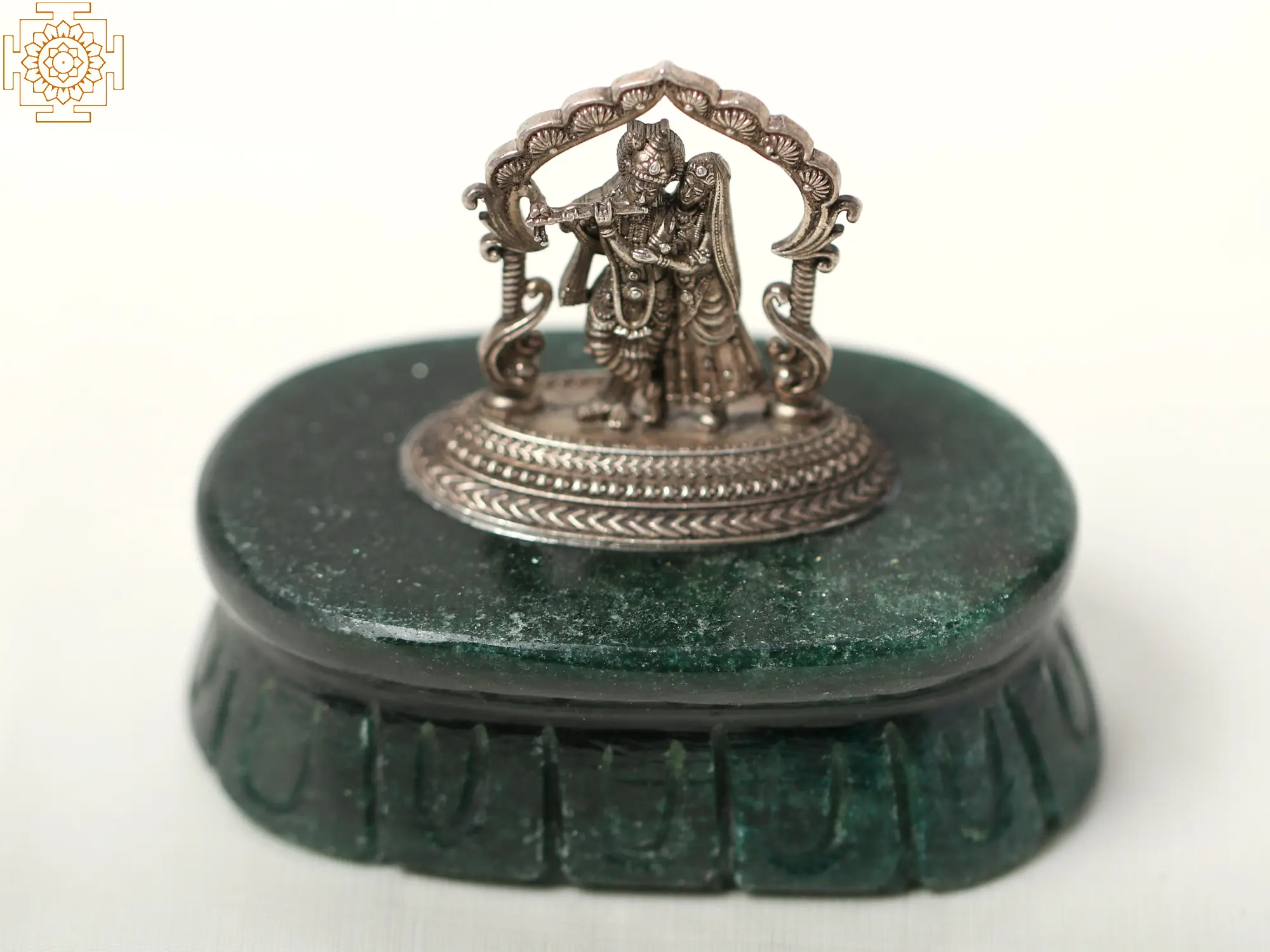 The eternal embrace of a Small Silver Radha Krishna on a Green Aventurine Gemstone Base expresses the divine love story of Radha and Krishna unfolding on the green aventurine pedestal. Krishna, the charming and playful deity, revels in the love of his beloved Radha. Experience the depths of divine love like Radha, whose devotion transcends all bounds, and Krishna, who reciprocates that love, embrace the power of love in your life, knowing that it is the most profound force that unites hearts.
