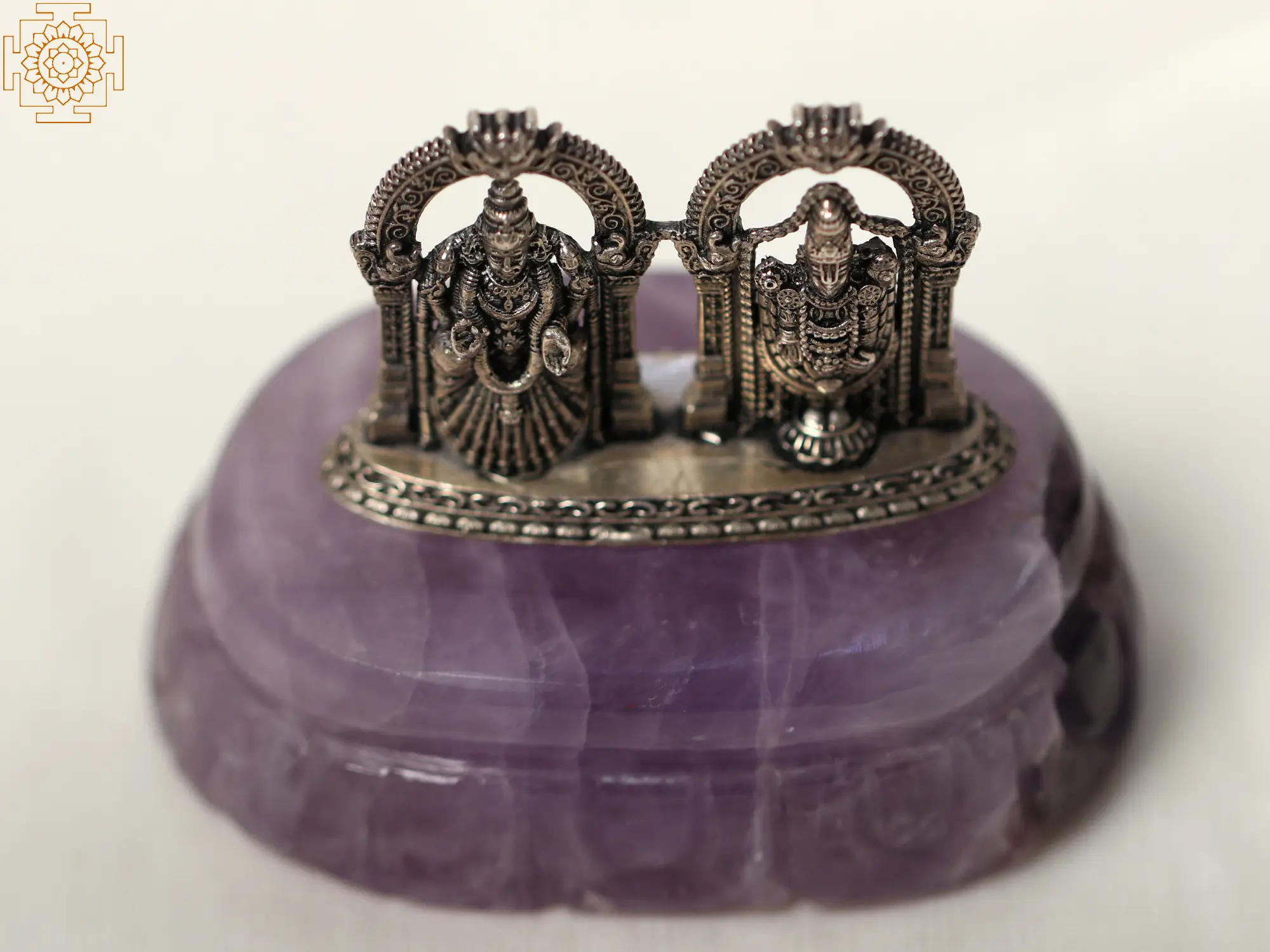 The divine aura of a Small Silver Tirupati Balaji (Venkateshvara) with Goddess Lakshmi on an Amethyst Gemstone Base reflects right through this blissful piece of art. The regal purple amethyst serves as a gateway to the celestial abode of Tirupati Balaji and Lakshmi. As you contemplate this sculpture, the amethyst's energy shall elevate your connection to the divine. Tirupati Balaji bestows his blessings and grace on his devotees, and Lakshmi symbolizes abundance and fortune. This exquisite artwork inspires you to become aware of your divine potential and attract prosperity and grace into your life.
