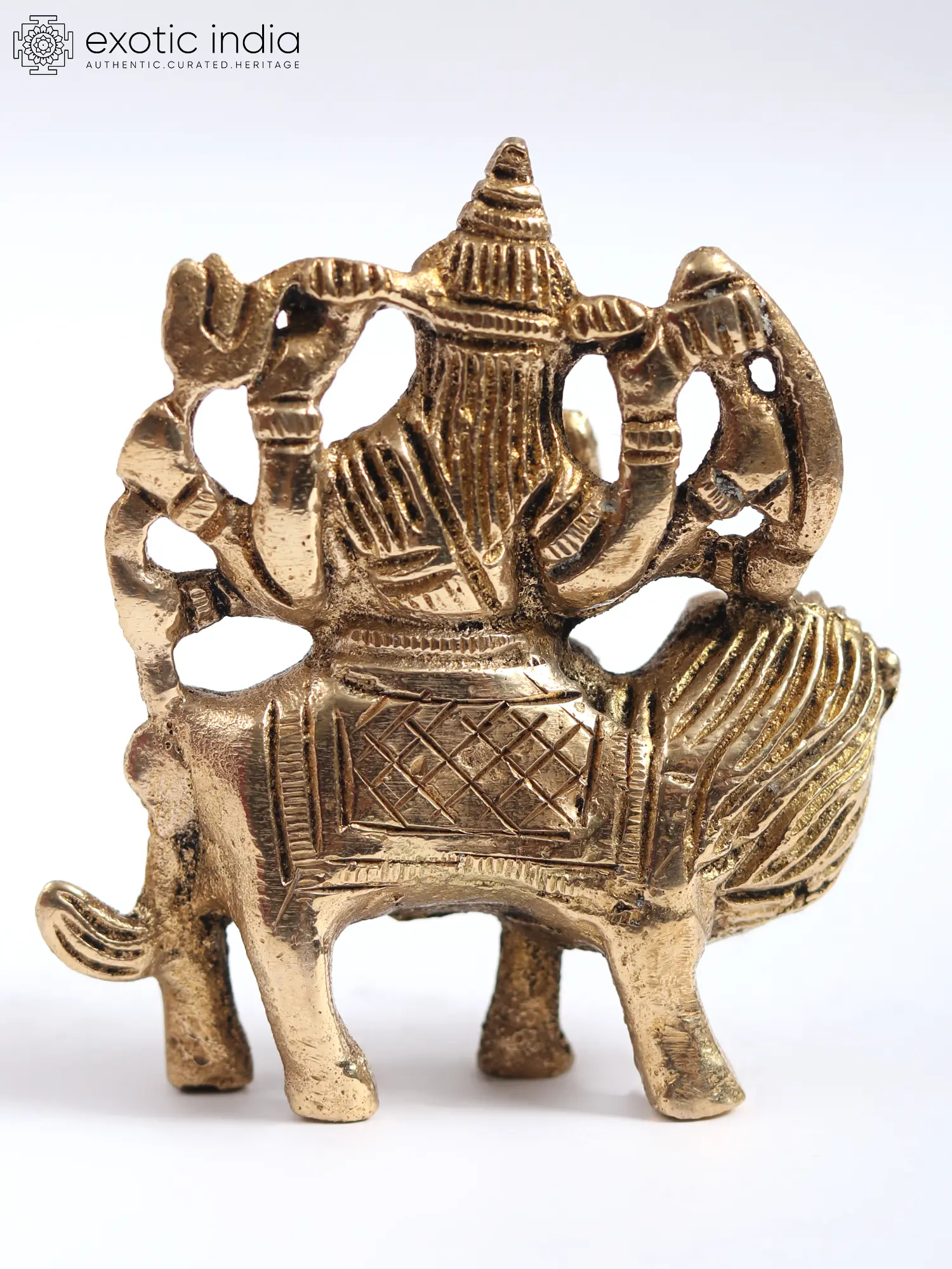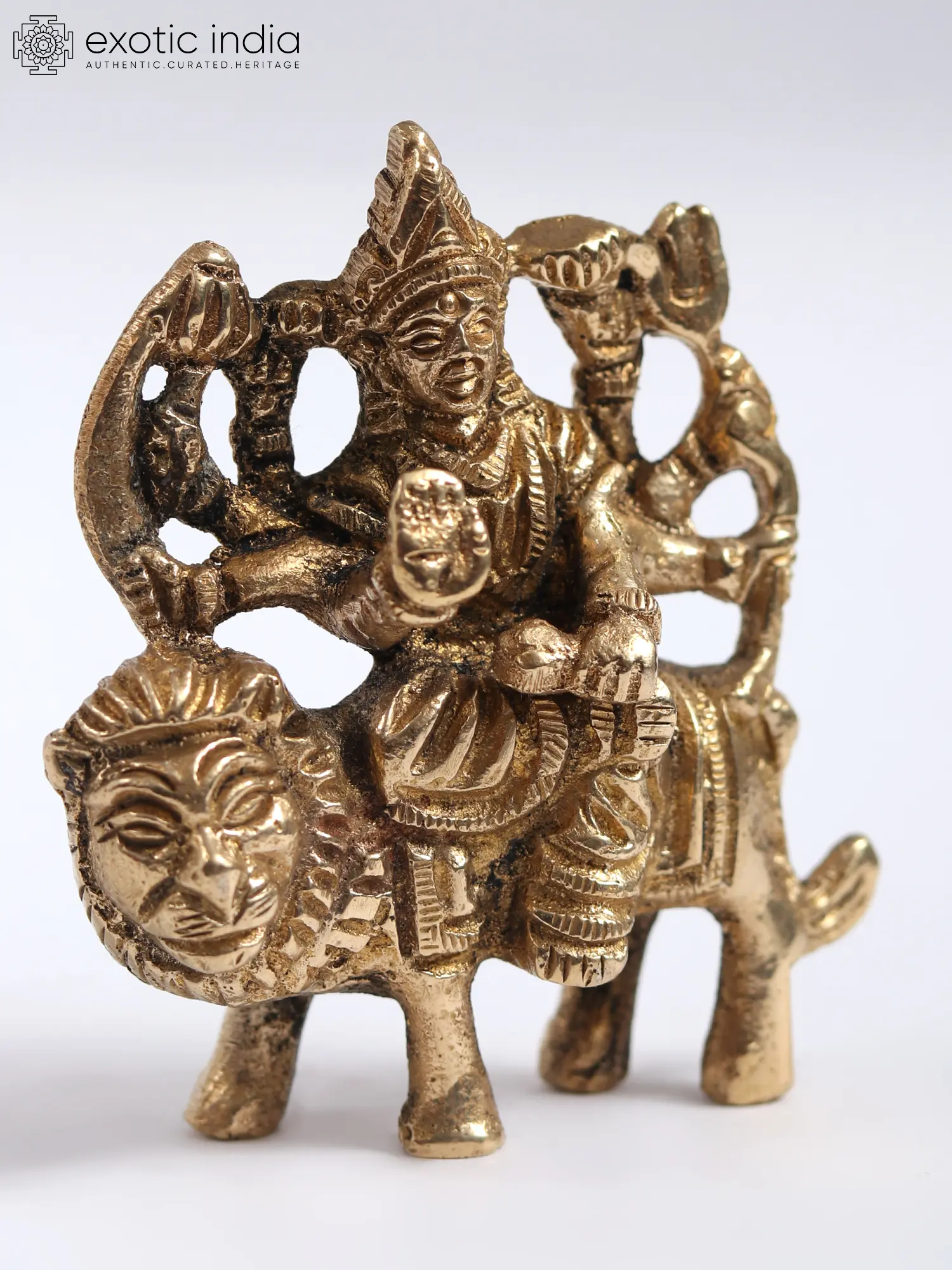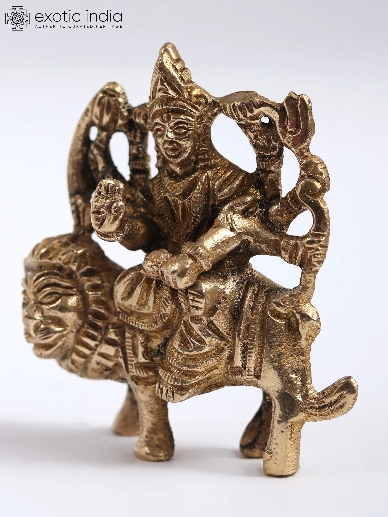 In this brass rendition, Goddess Durga, “the principal aspect of Mother Goddess Mahadevi”, graces her majestic lion with an ethereal aura. Her divine presence exudes power and grace, seated in “Ashirwad Mudra”, bestowing blessings upon her devotees. With weapons like trident (Trishul) and sword in hand, She symbolises strength and protection, ready to vanquish evil and uphold righteousness. Her blessings bring courage, fortitude, and the ability to overcome obstacles. She embodies the fierce feminine energy that empowers us to face life's challenges with determination and grace. Her worship instils confidence, inner strength, and the triumph of good over evil, making her an icon of inspiration and resilience.