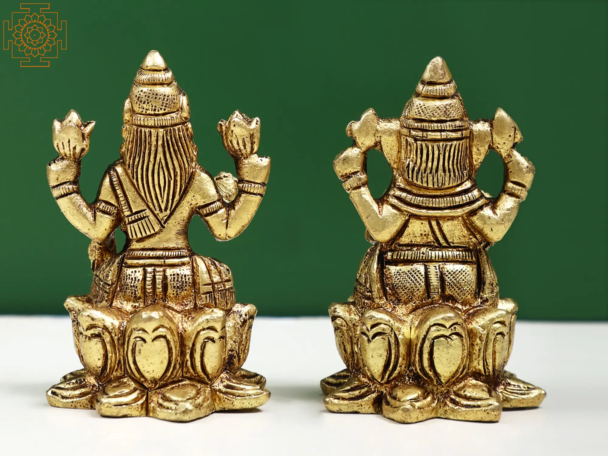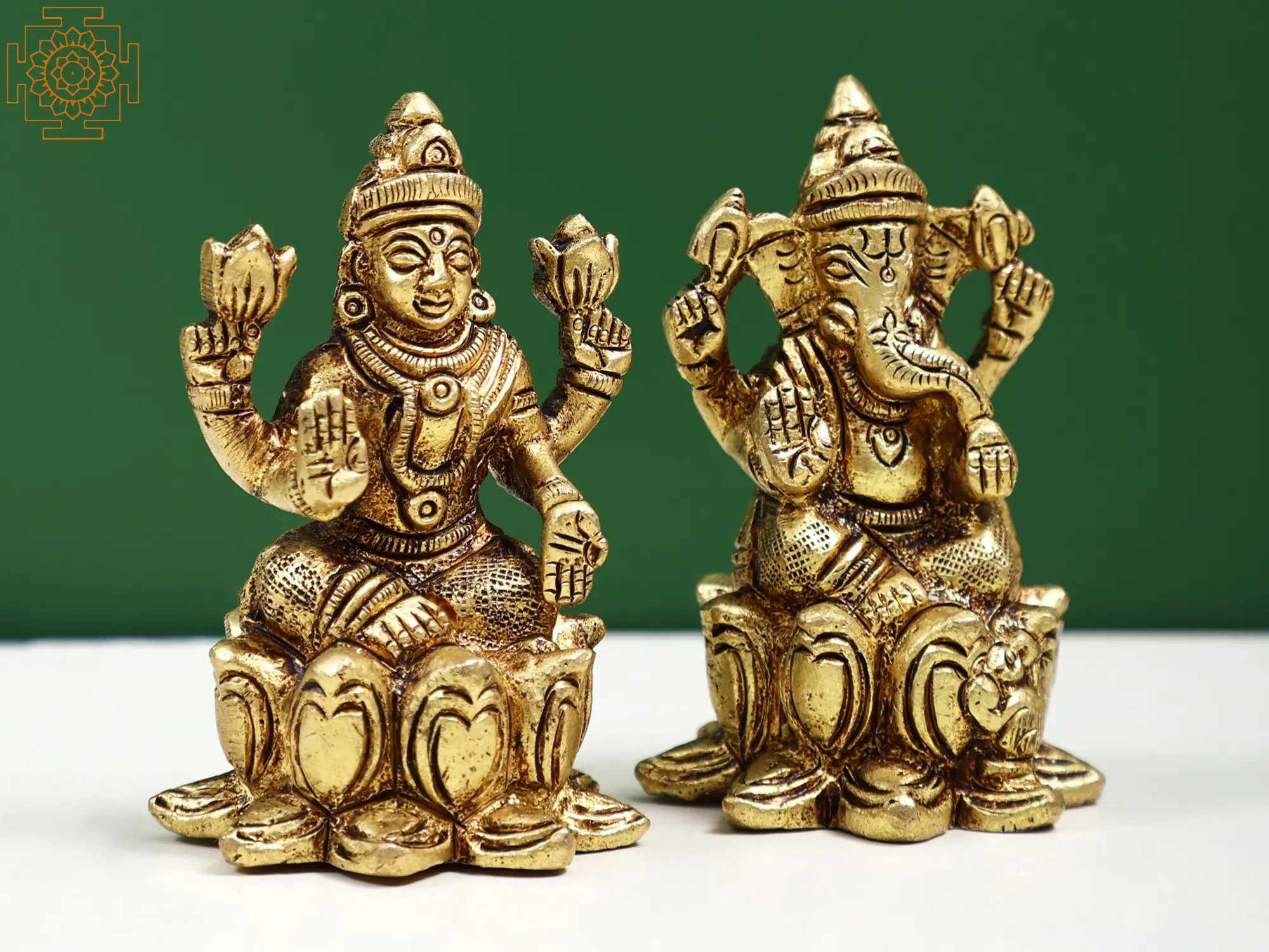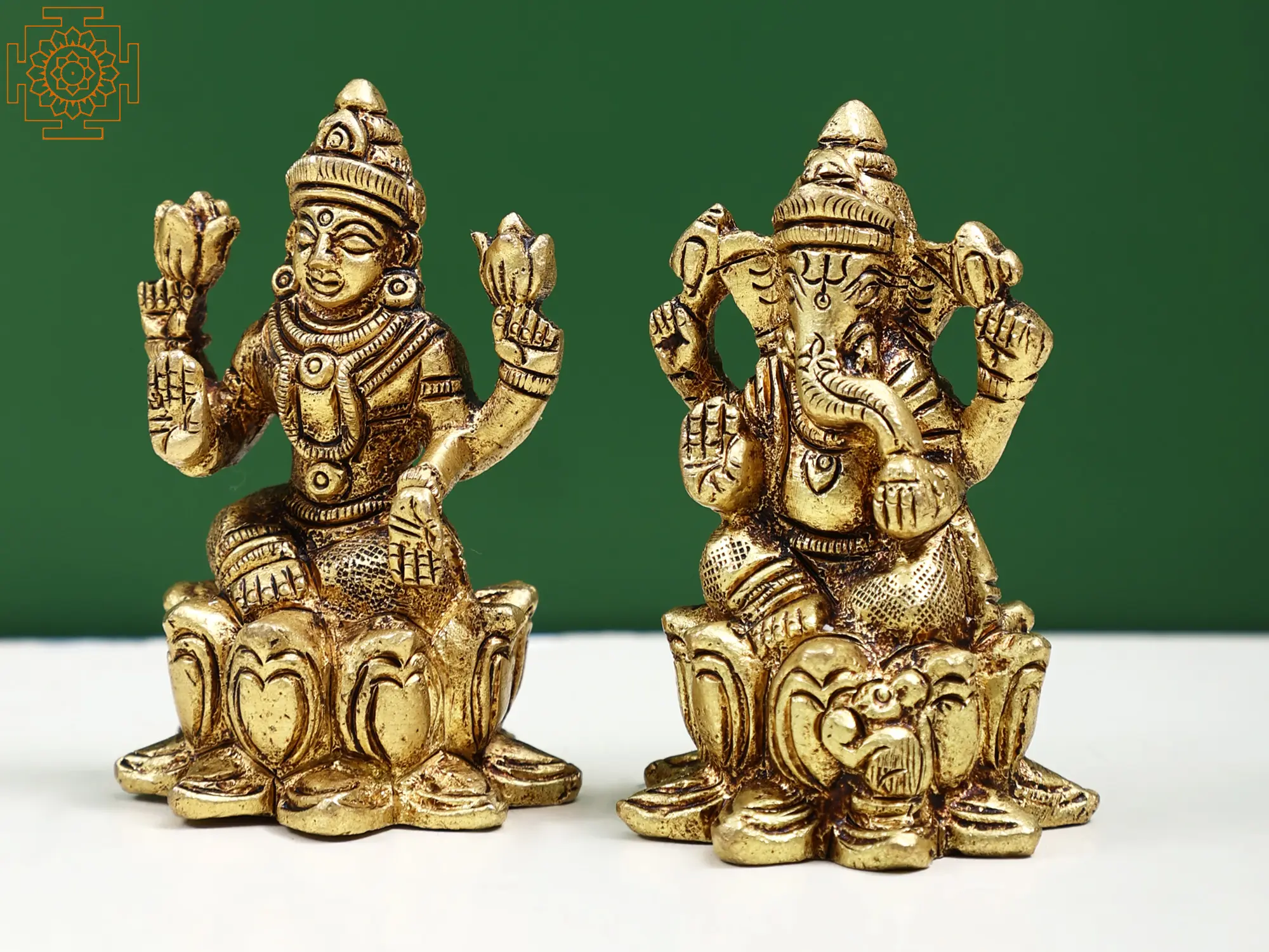 In these hand-crafted brass statues of Sri Ganesha and Maa Lakshmi, they are shown in their auspicious poses, sitting in Padmasana, adorned with fortunate symbols, and raising their hands in the Abhaya mudra, which symbolizes the dispelling of fear, to announce their presence and bestow good fortune on their devotees. The icons are brilliantly sculpted, with lovely details added to them, bringing to your Puja ghar a powerful and fortunate presence of Lakshmi Ganesha.