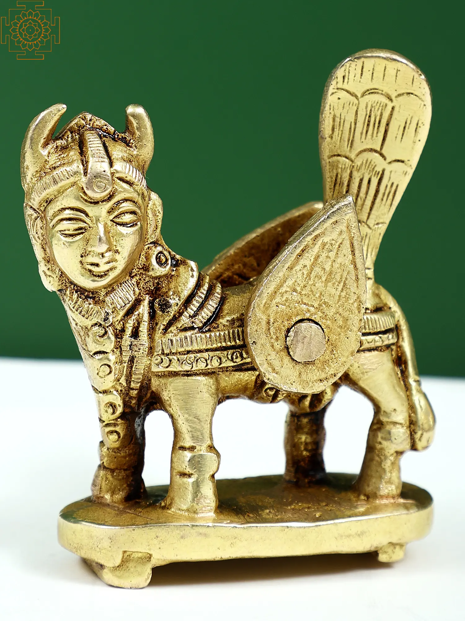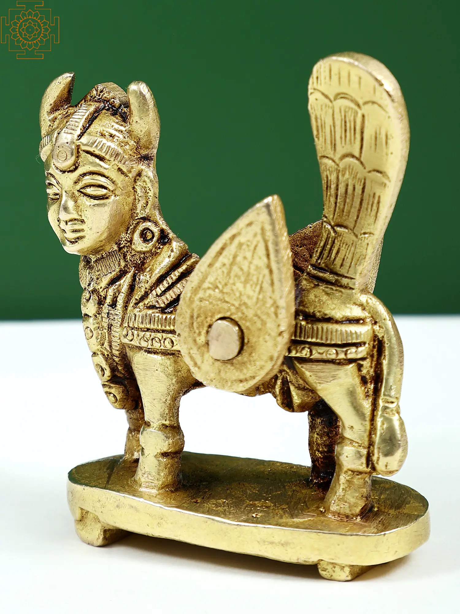 "In the gentle gaze, divinity and creation converge." This brass Kamdhenu Cow statue captures the sacred bond between the earth and the cosmos. Kamdhenu, the wish-fulfilling cow, emerges from Hindu mythology as a symbol of abundance and fulfillment. Her eyes exude maternal grace, while the hump and celestial ornaments signify her divine nature. With a calf nestled beneath, she embodies nurturing creation and prosperity. This statue's intricate handiwork echoes devotion, invoking the blessings of Kamdhenu to bestow harmony, prosperity, and fulfillment upon all who welcome her presence.