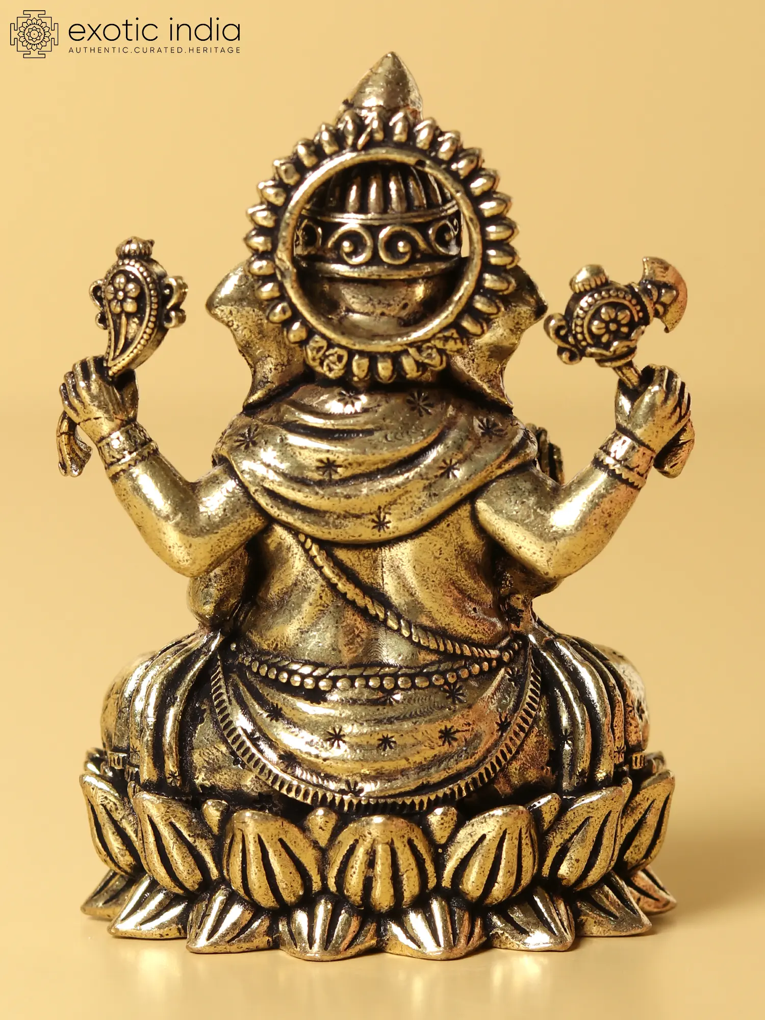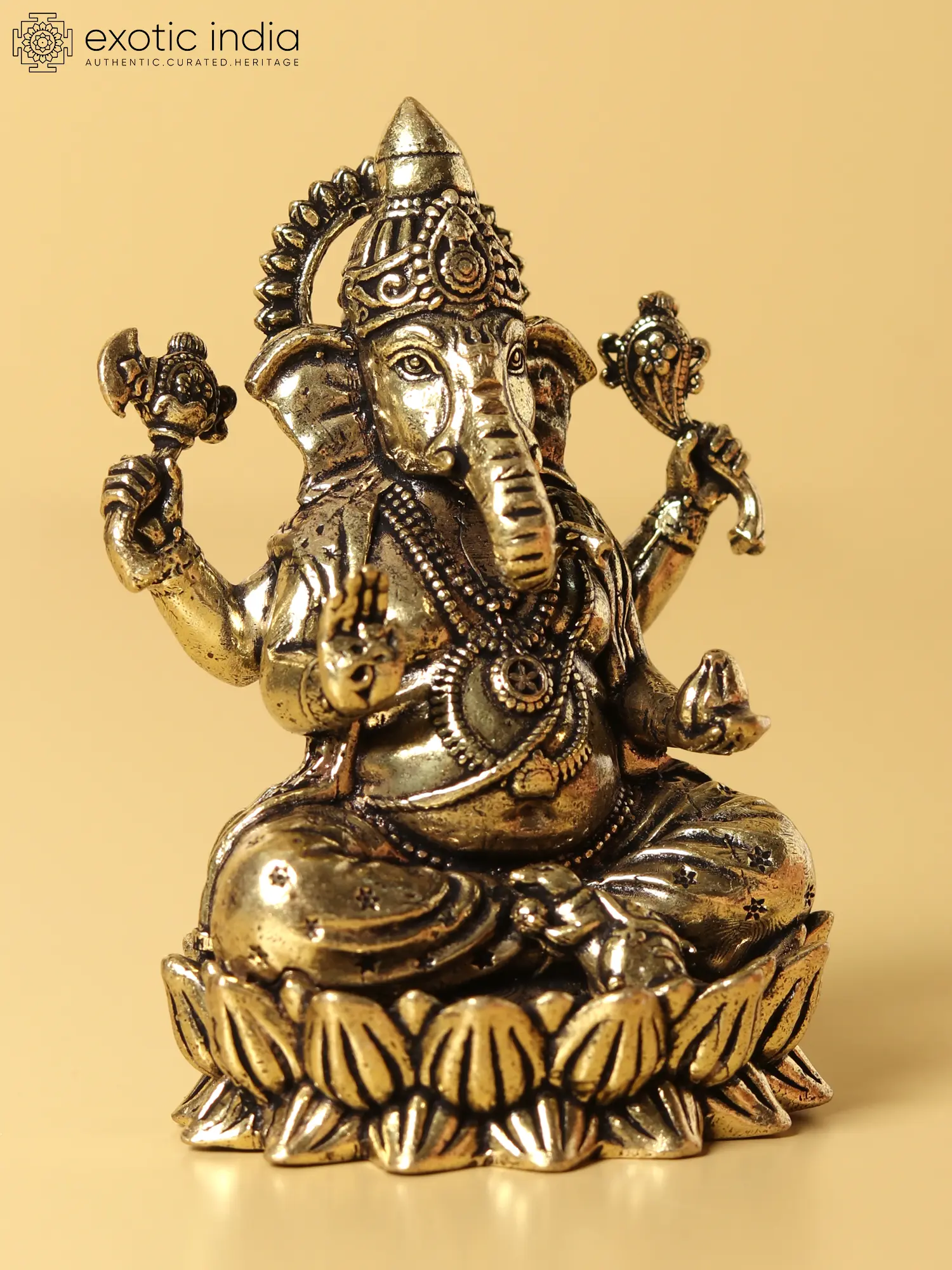 This magnificent handcrafted Brass Statue in a traditional dark brass tone is a piece of art. It is well known that the presence of Lord Ganesha fosters excellent advancement in career and life. The majestic statue of Lord Ganesha in his Chaturbhuja form, with four arms, is a feast for the eyes. His two hands are holding a noose and a goad, indicating his power to guide and remove barriers from his followers' paths. His signature Modak is in one hand, while blessings are in the other with an Om symbol. His vehicle, the mooshak, is sitting beneath his feet, and he is perched on a lotus pedestal, symbolizing his command of wisdom.