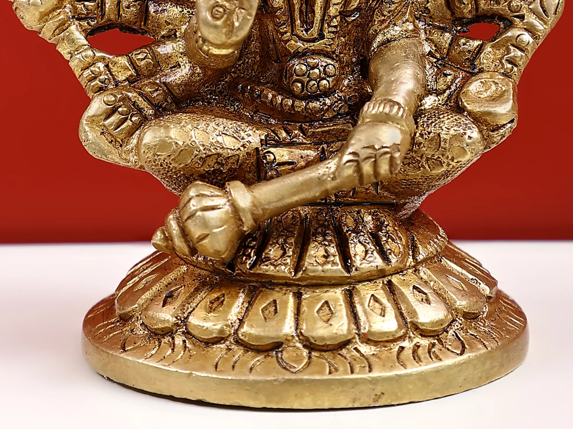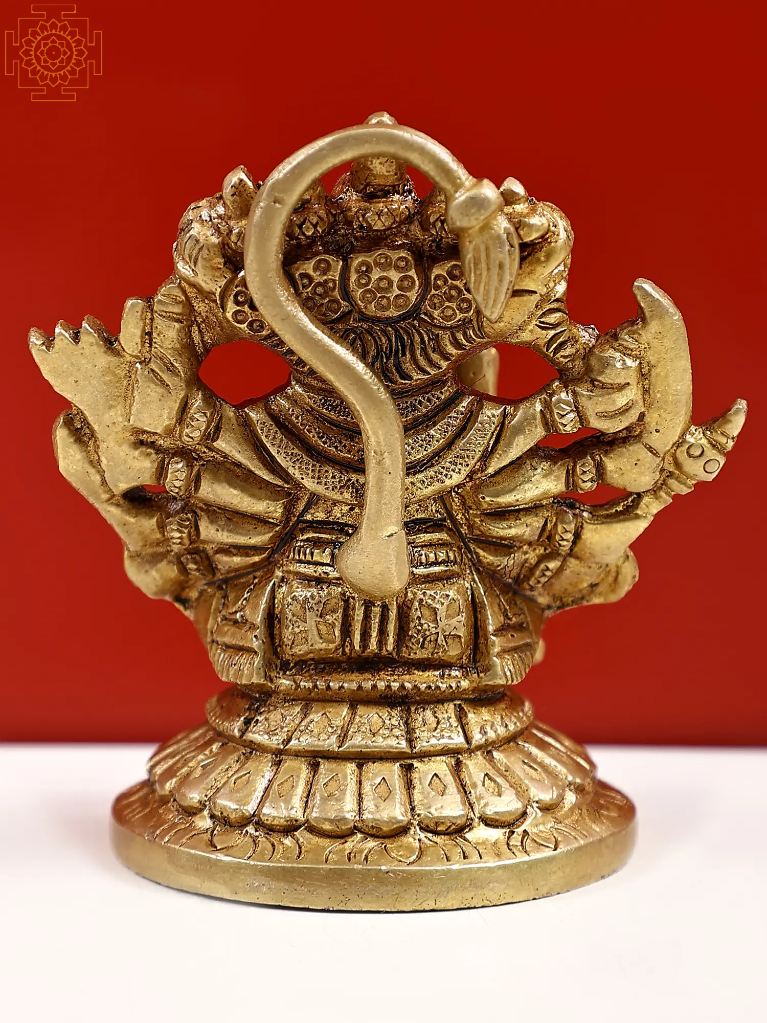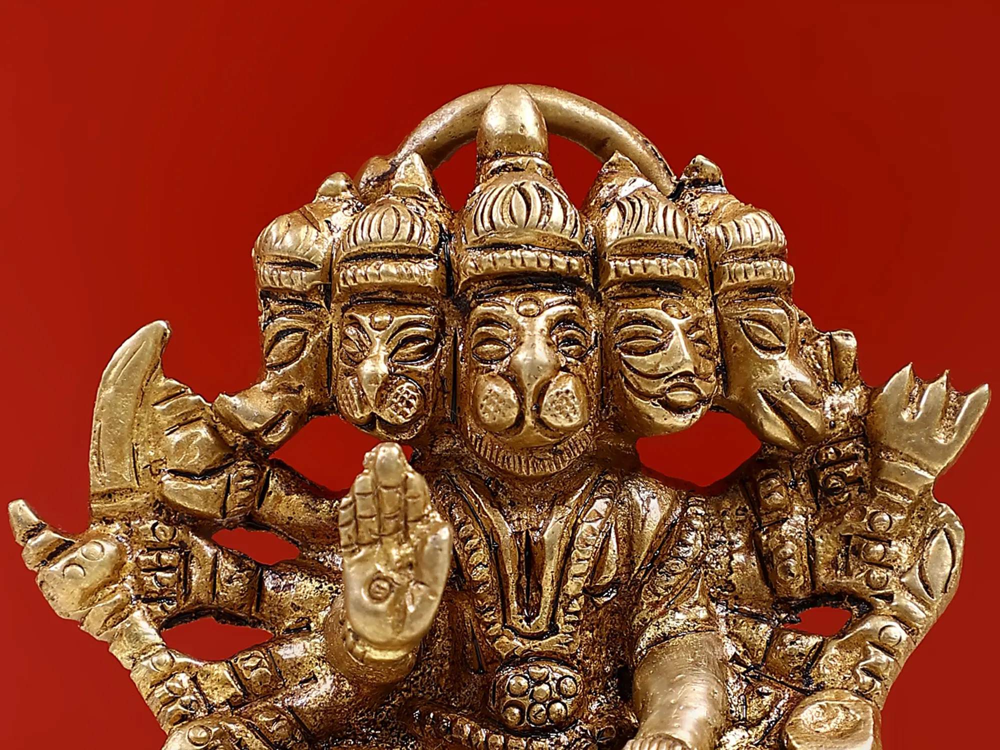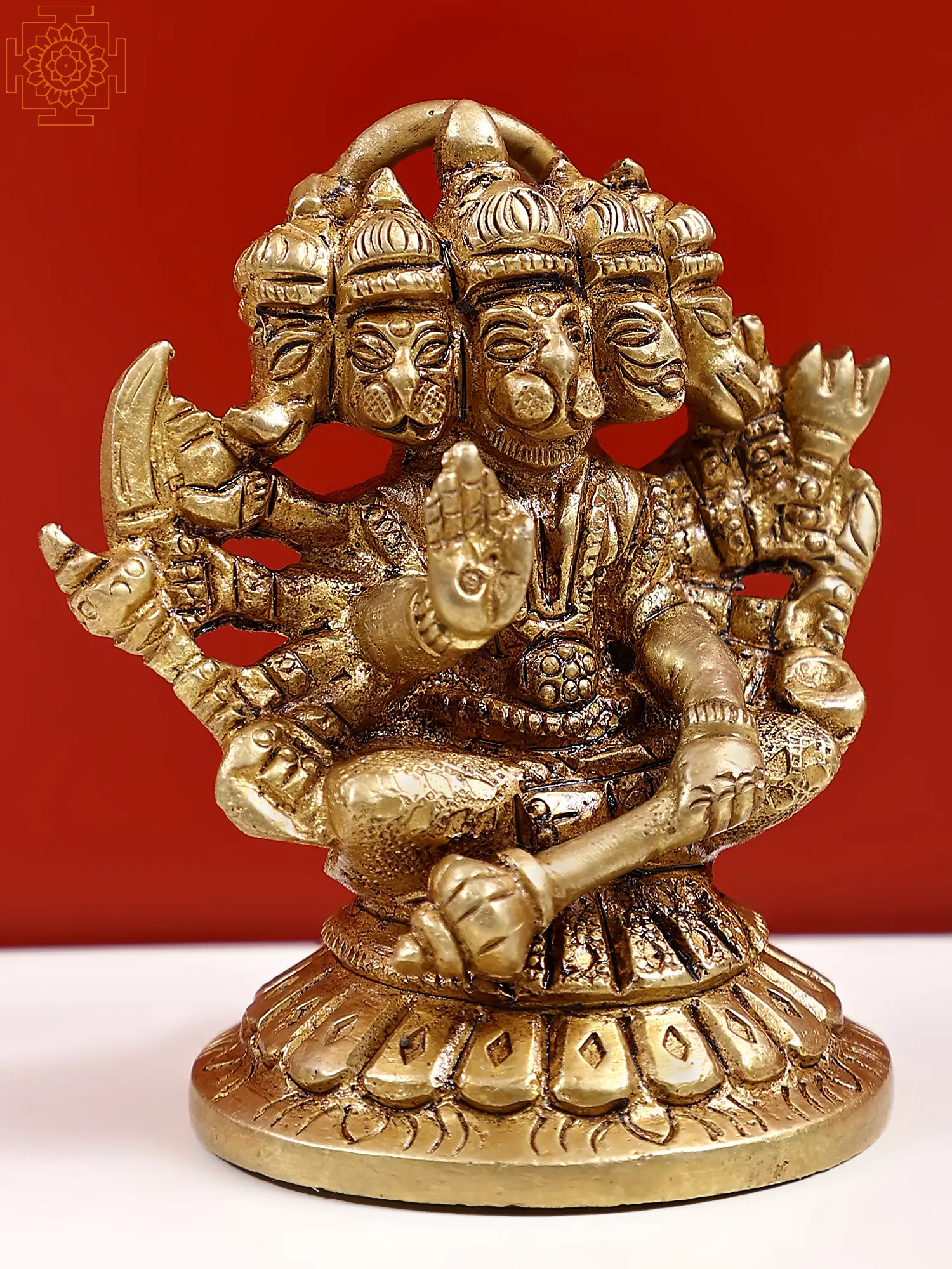 From the tales of profound spirituality and artistic expression - this brass Panchmukhi Hanuman seated on a pedestal emerges as a majestic embodiment of unwavering devotion, courage, and divine protection. This exquisite representation of Lord Hanuman, the five-faced and ten-armed deity, invites you to embrace the essence of boundless strength, spiritual wisdom, and perennial faith.