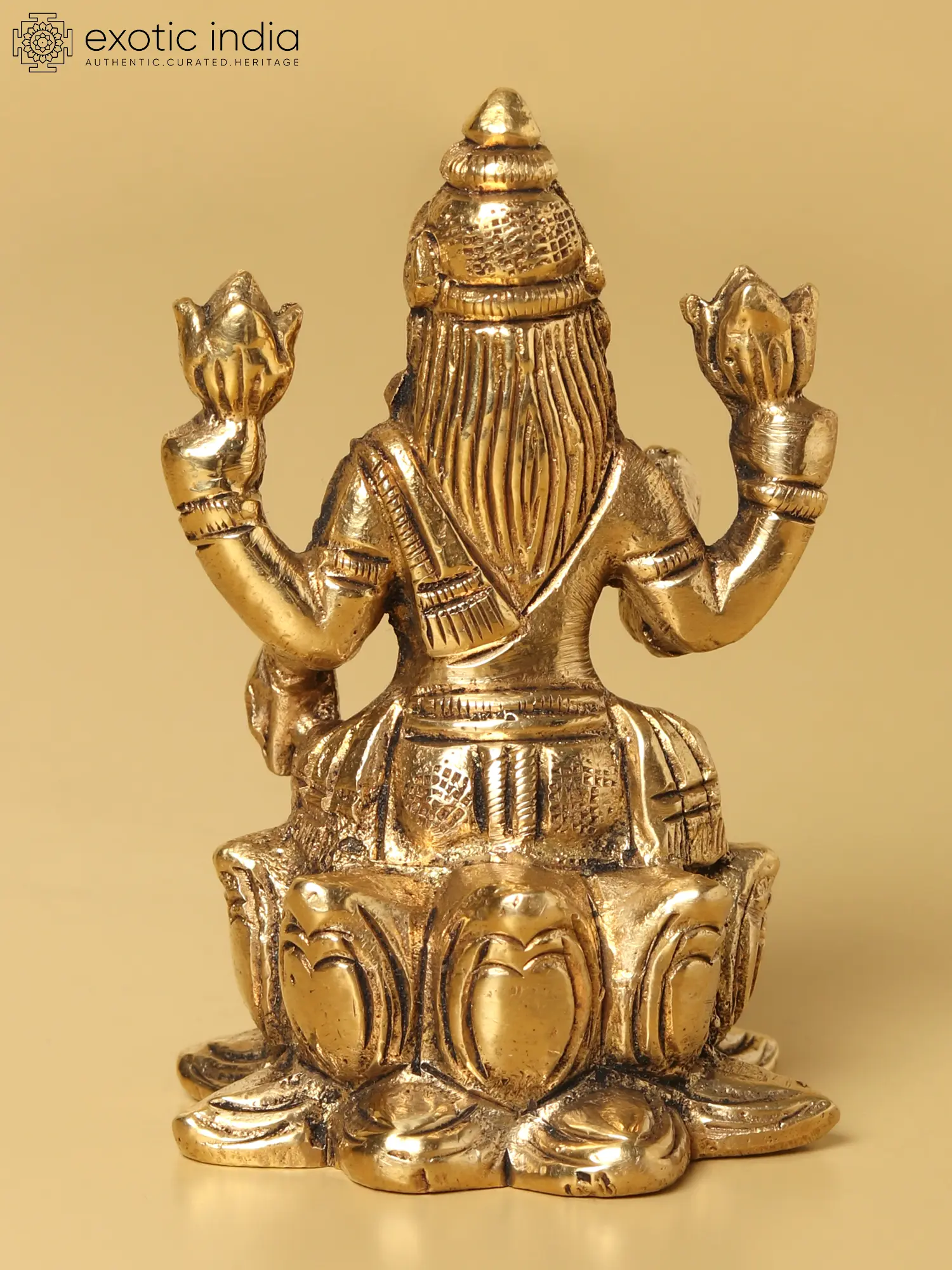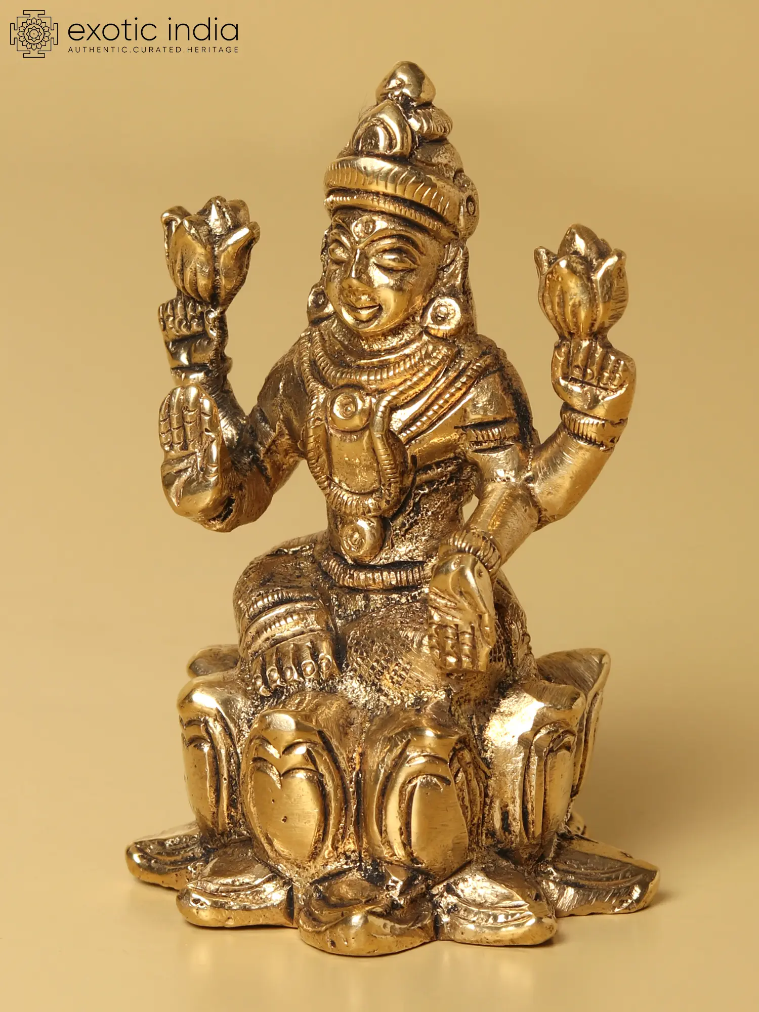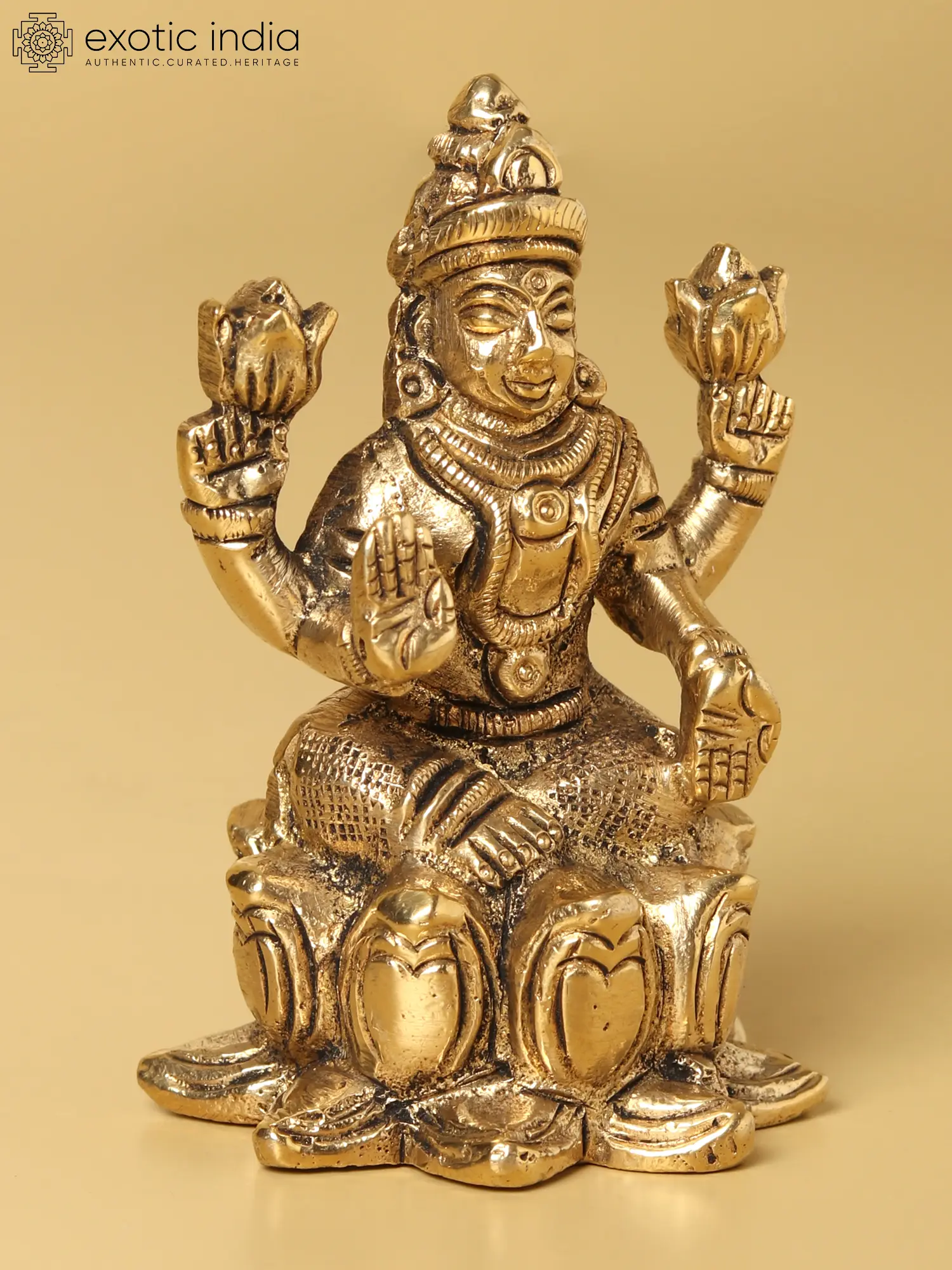 In this radiant brass statue, the ethereal “Goddess Lakshmi”, also known as “Shri”, graces her devotees. She rests gracefully atop a lotus, the symbol of purity, good fortune, and transcendence. Her regal attire shimmers with opulent grace, draping her divine form in resplendent majesty. With upper hands, she delicately cradles lotus blooms, their petals mirroring her serene countenance. The right hand extends in the “Abhaya Mudra”, offering boundless protection and fearlessness, while the left hand, in “Varada Mudra”, bestows bountiful blessings upon the faithful. A symbol of prosperity and beauty, Goddess Lakshmi is the embodiment of grace and abundance in eternal beauty.