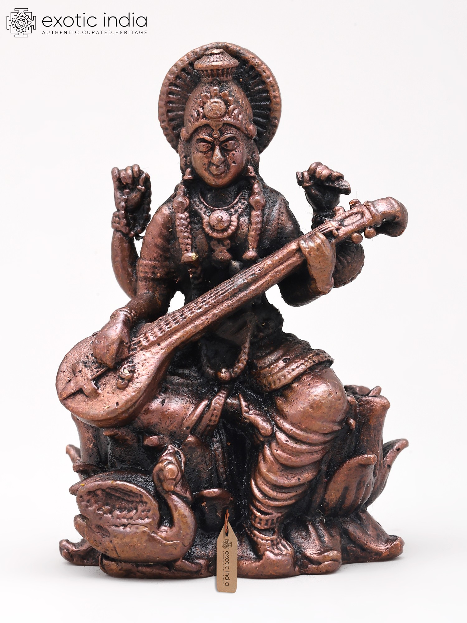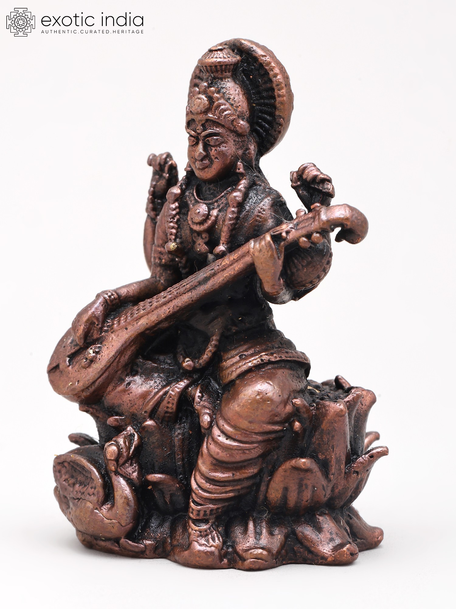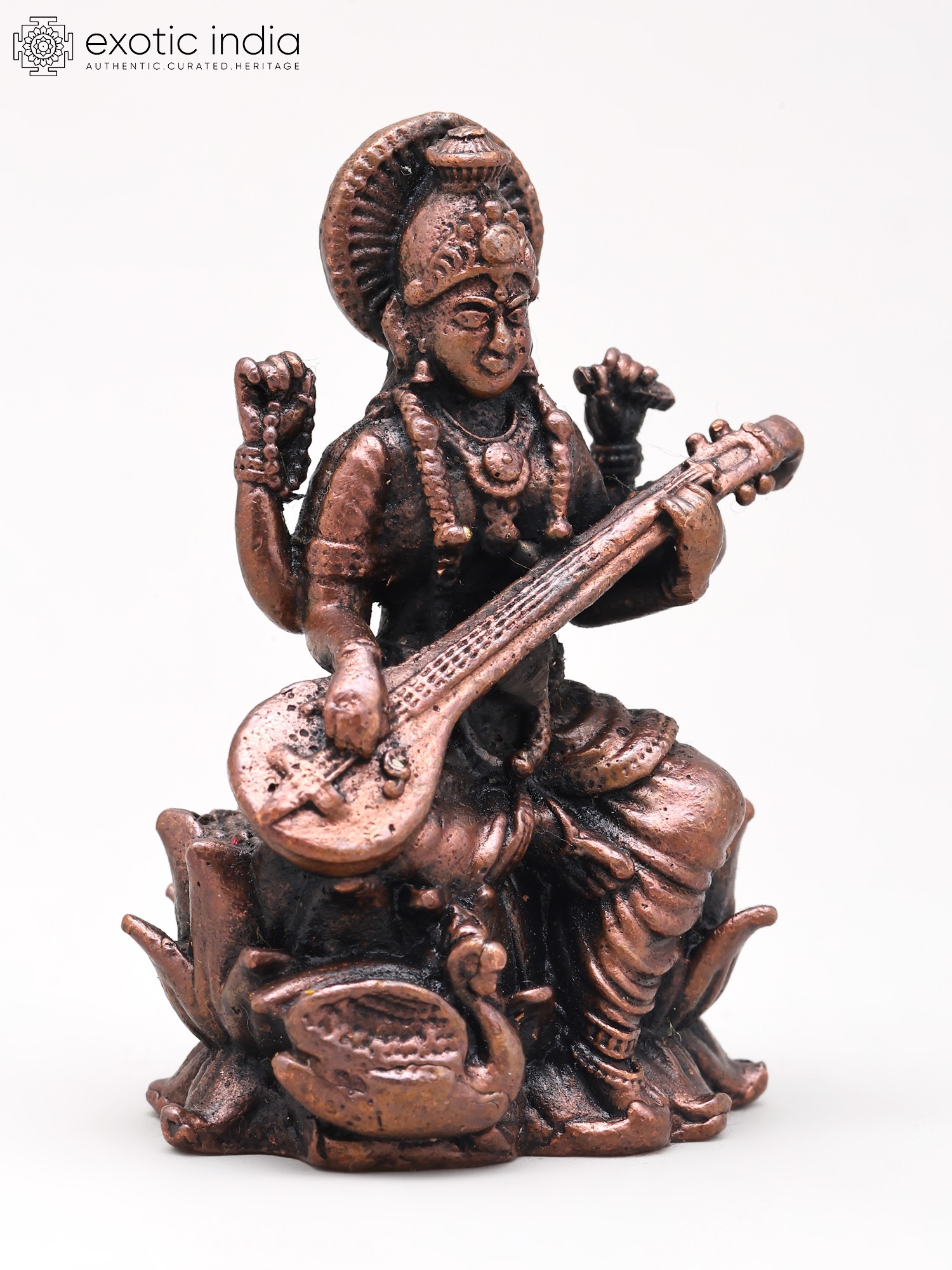 2" Small Goddess Saraswati Seated on Swan | Copper Idol