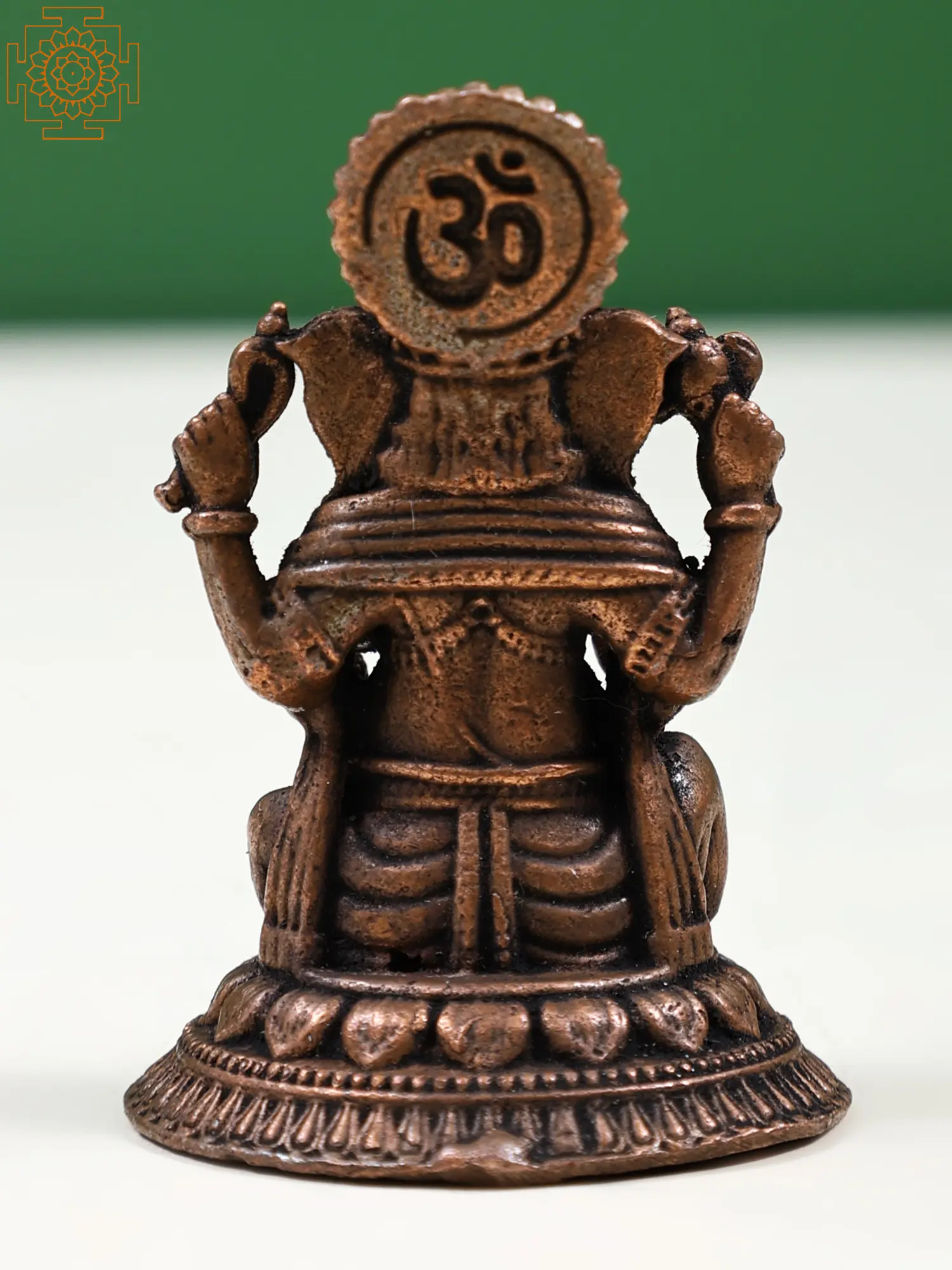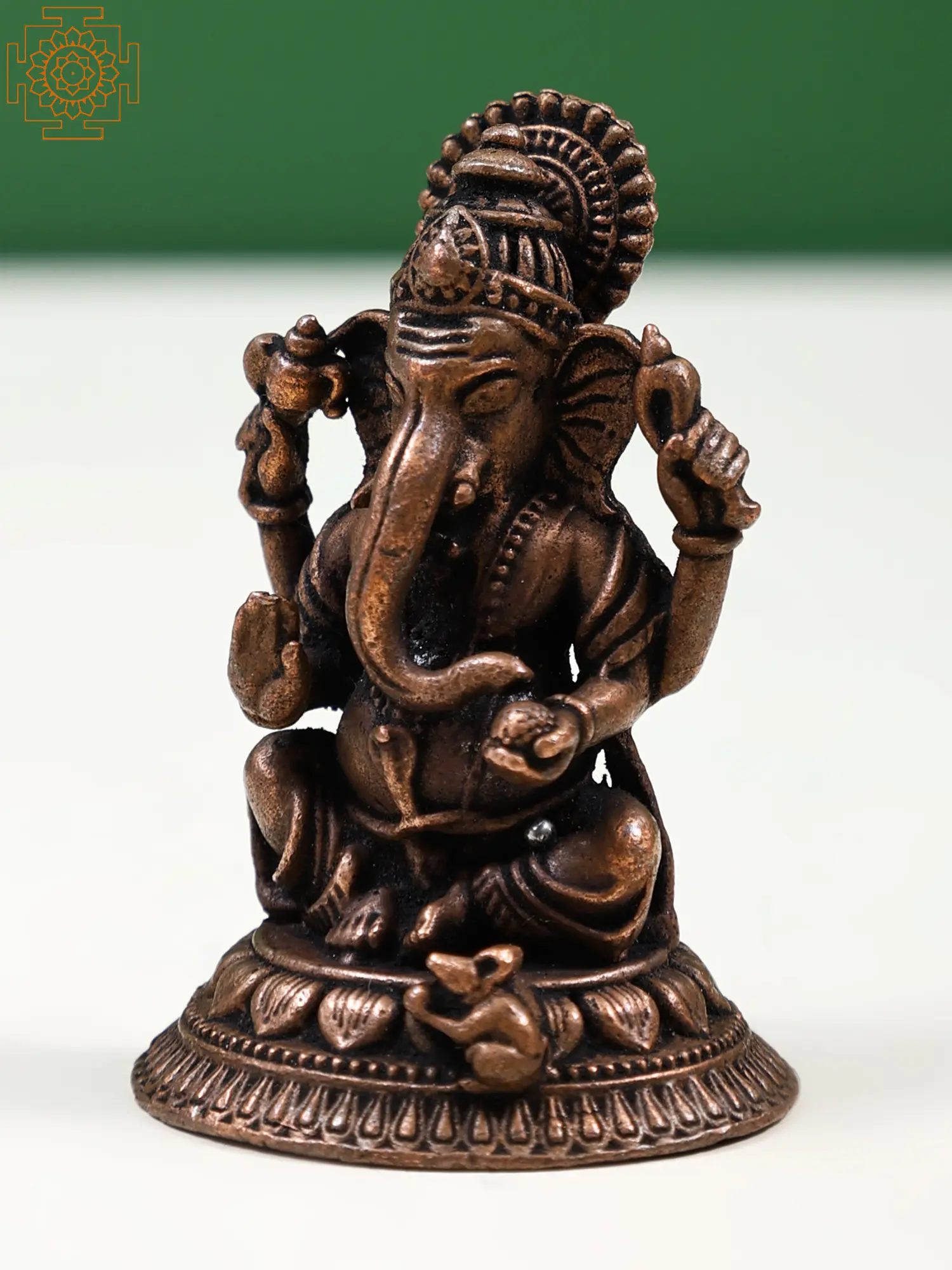 With a pot-bellied appearance, a curved trunk, four arms, the Paasha (noose) and Ankusha (goad) in his secondary hands, and Modaka and a broken tusk in his primary hands, Sri Ganesha is the epitome of his auspicious iconography in this hand-crafted copper statue. For every Hindu household, this statue represents a priceless roopa of the divine Lord. Ganesha is depicted in the regal Maharajalilasana, a rounded pose that expresses his imposing presence in a wholesome way, sitting on a lotus platform. This idol is given a roopa appropriate for the descent of Ganesha's aura into the human realm by the perfection of sculpting.
