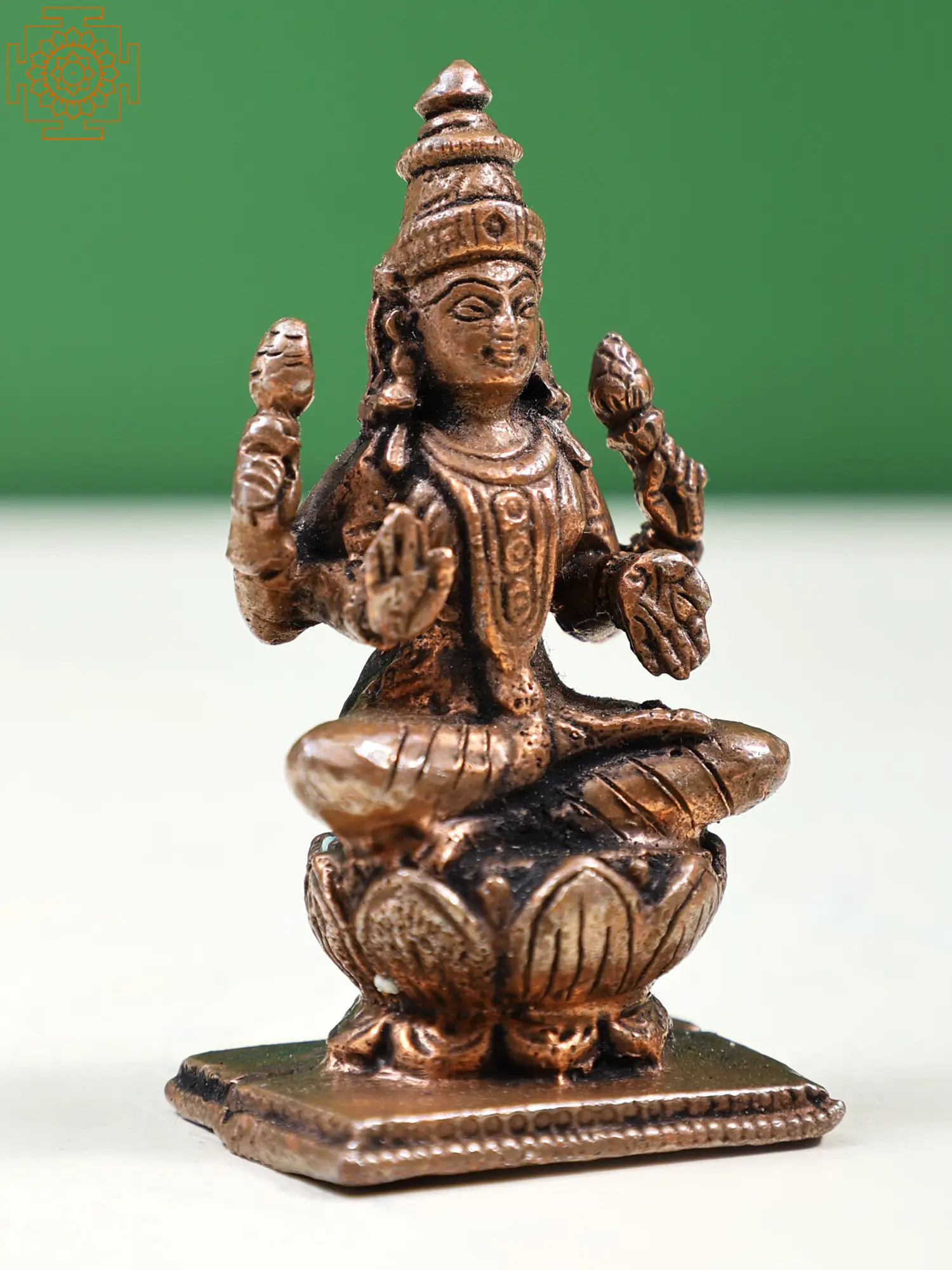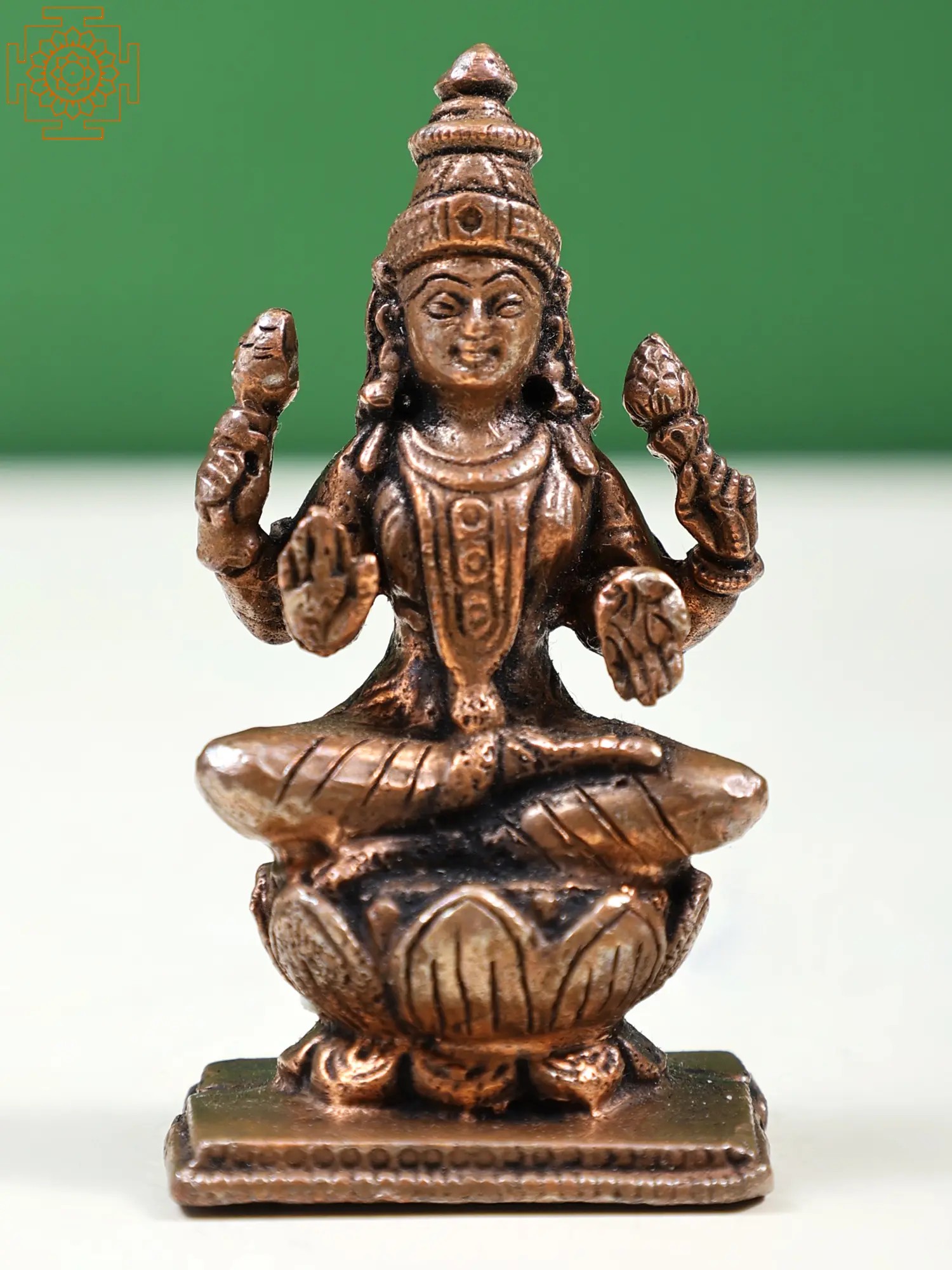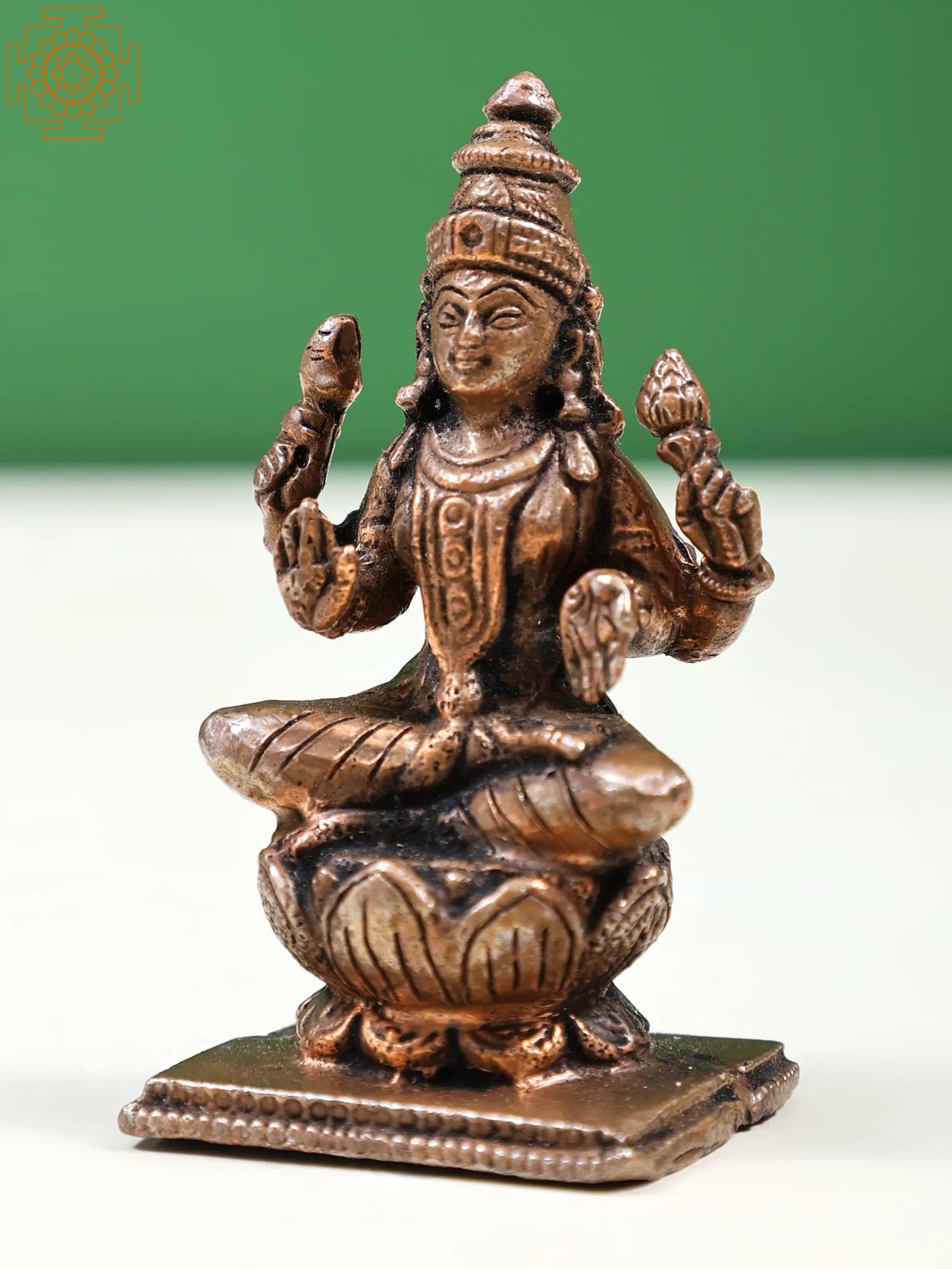 This statue is crafted from pure copper, a metal highly regarded in Vedic traditions for its auspicious properties and its ability to conduct spiritual energy. The artisans have skillfully rendered the delicate features of the goddess, from her serene expression and ornate headdress to the flowing drapery and the lotus pedestal upon which she rests. Each curve and contour speaks of dedication and reverence, resulting in a divine representation that is both aesthetically pleasing and spiritually potent. The small size makes it ideal for personal altars, desk adornment, or as a thoughtful gift for loved ones seeking blessings of prosperity and good fortune.