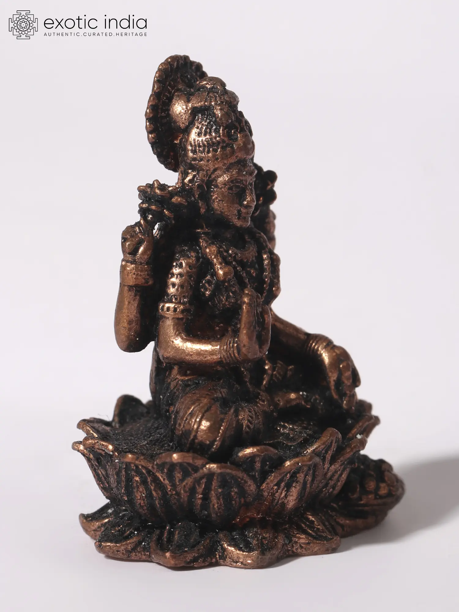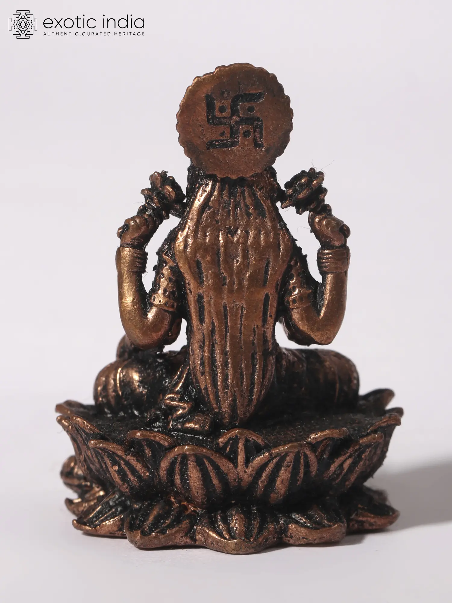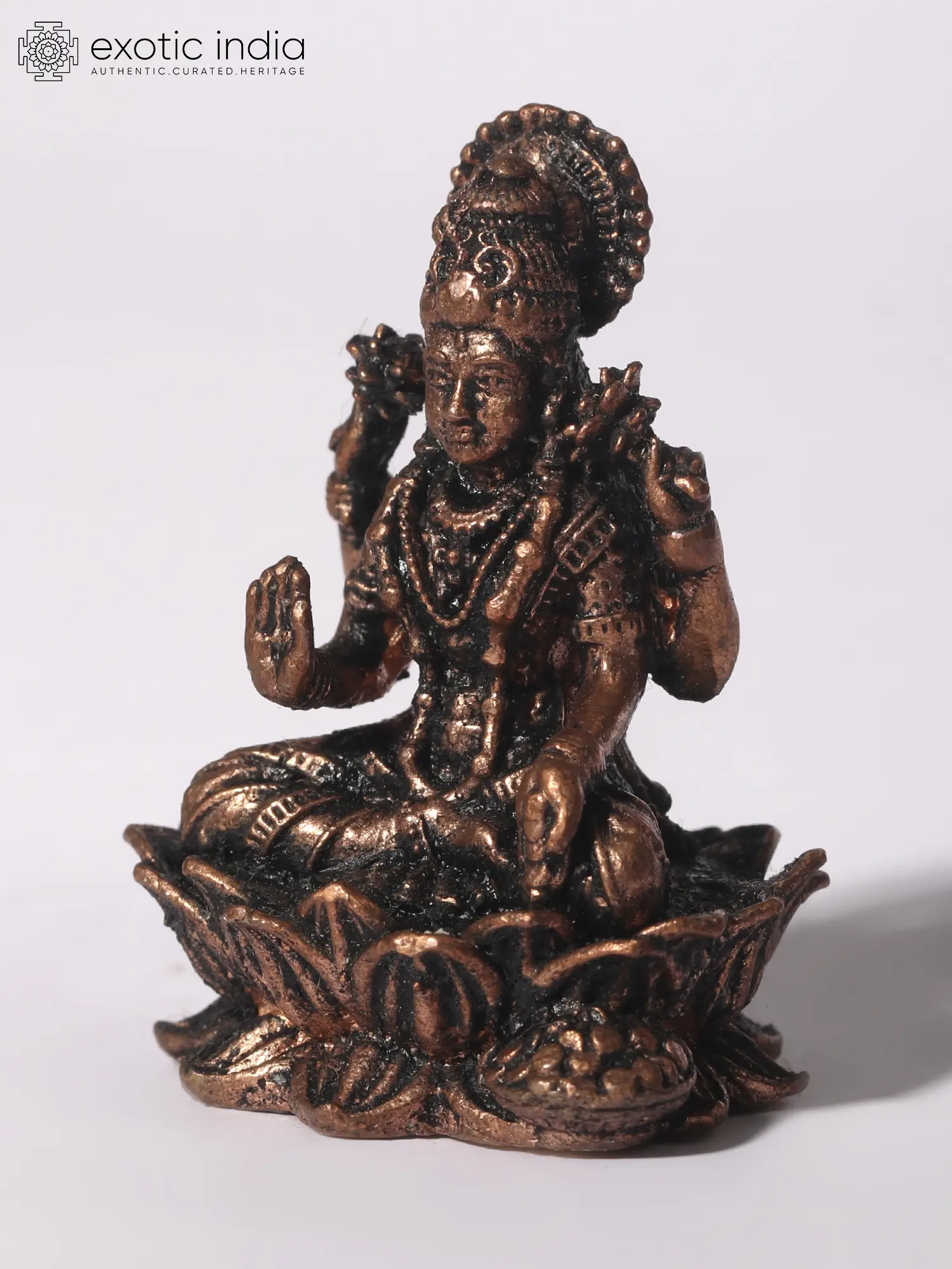 Indulged with the beauty of this copper statue of Goddess Lakshmi, its regal look exudes a warm and metallic glow. Lakshmi is the beloved goddess of wealth, prosperity, and fortune, and is depicted in a seated posture, radiating grace and abundance. Her four arms are ornamented with divine features, which represent her different facets. In her upper two hands, Lakshmi holds lotus flowers, which represent purity, beauty, and fertility.