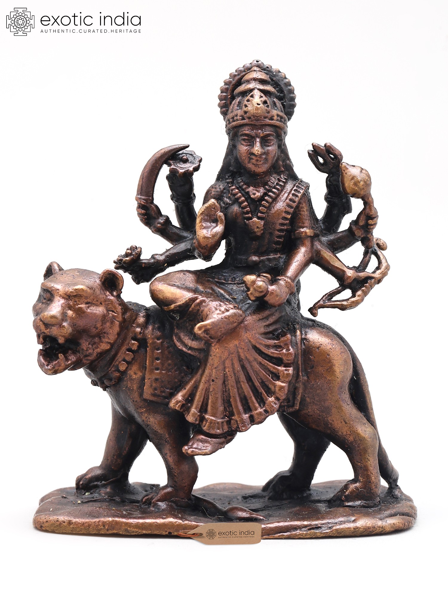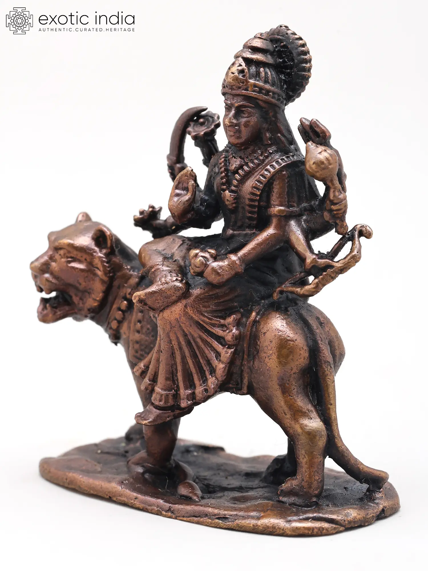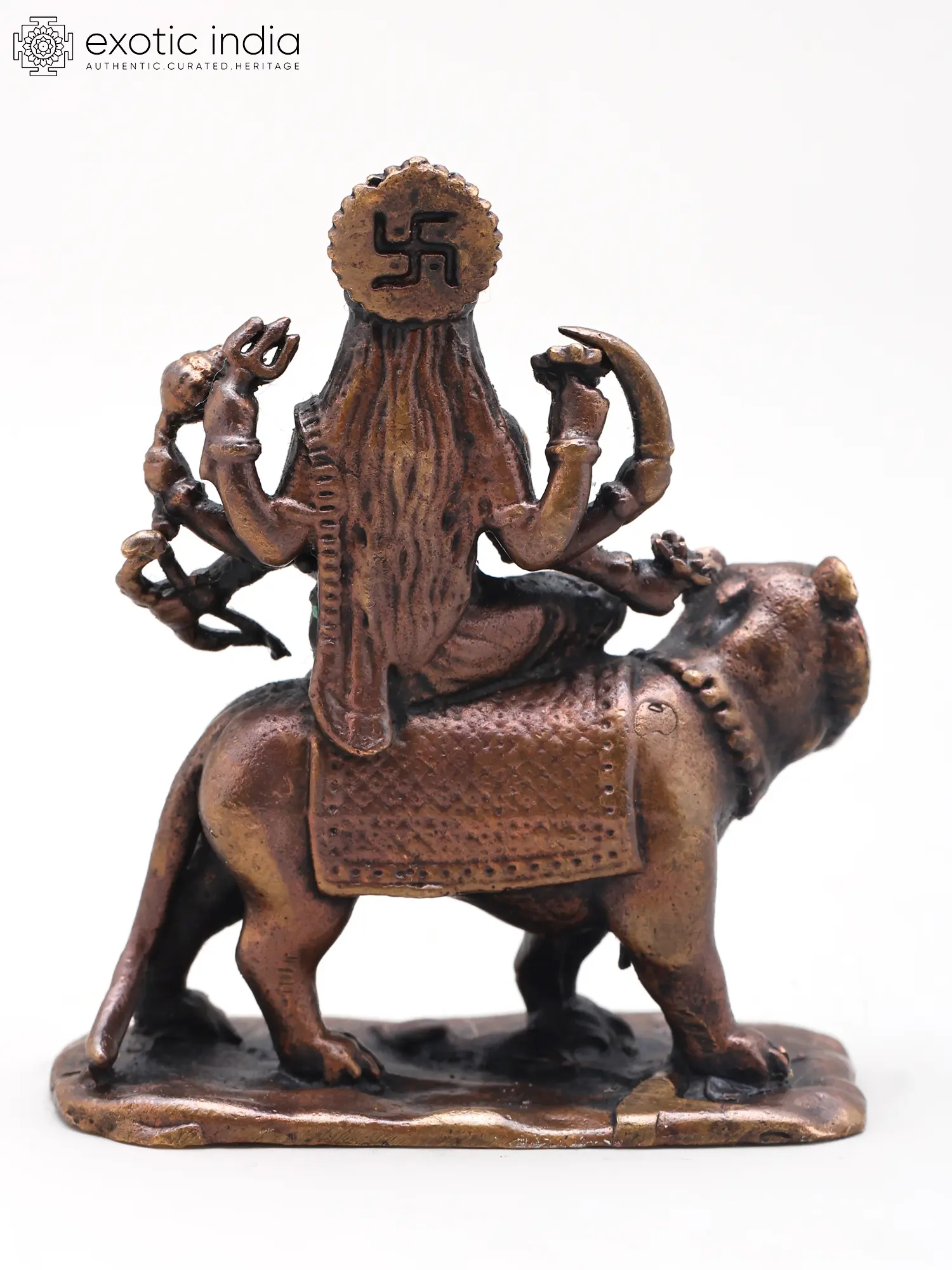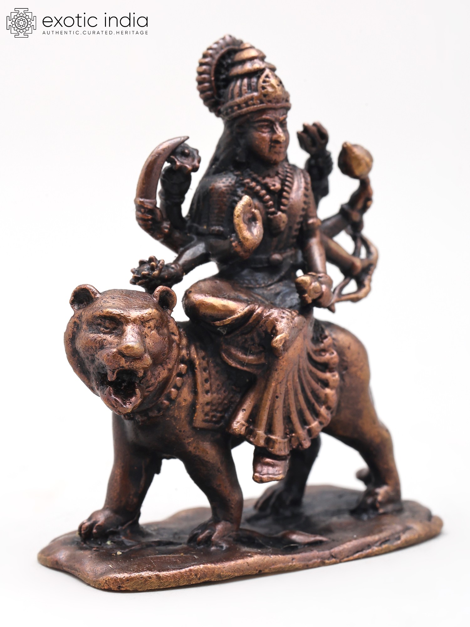 4" Small Ashtabhuja Goddess Durga with Lion | Handmade | Copper Statue | Made in India