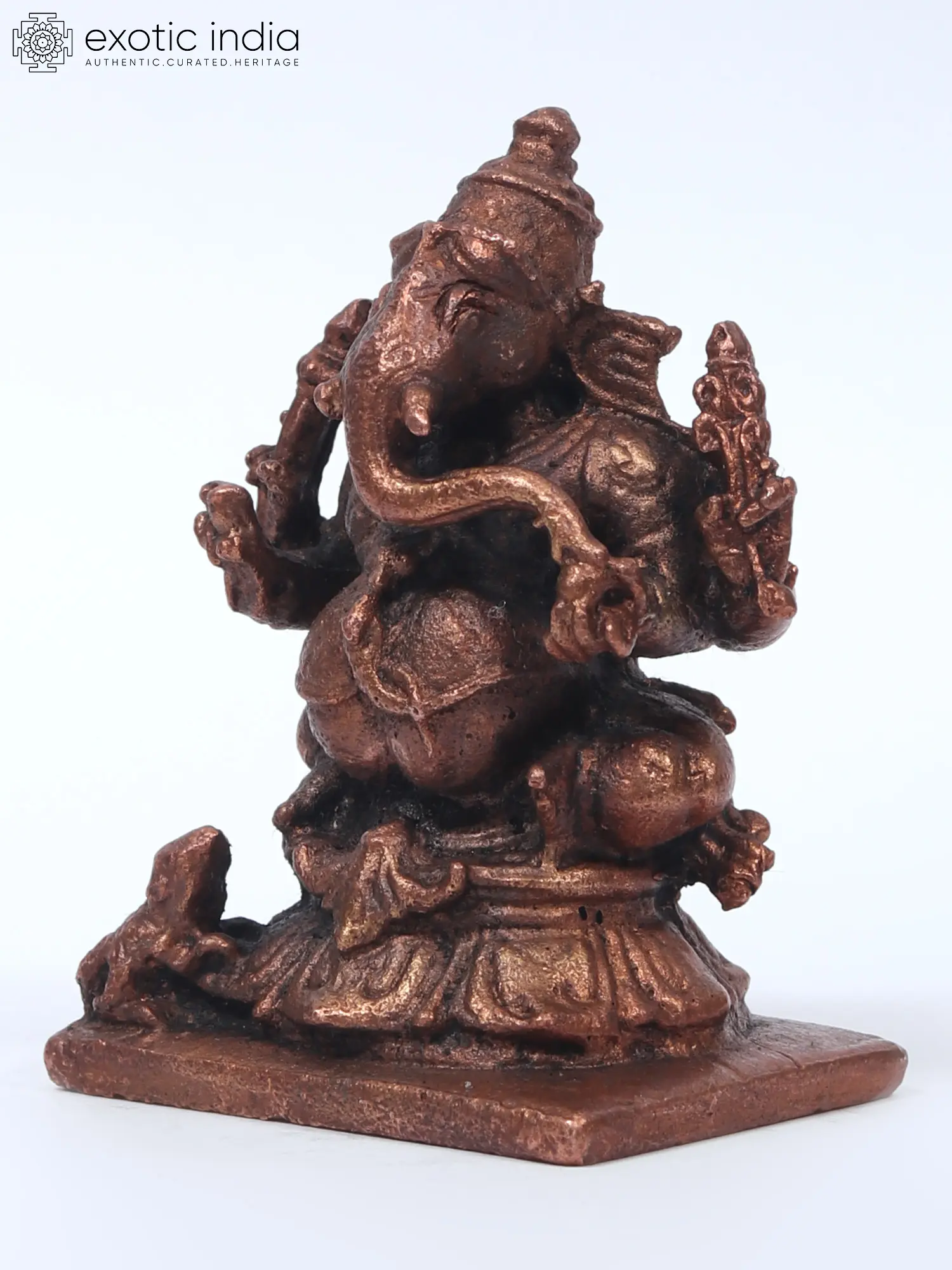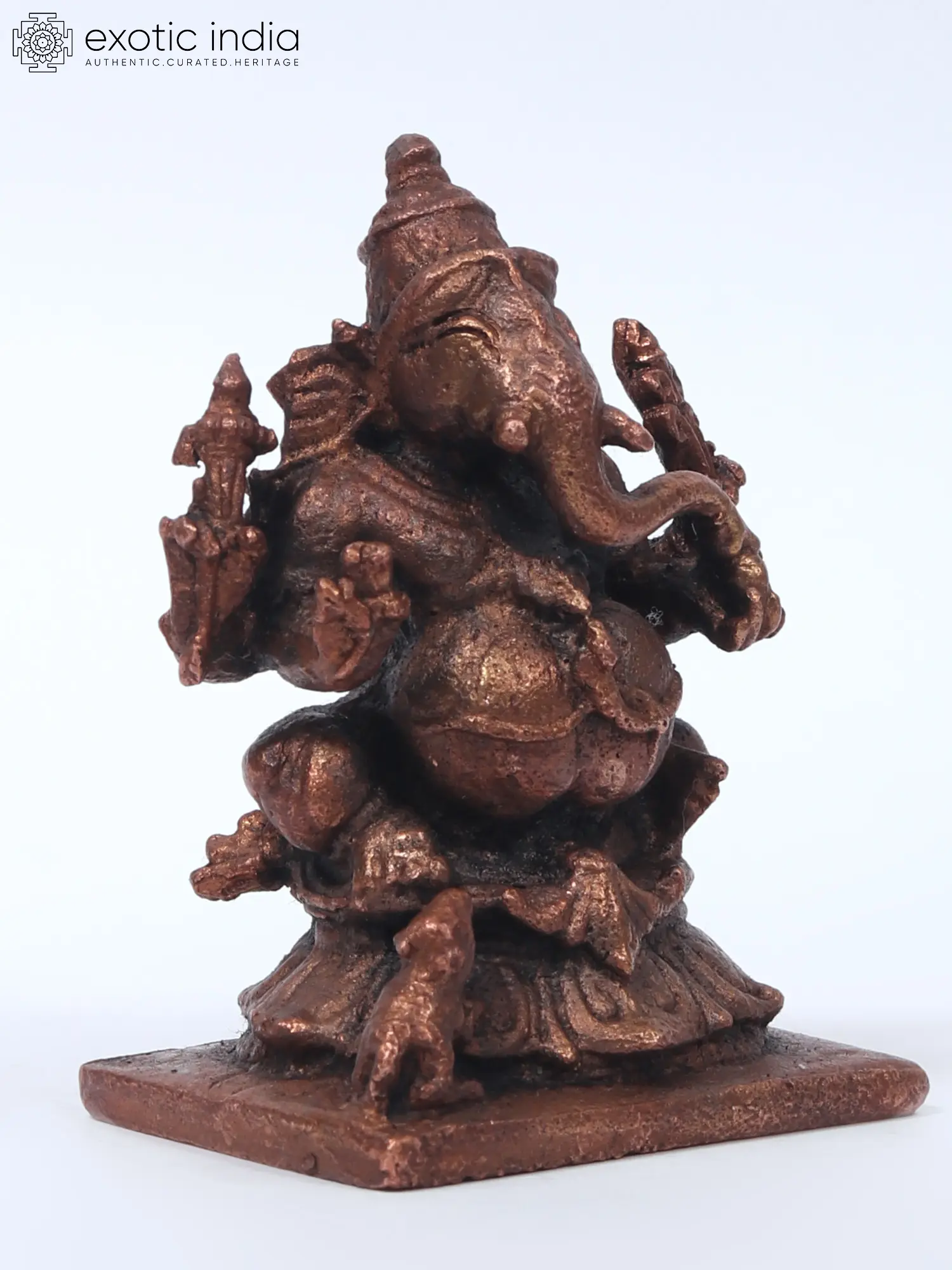This small four-armed Lord Ganapati copper statue is a wonderful depiction of the Lord of Wisdom. It is a poignant observation that Lord Ganesha is the patron of Buddhi, or intelligence, and directs his devotees to the path of wisdom. Lord Ganesha appears in his Chaturbhuj (four-armed) form. He carries an Ankusha or Goad and a Pasha or Lasso in his two upper hands, a modak in his lower hand, and his other hand in a Varada position. He sits on a Lotus podium, adorned with a Lotus crown and halo. The statue's brown lacquer finish makes it more appealing. It reminds us that Lord Ganesha is always watching over us and safeguarding us with four hands.