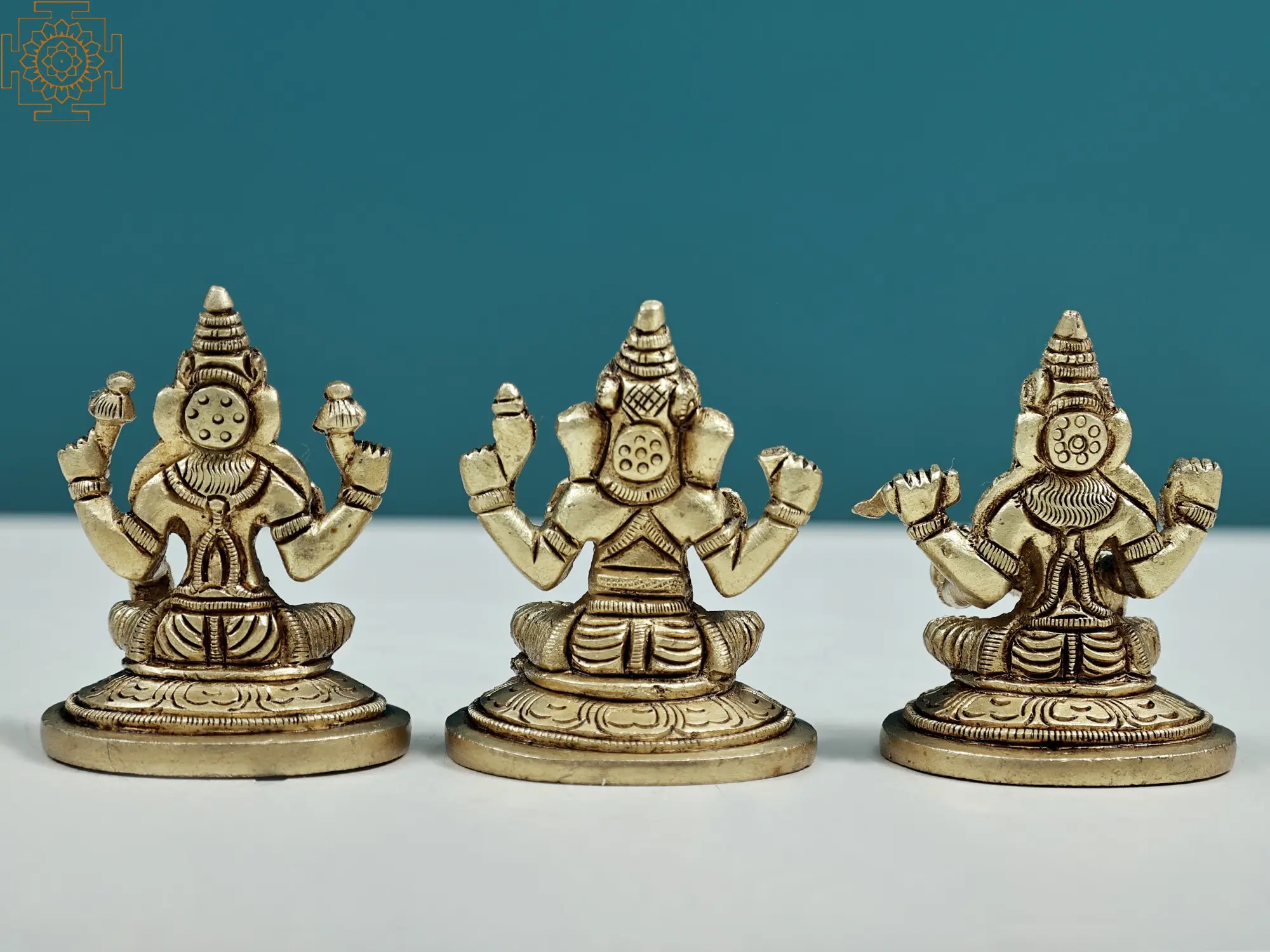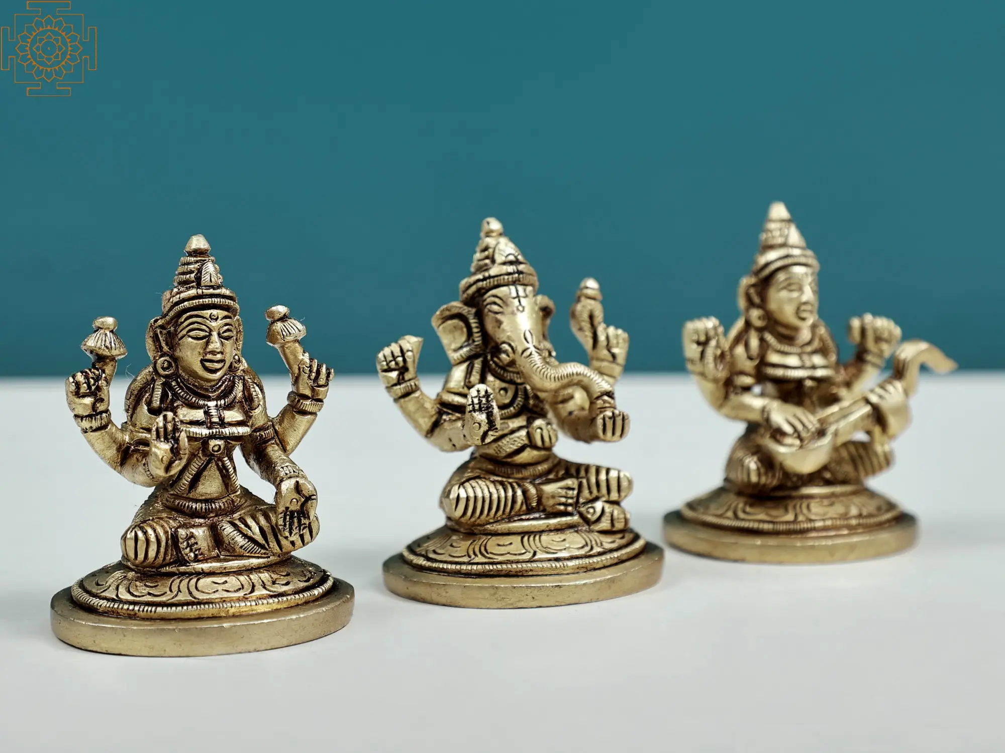 2" Small Ganesha Lakshmi and Saraswati (Set of Three Statues) in Brass