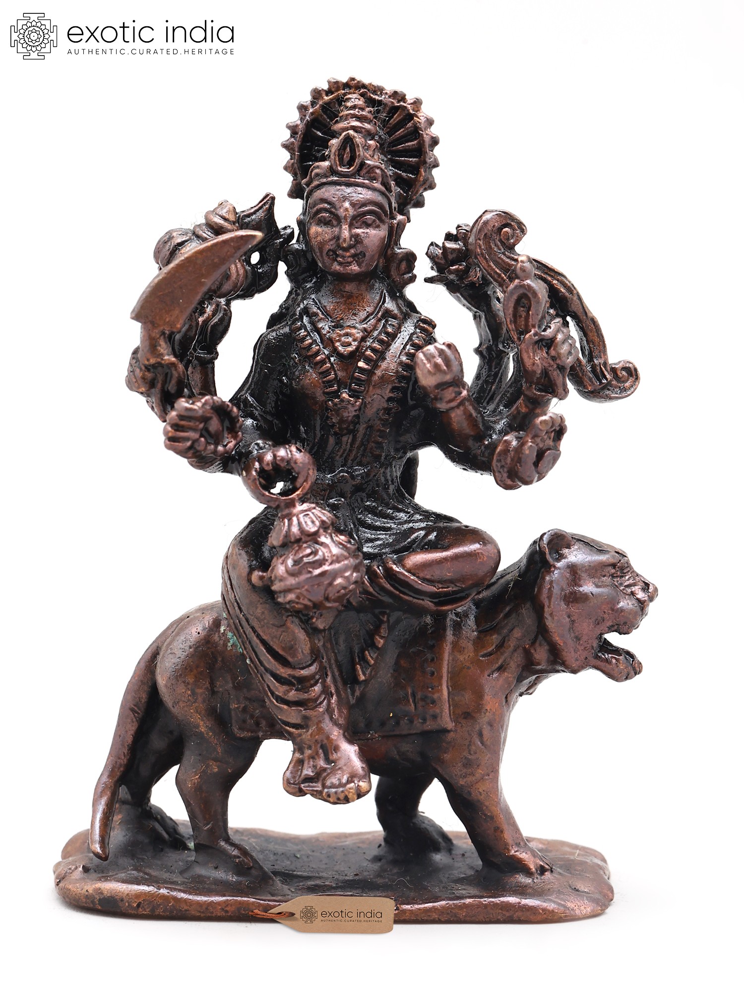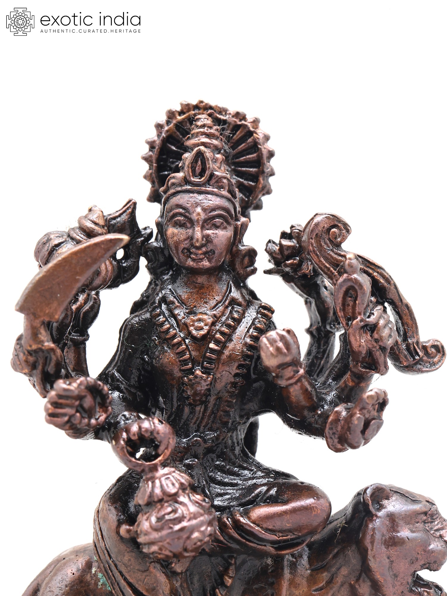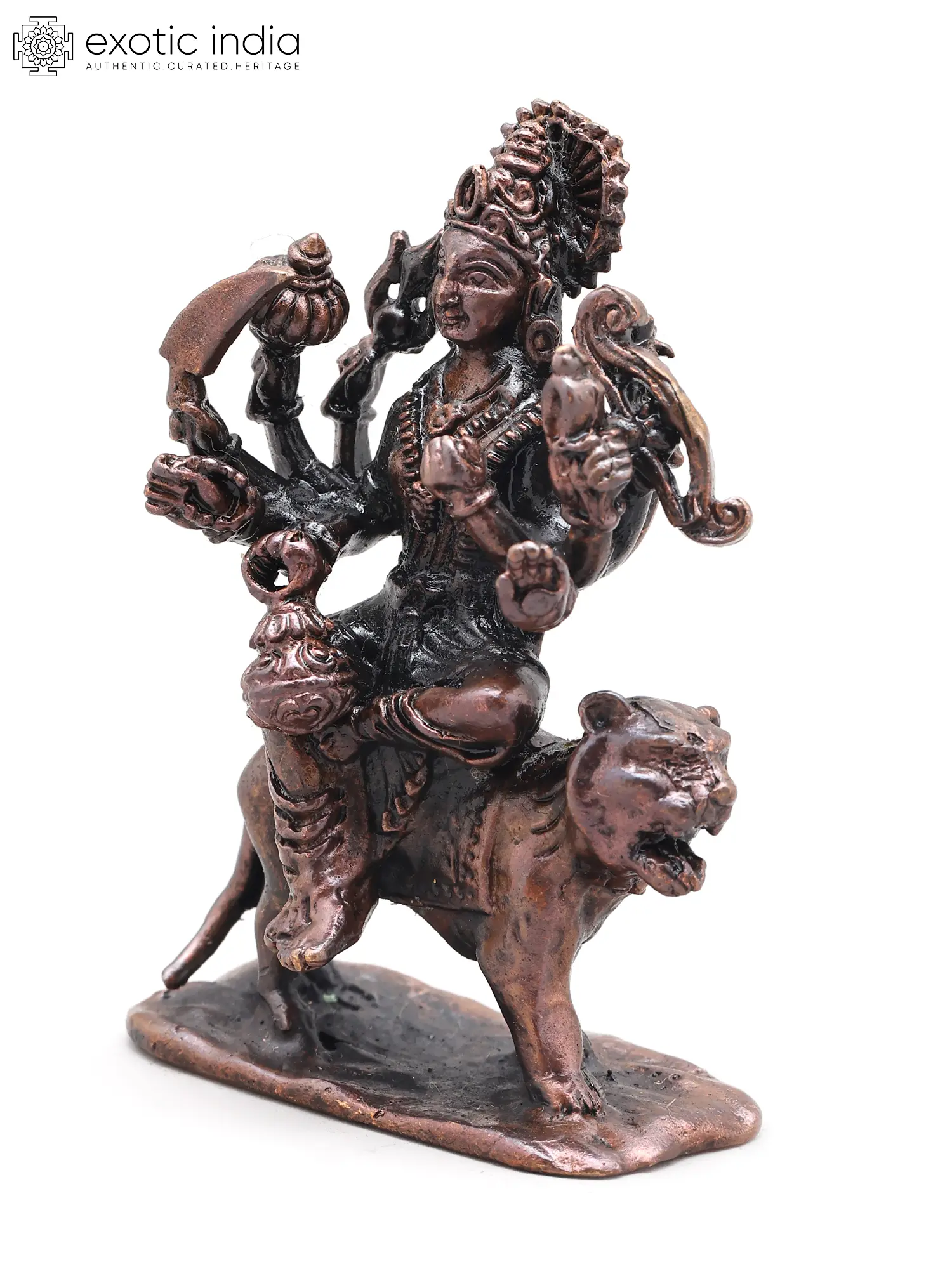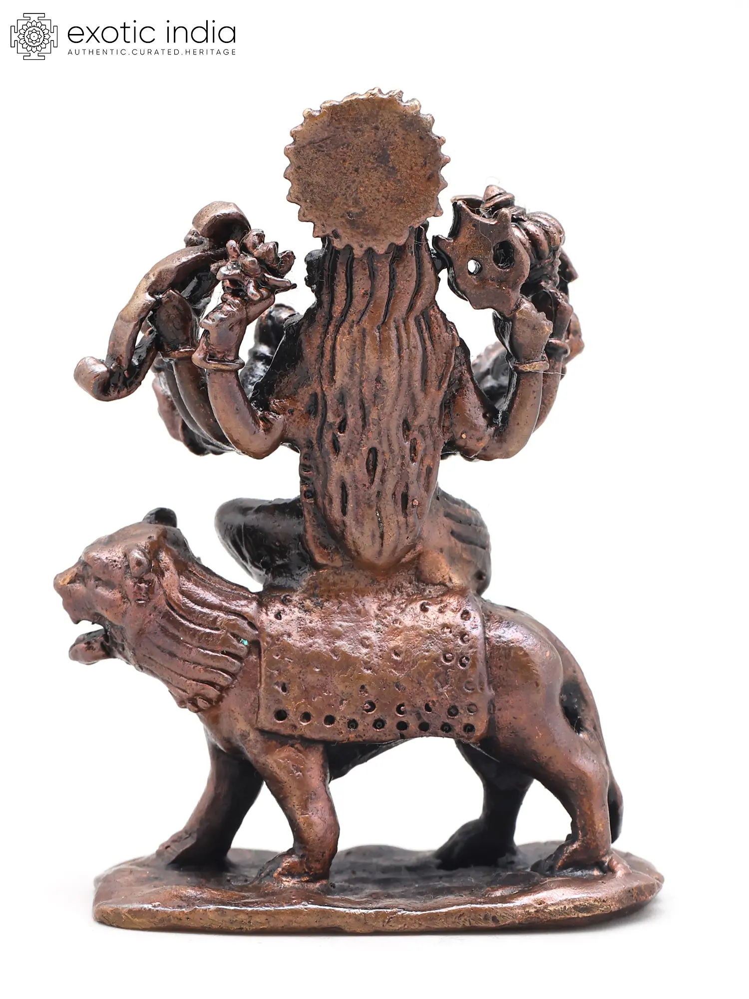 4" Small Ashtabhuja Goddess Durga with Lion | Handmade | Copper Statue | Made in India