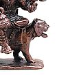 The commanding presence of the divine mother is captured in her serene yet powerful seated posture, her numerous arms extended to hold symbolic implements. Observe the delicate rendering of her facial features, conveying both compassion and resolve. The majestic tiger upon which she is mounted exudes a raw, untamed energy, its muscular form captured with striking realism, measuring 2.7 x 2.0 x 1.0 inches, it fits perfectly in any dedicated space.