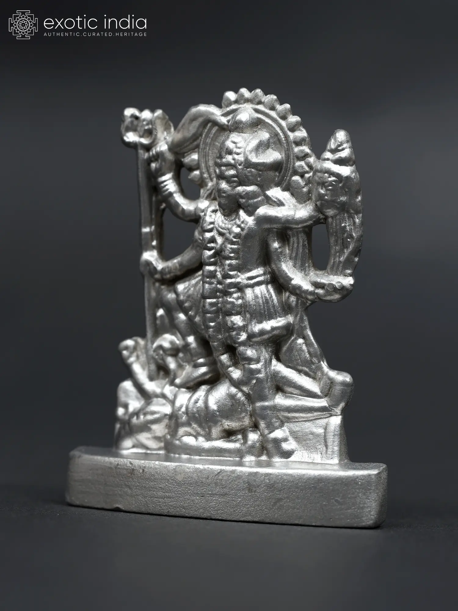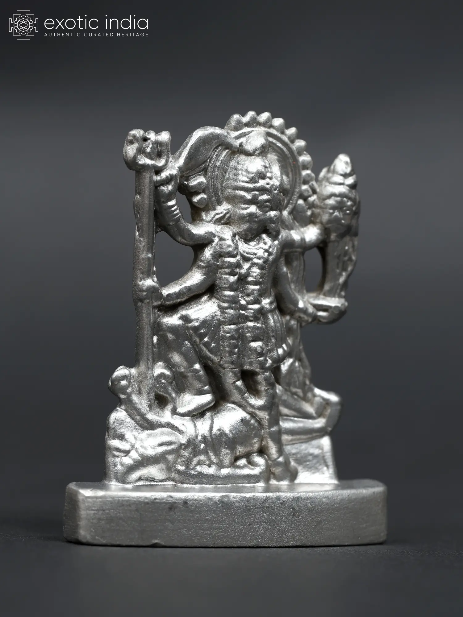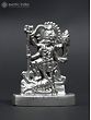 This exquisite miniature statue captures the potent and multifaceted essence of Goddess Kali, one of the most revered and formidable deities in the Hindu pantheon. Crafted from lustrous mercury, its cool, metallic sheen enhances the divine energy emanating from the depiction. Standing at a modest size, this representation is perfect for intimate altars, personal spaces, or as a travel companion, allowing you to carry the goddess's blessings wherever you go. The iconography of Kali is rich with symbolism, representing the primal force of creation, preservation, and destruction, often seen as the ultimate form of the divine feminine energy, Shakti. She is the destroyer of ego, ignorance, and evil, paving the way for spiritual liberation. In this rendition, Kali stands with her characteristic multi-armed posture, each hand poised to wield her symbolic weapons or hold offerings, signifying her power and control over the cosmic dance of existence. Her fierce countenance, often depicted with a lolling tongue and wide eyes, is not one of malice, but of an unwavering determination to obliterate all that hinders spiritual progress. ––––––––––––––––––––