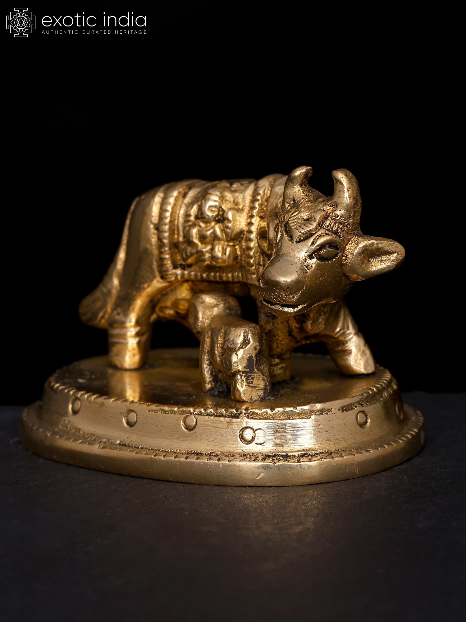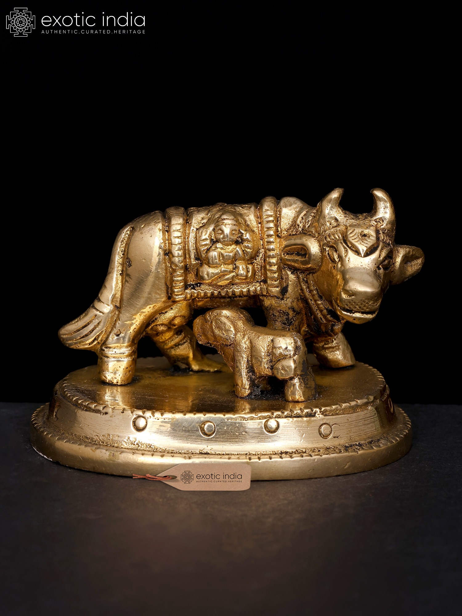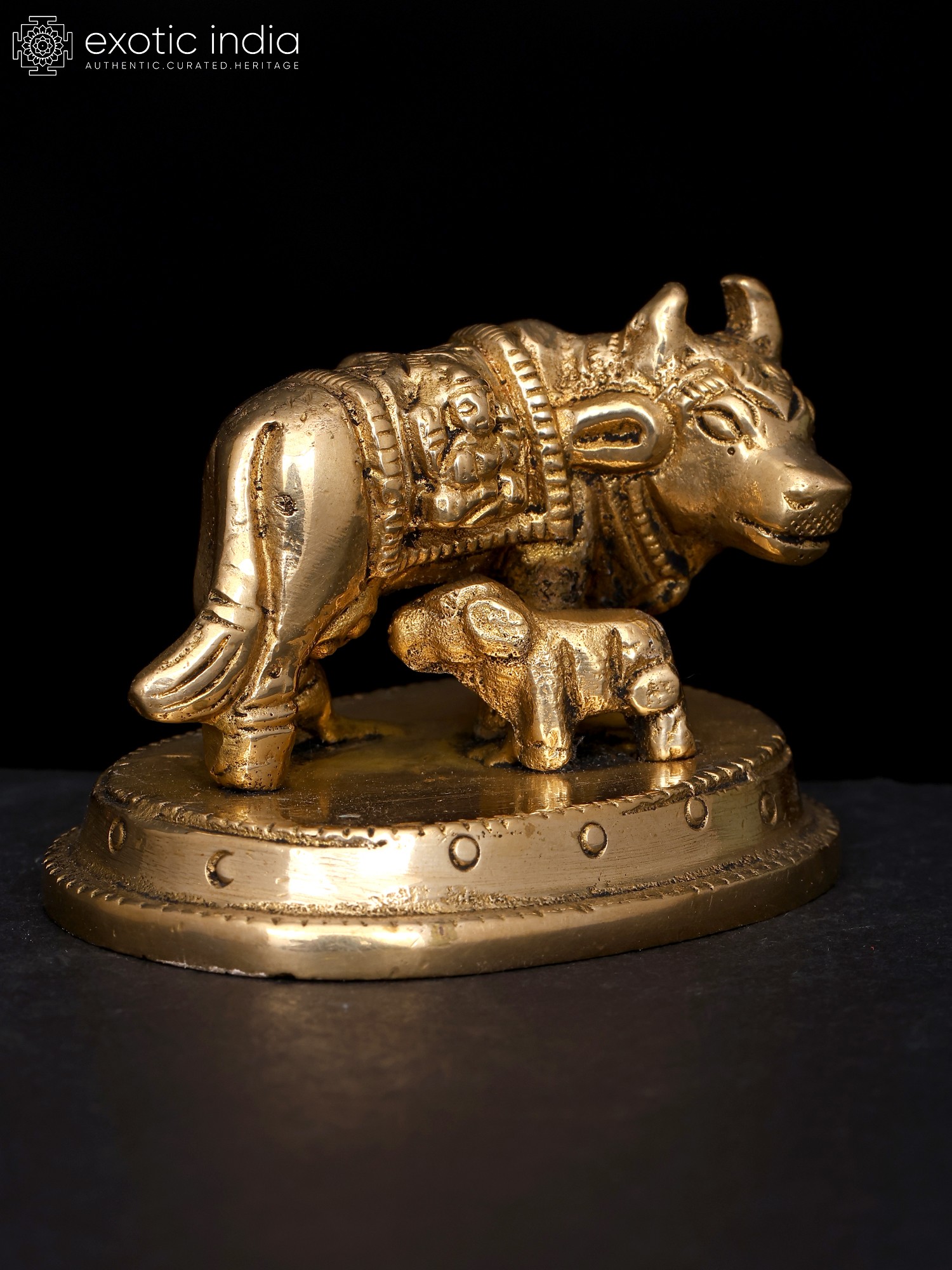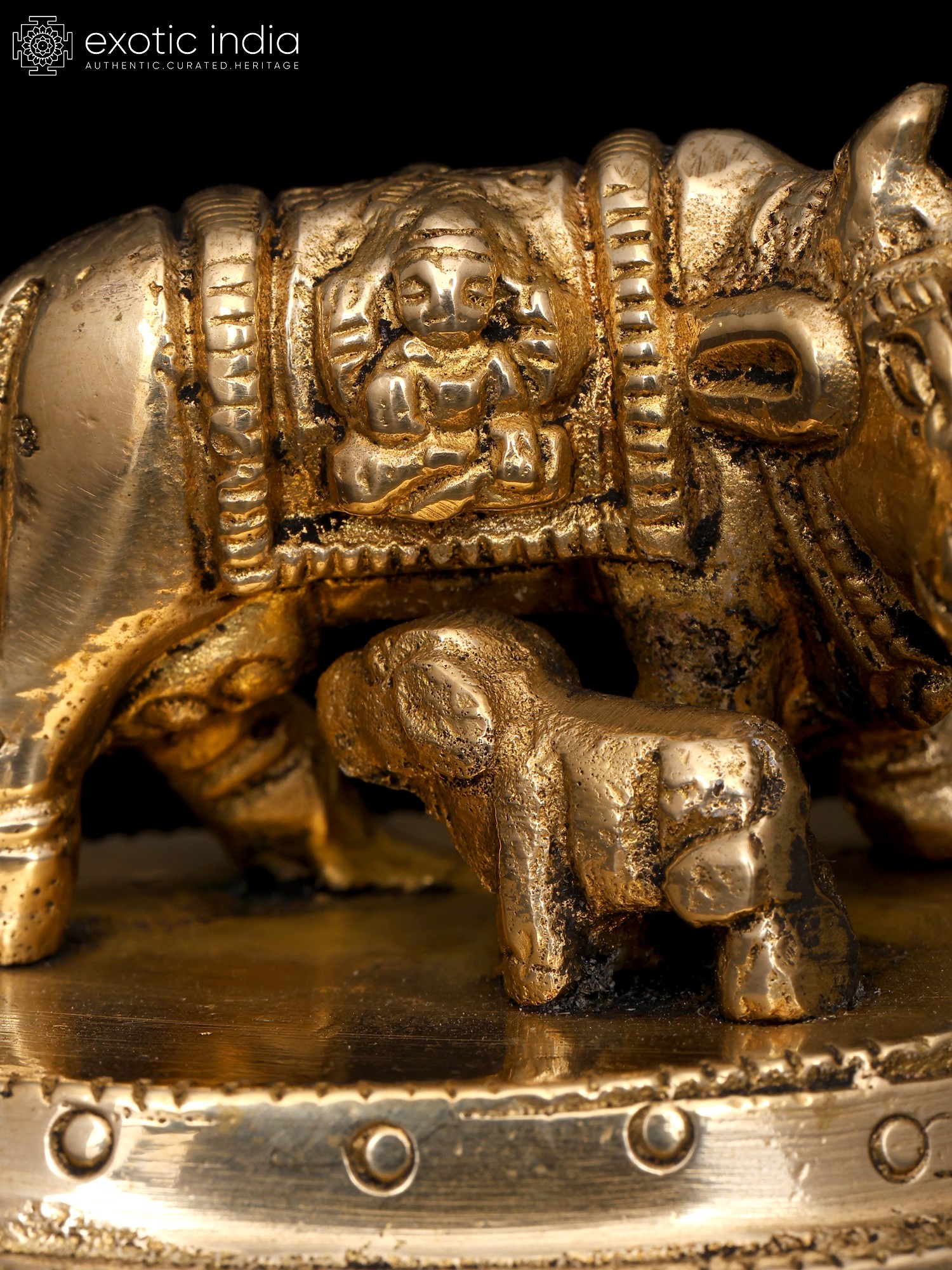 In the realm of sacred art, Kamadhenu, the mother of all cows, also known as Surbhi, is the divine symbol of abundance and desire fulfilment. She stands as a radiant embodiment of ancient wisdom. She cradles her calf, bestowing upon it the gift of life and nourishment. Her benevolent eyes, gleaming with tranquillity, beckon us into a world where wishes are whispered into the gentle breeze of possibility. This brass masterpiece is a gateway to the profound, an oracle of prosperity, where the nurturing mother and her offspring symbolise the boundless blessings and unending sustenance that flows from the eternal wellspring of our dreams.