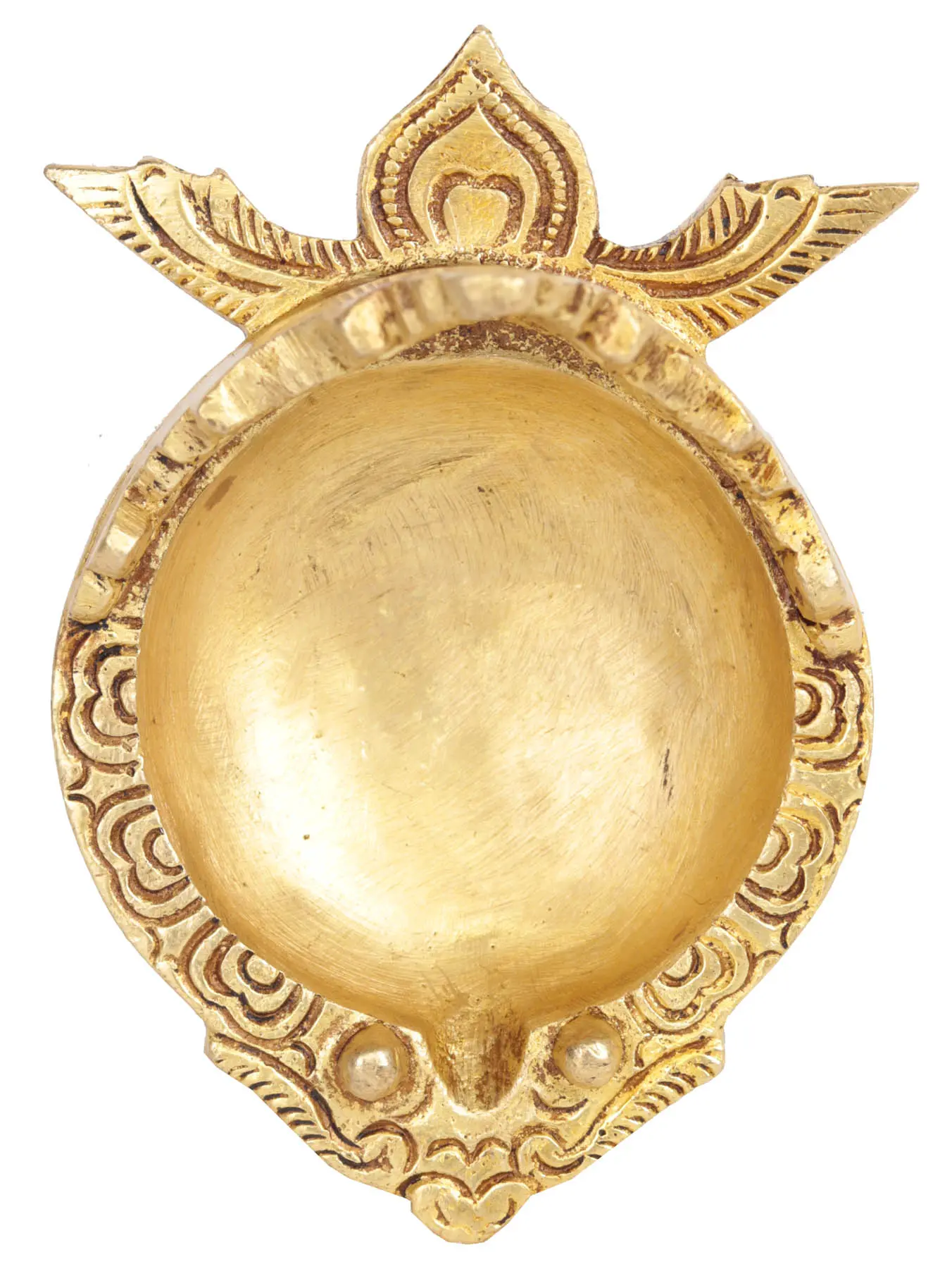 This lamp is constructed of brass and has a one-of-a-kind design; the primary oil container is leaf-shaped with beautiful carvings on the mouth, and the light stands on a well-decorated pedestal. When seen from above, it features a crown image that resembles a blossomed lotus. The lotus symbolizes wisdom, and its appearance on a lamp represents the role of light in teaching information.
