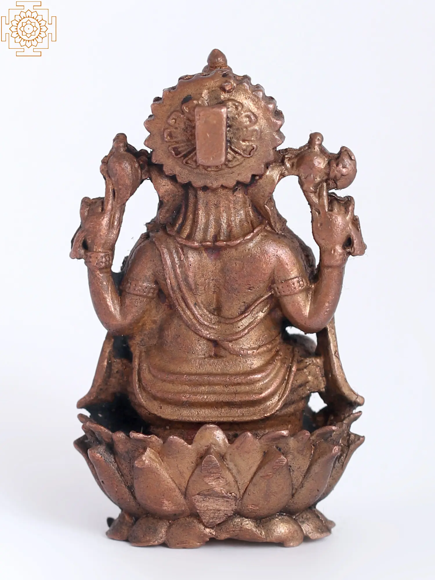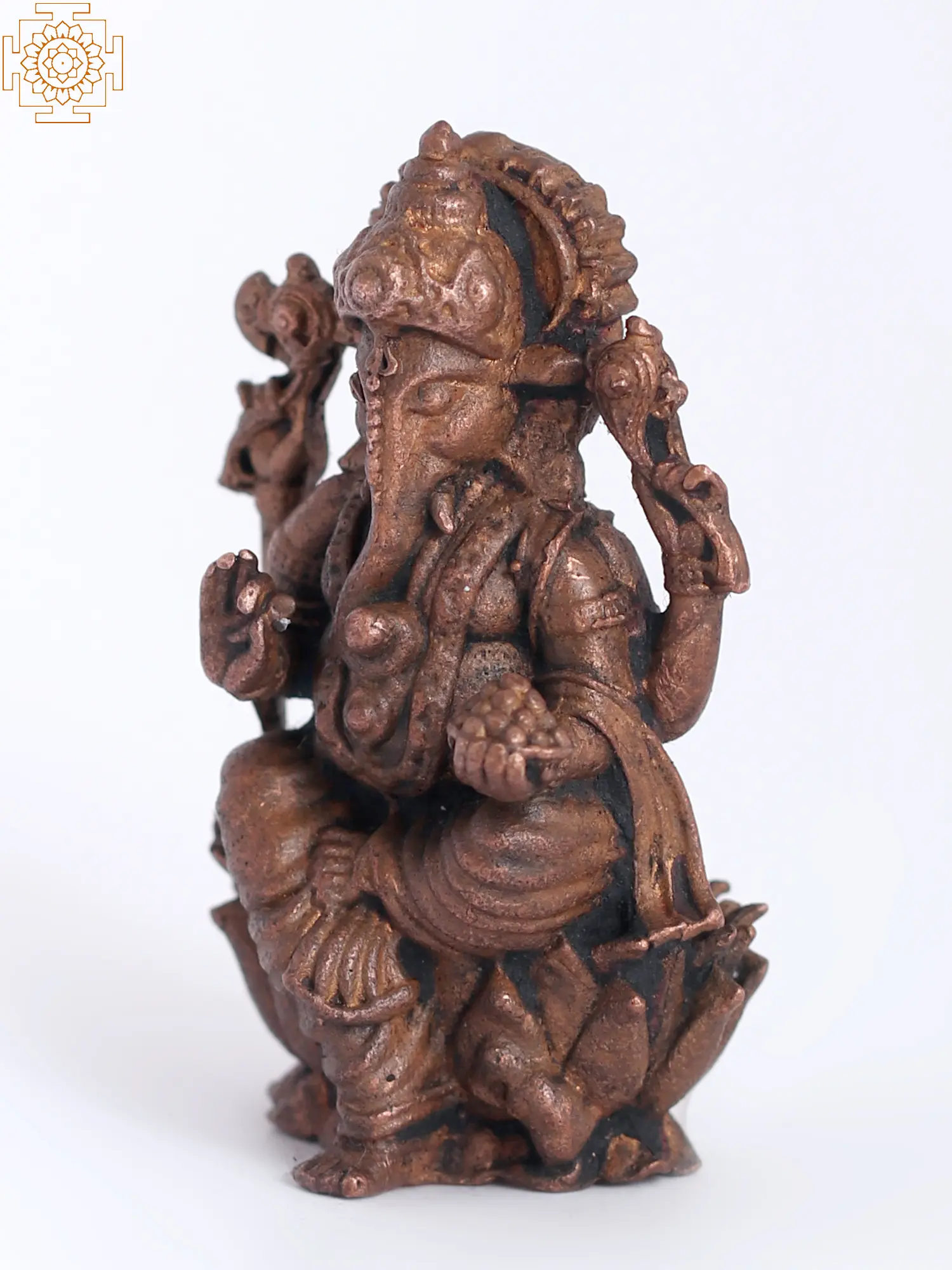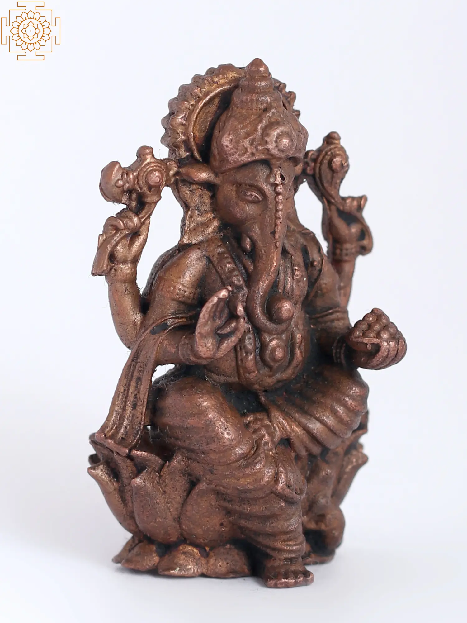 In this beautiful copper statue of Sri Ganesha- with a dotting pot-bellied figure, a curving trunk, four arms, Paasha (a noose) and Ankusha (a goad) in his secondary hands, and Modaka and a broken tusk in his primary hands, his divinity is condensed in this auspicious iconography. This statue is a propitious representation of the divine Lord for every Hindu household. Ganesha is depicted in the regal Lalitasana, a pose that expresses his imposing presence in a wholesome way, sitting on a lotus platform. The timeless copper is given a roopa appropriate for Ganesha's aura's descent into the human realm by playing with fine lines and details that fill the idol with heavenliness.