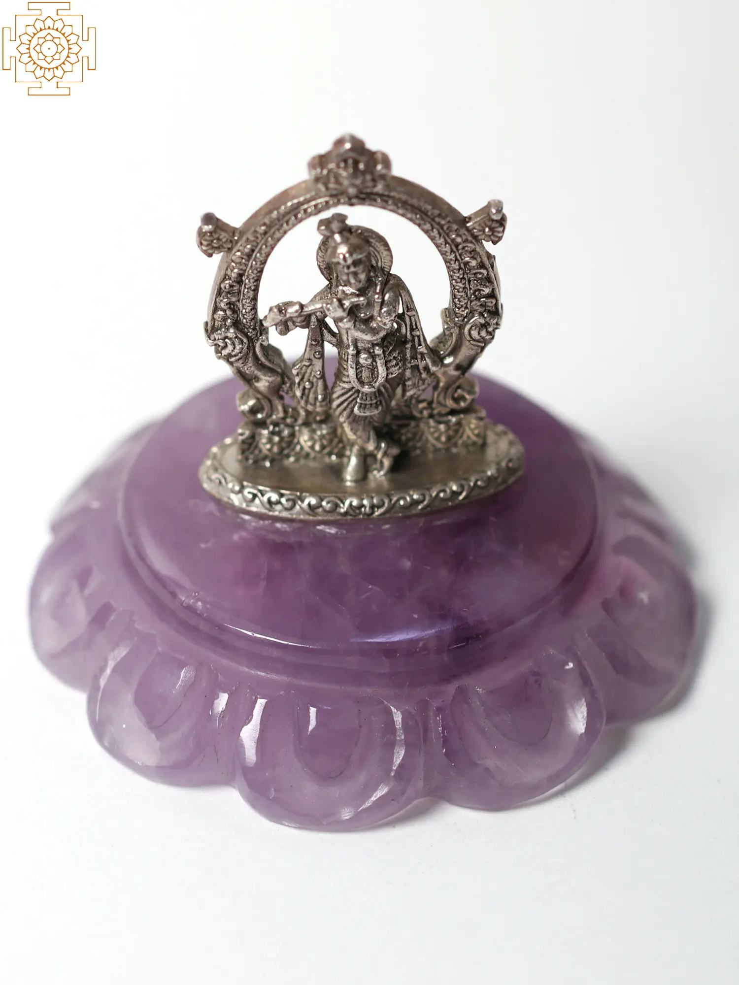 2" Small Natural Amethyst Gem Stone Base with Lord Krishna Idol in Silver