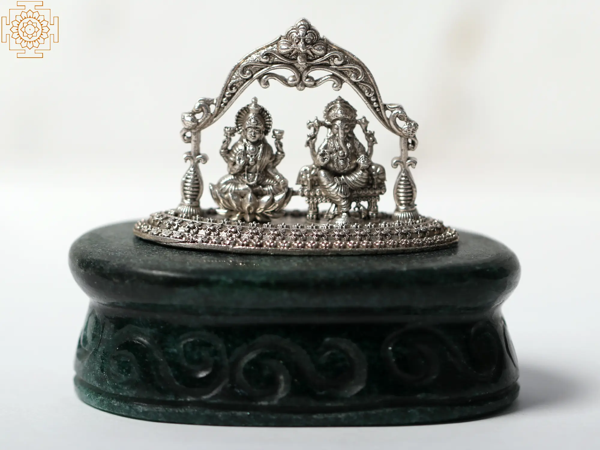 Green aventurine according to experts is a stone synonymous with abundance of luck and auspiciousness. In this small statue, the stone is used to craft the base for the thrones of Lakshmi and Ganesha- the deities of fortune and goodness in Hindu tradition. The stone base is beautifully crafted, on which the divinities are placed on their royal seats, surrounded by a splendid Kirtimukha aureole which brings a sense of grandeur to the murti. Made with pure silver which is a metal associated with richness and luxury, these icons of Lakshmi-Ganesha will be the bearers of unending prosperity and fate in your life.