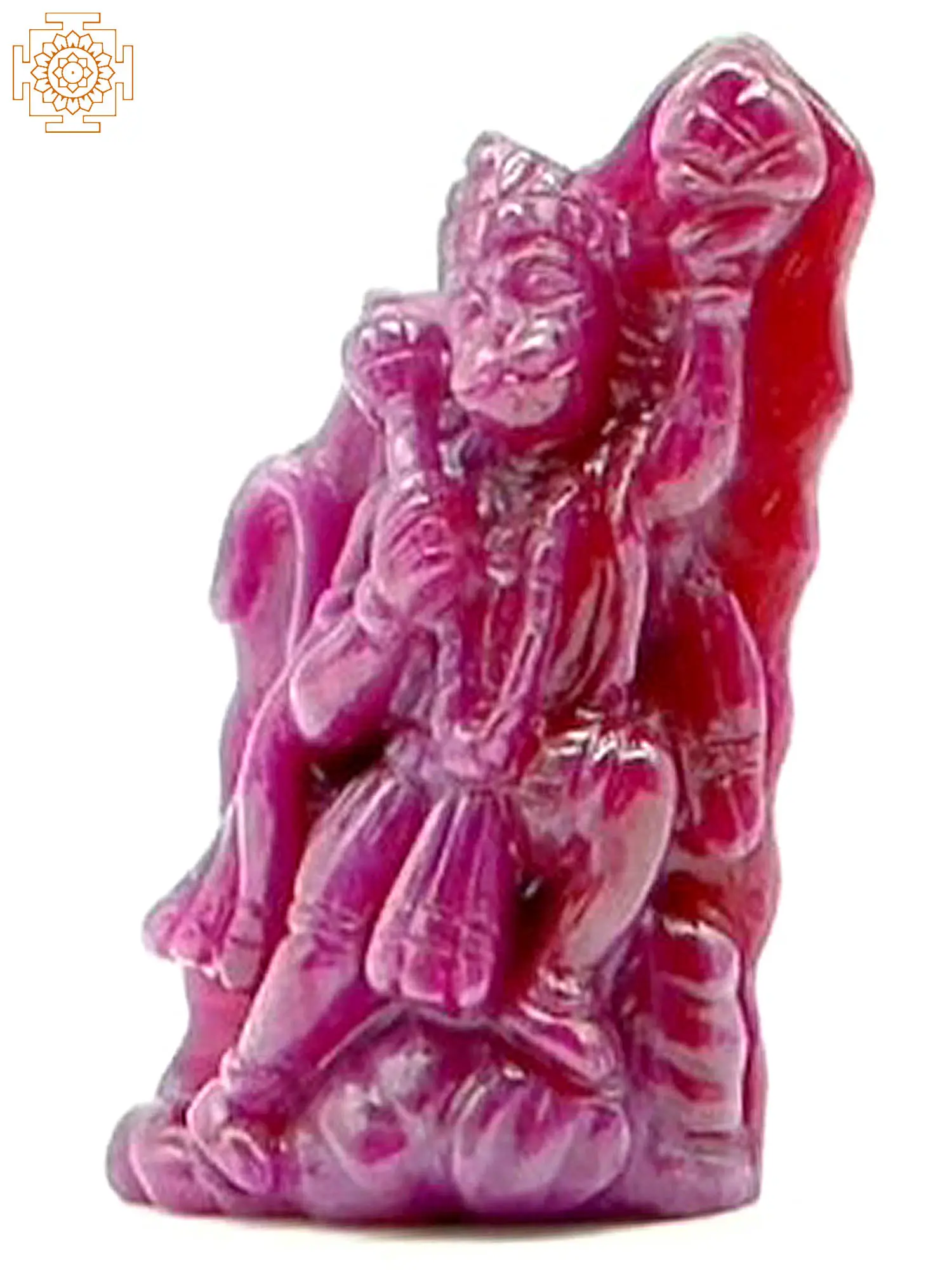 "Ruby courage, Hanuman's devotion." In this sculpture, Lord Hanuman's unwavering devotion is vividly captured as he lifts the Sanjeevani Mountain. The radiant ruby gemstone encapsulates his fiery spirit and unshakable faith. Hanuman's form is a testament to his colossal strength and boundless courage. As he cradles the mountain, his heart pulsates with love and dedication, symbolizing selflessness and unwavering determination. This portrayal of Hanuman reminds us that even the loftiest challenges can be surmounted with the power of devotion and courage, illuminating the path to victory.