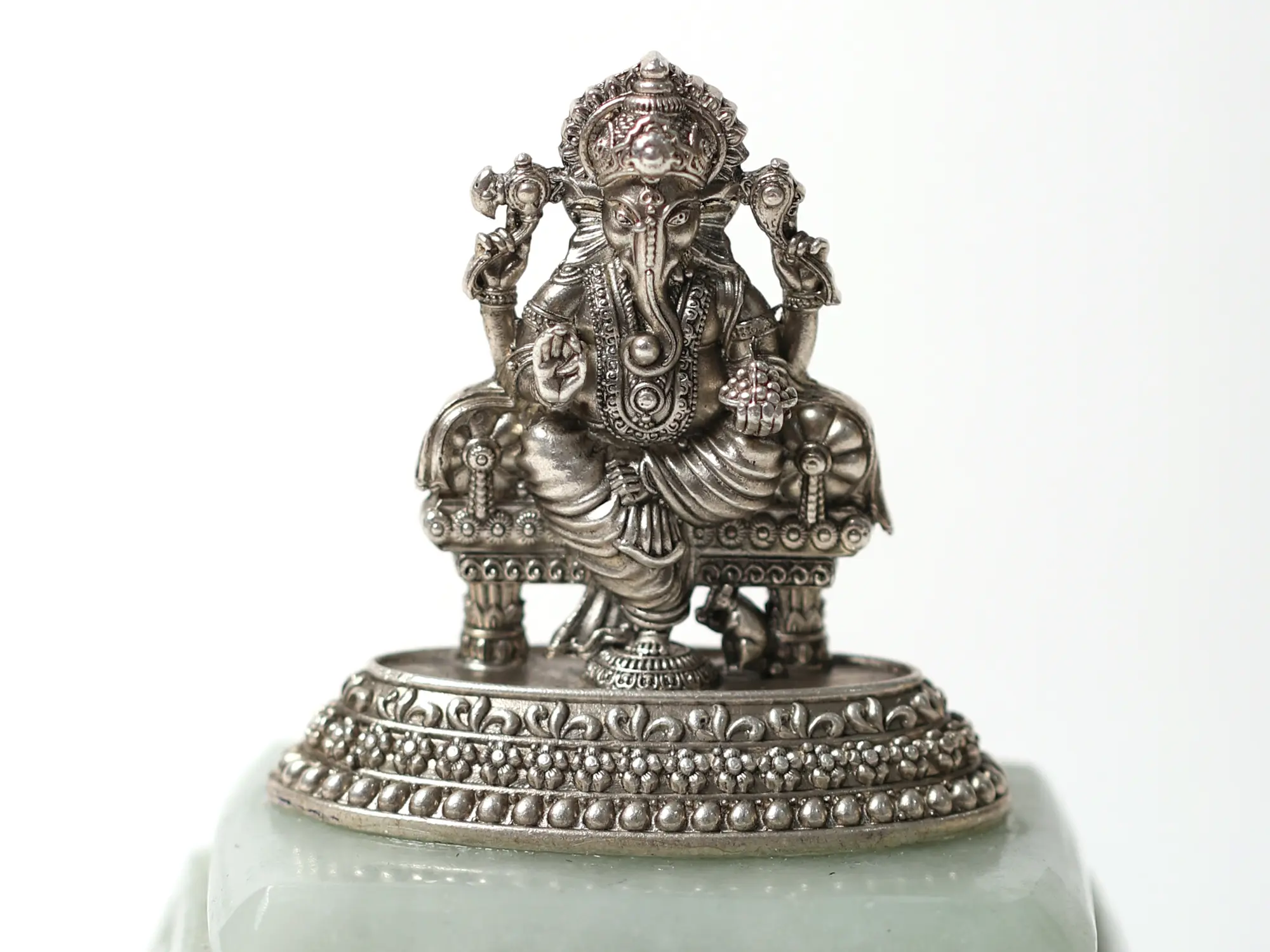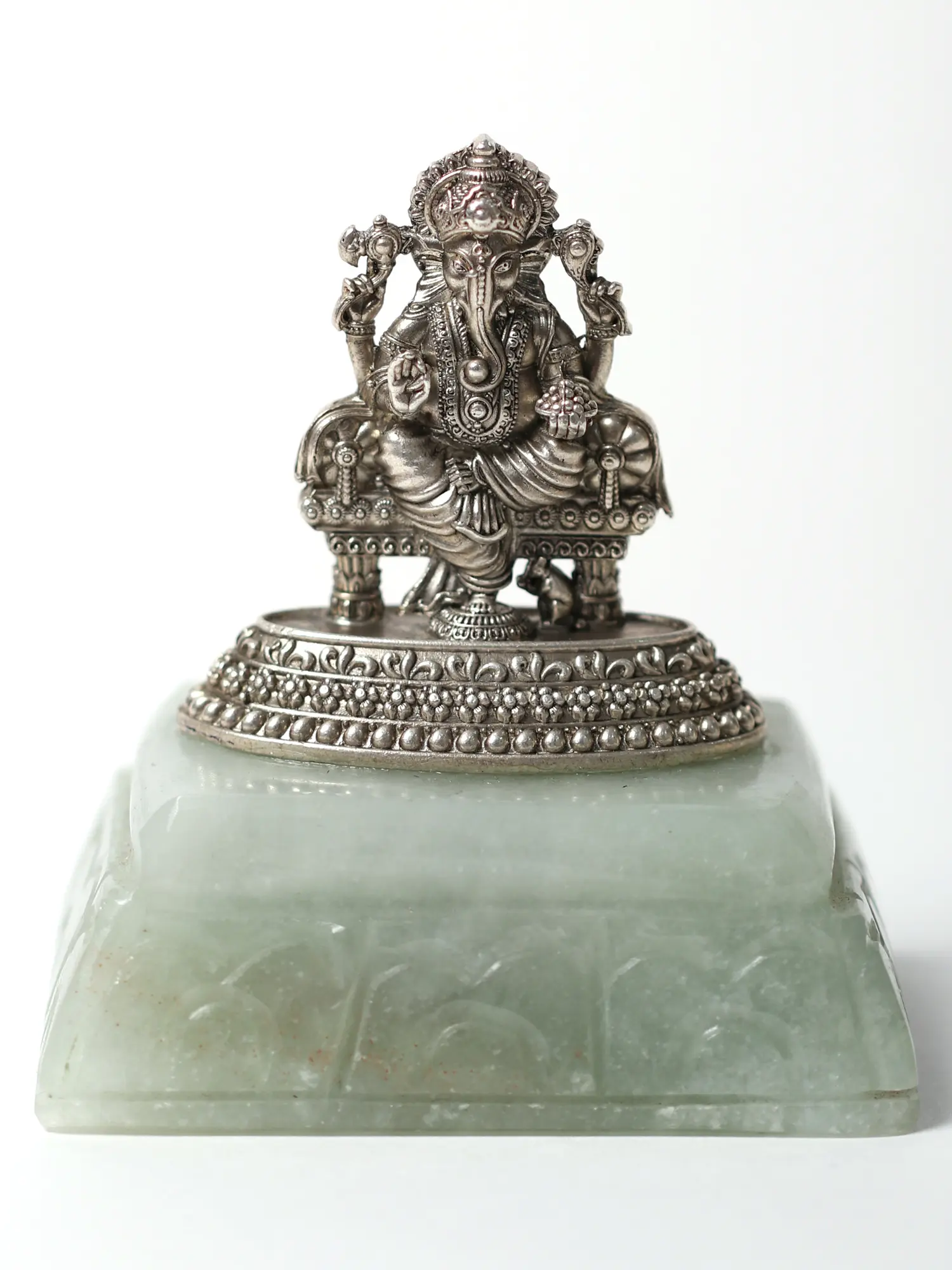 The divine bestower of Shubha (auspiciousness) and Laabha (beneficence) Sri Ganesha is aesthetically exalted in this handcrafted masterpiece, made with silver and aventurine, two perfect materials for the chavi of Ganapati. The dexterity and meticulousness of the artists can be seen in the icon of Ganesha, which has been sculpted and adorned masterfully, inspiring awe and reverence for the artist and the art. The seat of Ganesha in this statue is crafted with the elegant aventurine which is associated with luxury, richness, and confidence in life, virtues that the elephant-faced Lord showers upon his devotees, in this most sacred roopa.